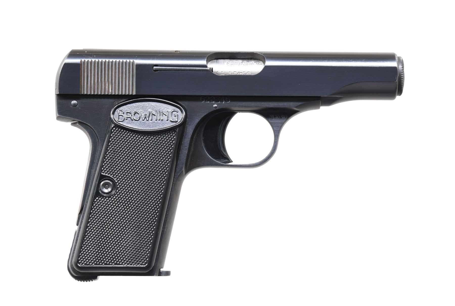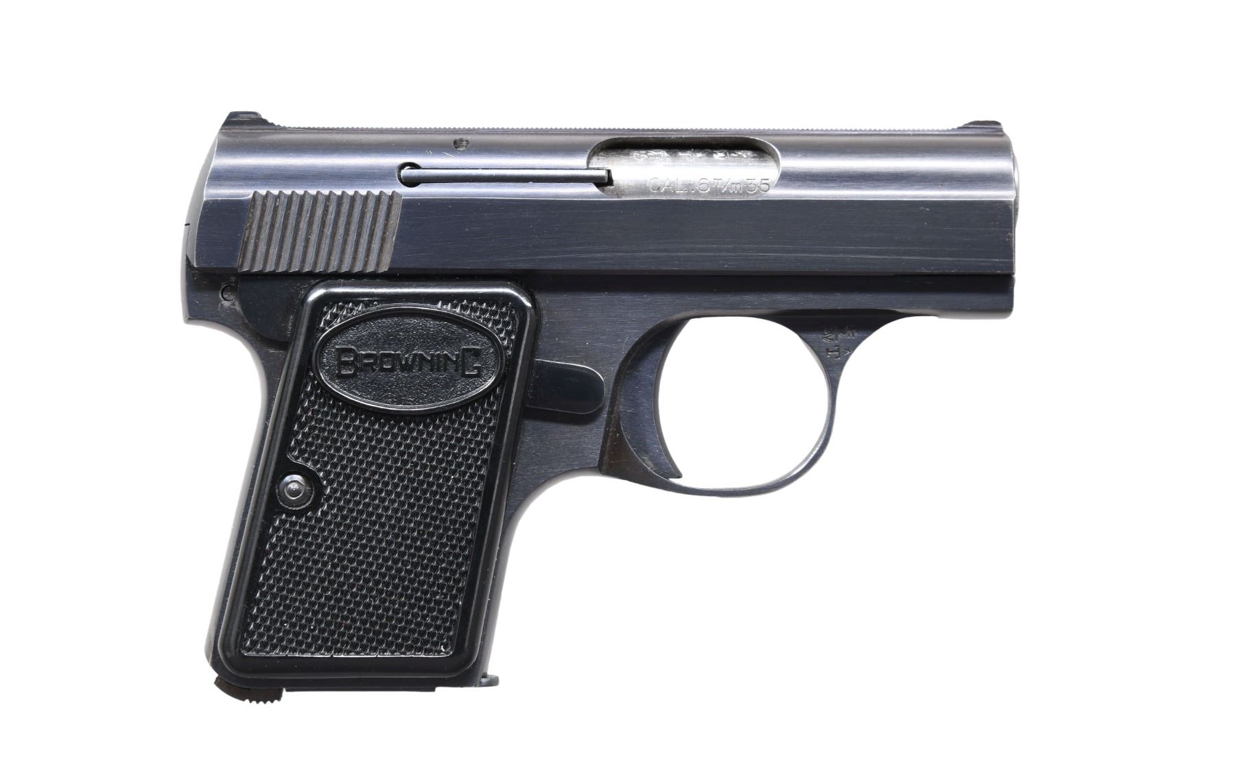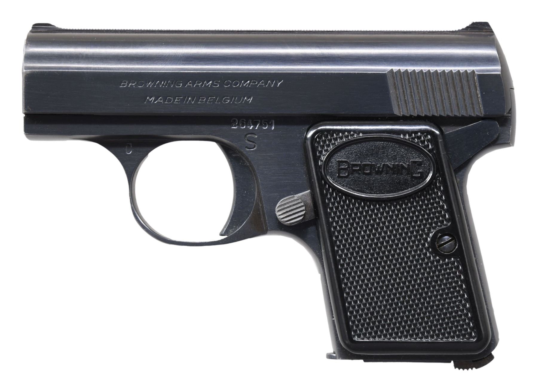 GUN 3: Model. Baby. Cal. 25 ACP. S# 264751. Bbl. 2". Blued finish. Checkered black plastic grips. MAGS: 1 detachable 6 rd. CONDITION: near excellent, retaining over 98% finish. Bright near excellent bore. (25-922/DS).