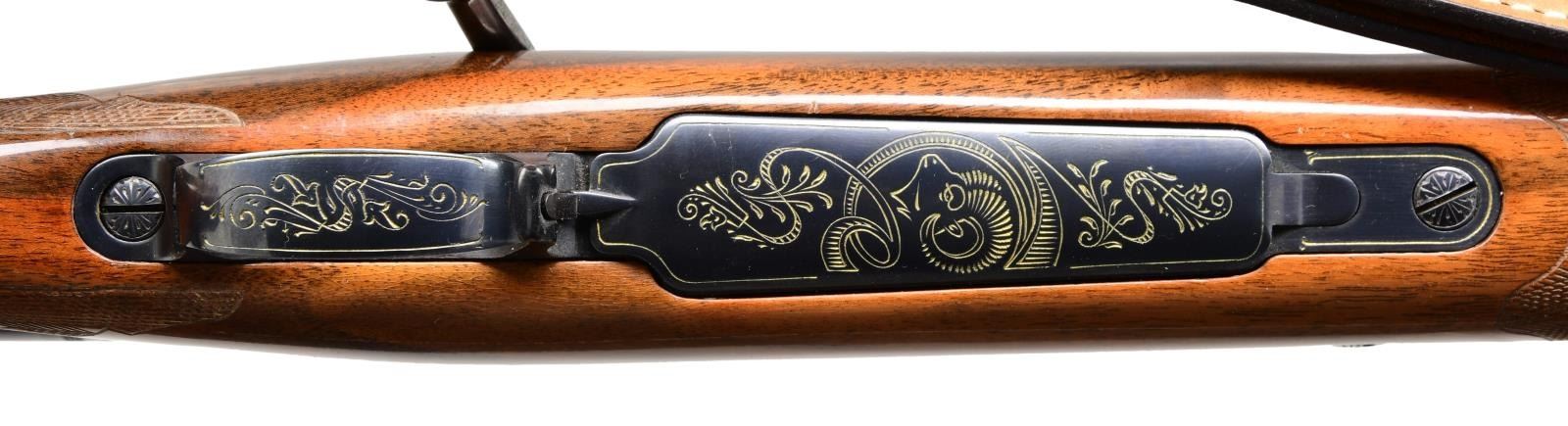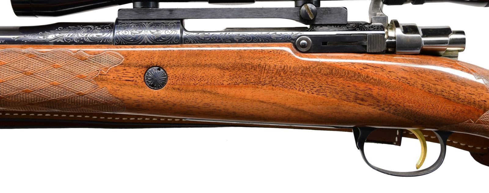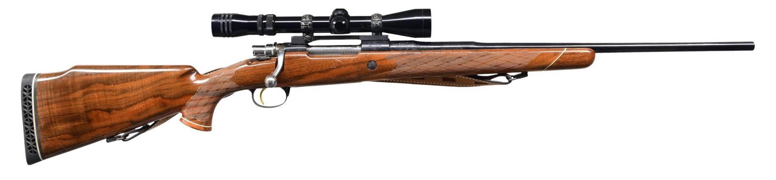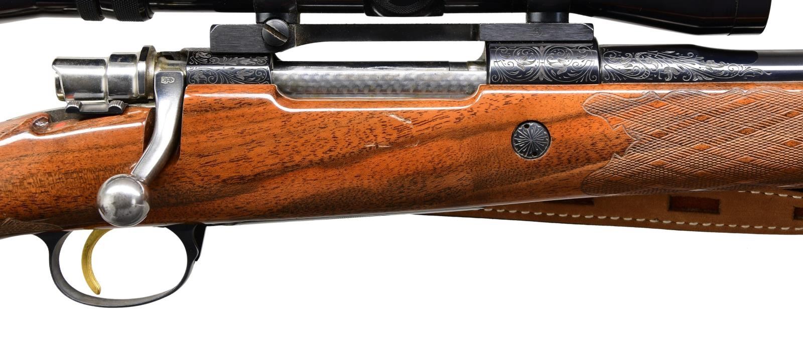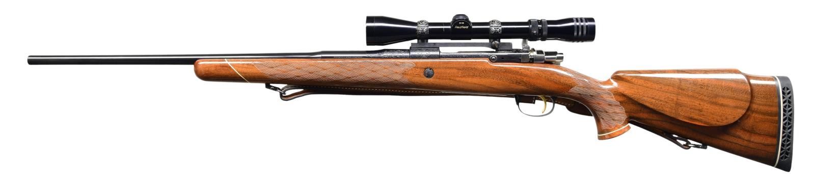 RIFLE. Cal. 30-06. S# 8X48519. Bbl. 22" sightless medium sporter white. M98 Supreme long extractor action. Action, floorplate, trigger guard and breech end of bbl. have foliate scroll engraving. Floorplate features a ram's head. Jeweled extractor. Gold finished single stage trigger. Right side safety. Redfield 3-9X40 Widefield gloss finished scope with duplex reticle. Redfield one piece base and engraved rings. Monte Carlo cheekpiece stock of fancy claro walnut. Features include contrasting forearm tip and grip cap with white line spacers and French skip line checkering. LOP: altered to 14 1/4" over an aftermarket White Line pad. Added leather sling on QD swivels. Weight with scope: 9 lbs 4.8 oz. Mfg. 1968, in Belgium. CONDITION: metal retains over 98% original finish. Original stock shows age related crazing with scattered scratches and marks. Bright near excellent bore. Scope has clear optics. (24-1845/DS). CURIO. $2,000-3,000.