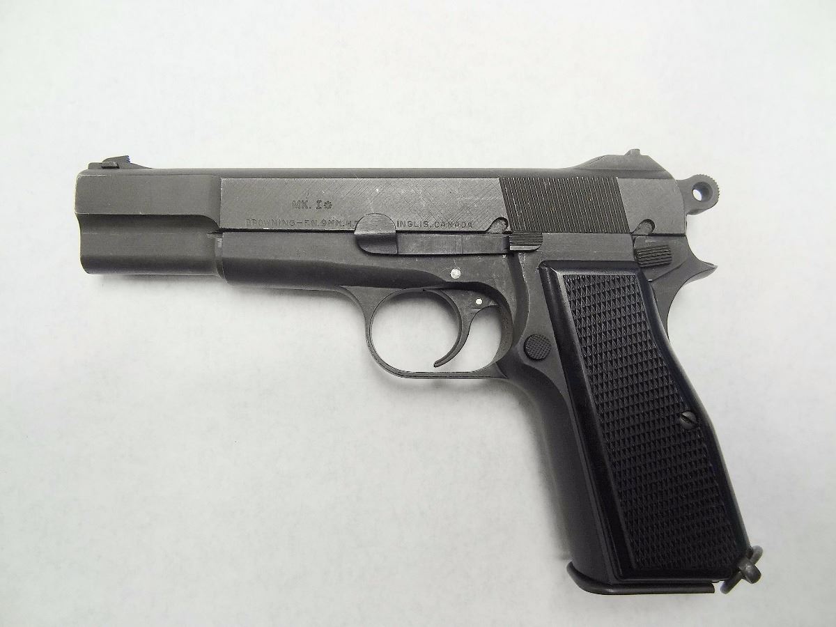 STOCK D-8, BROWNING (INGLIS) MKI* 9MM, 4.5” BARREL. CANADIAN MADE.MINOR SCRATCHES & WEAR, BLACK FINISH, PISTOL IN VERY GOOD CONDITION 7.5/10. S/N:2T6XXX