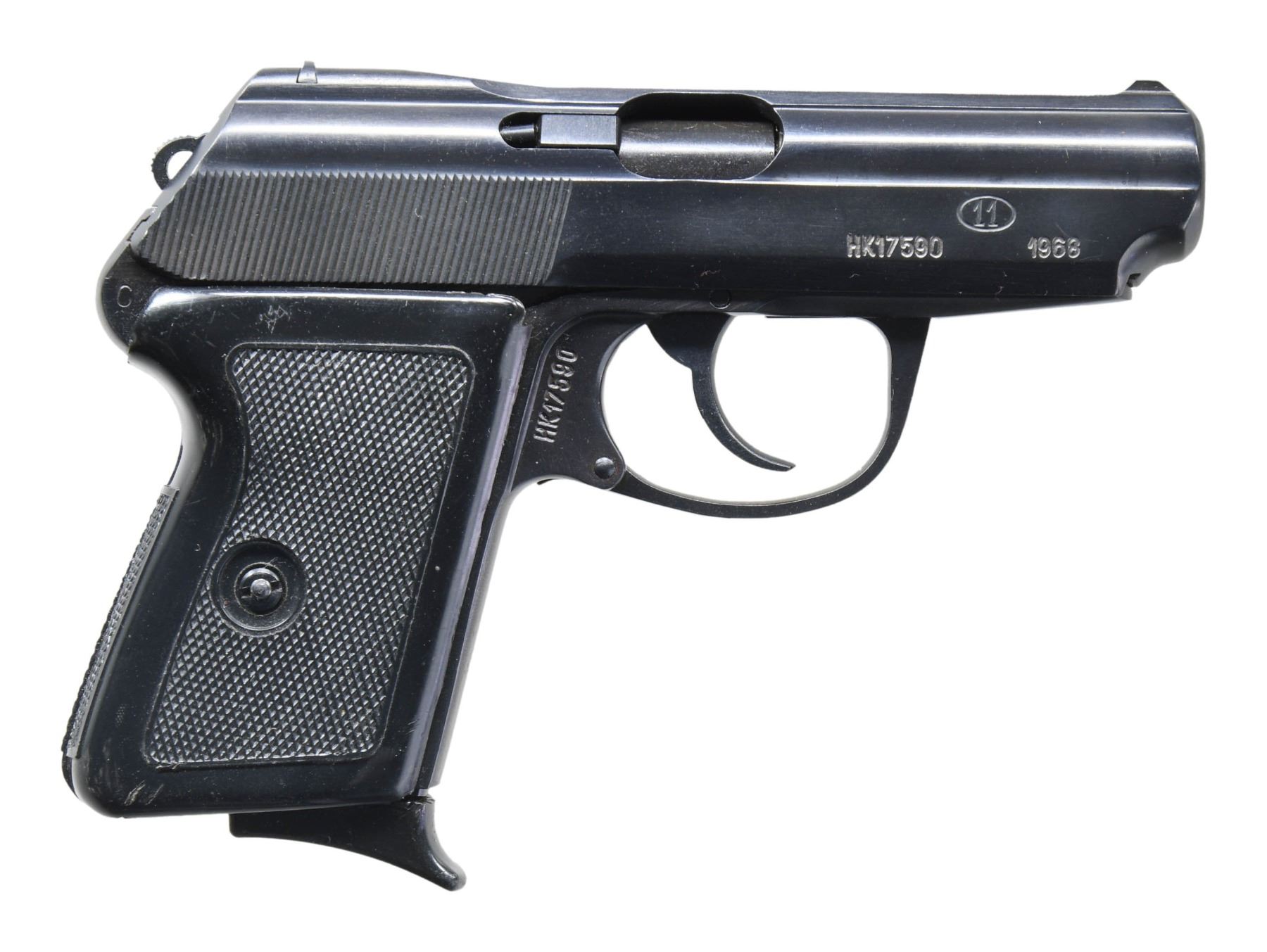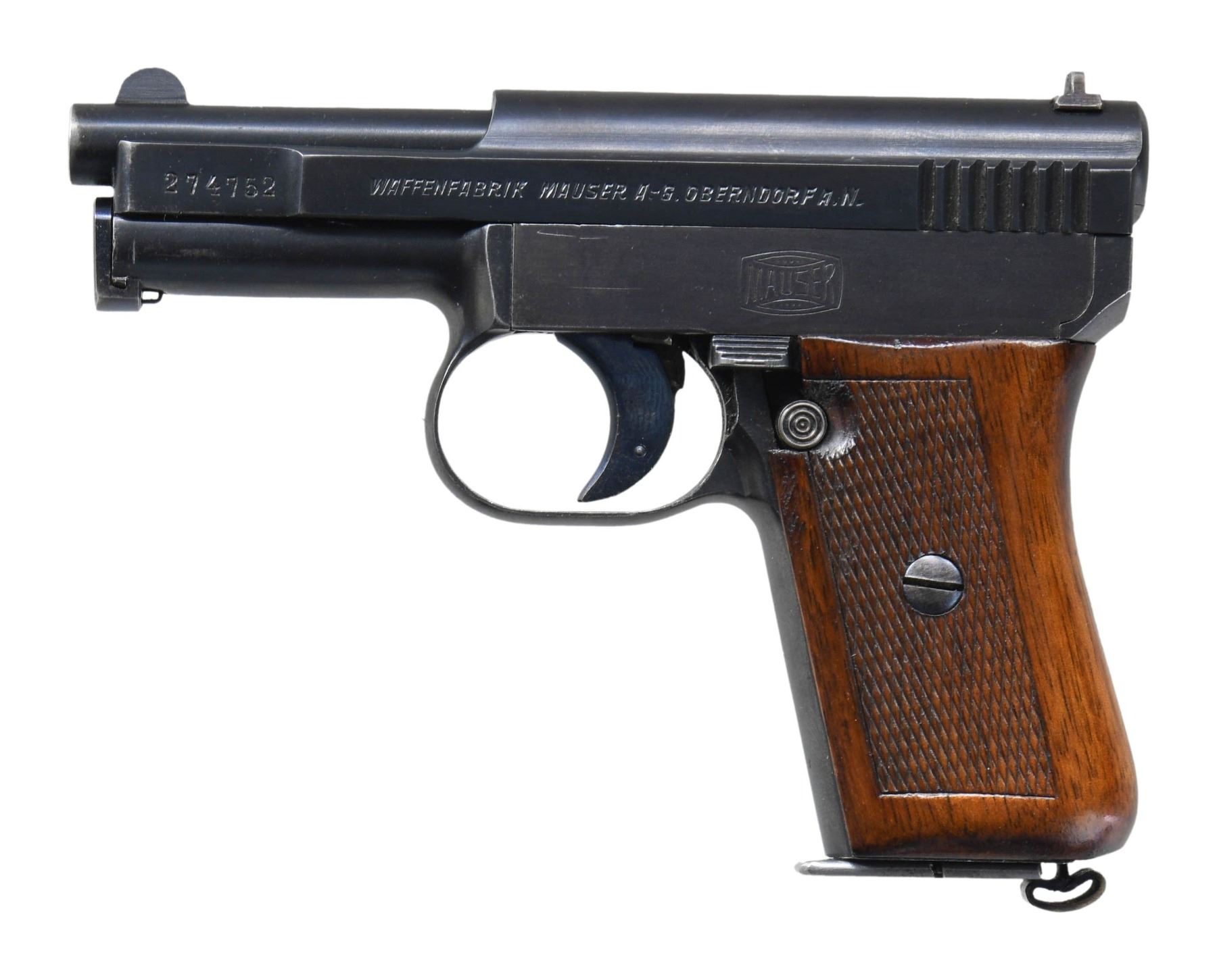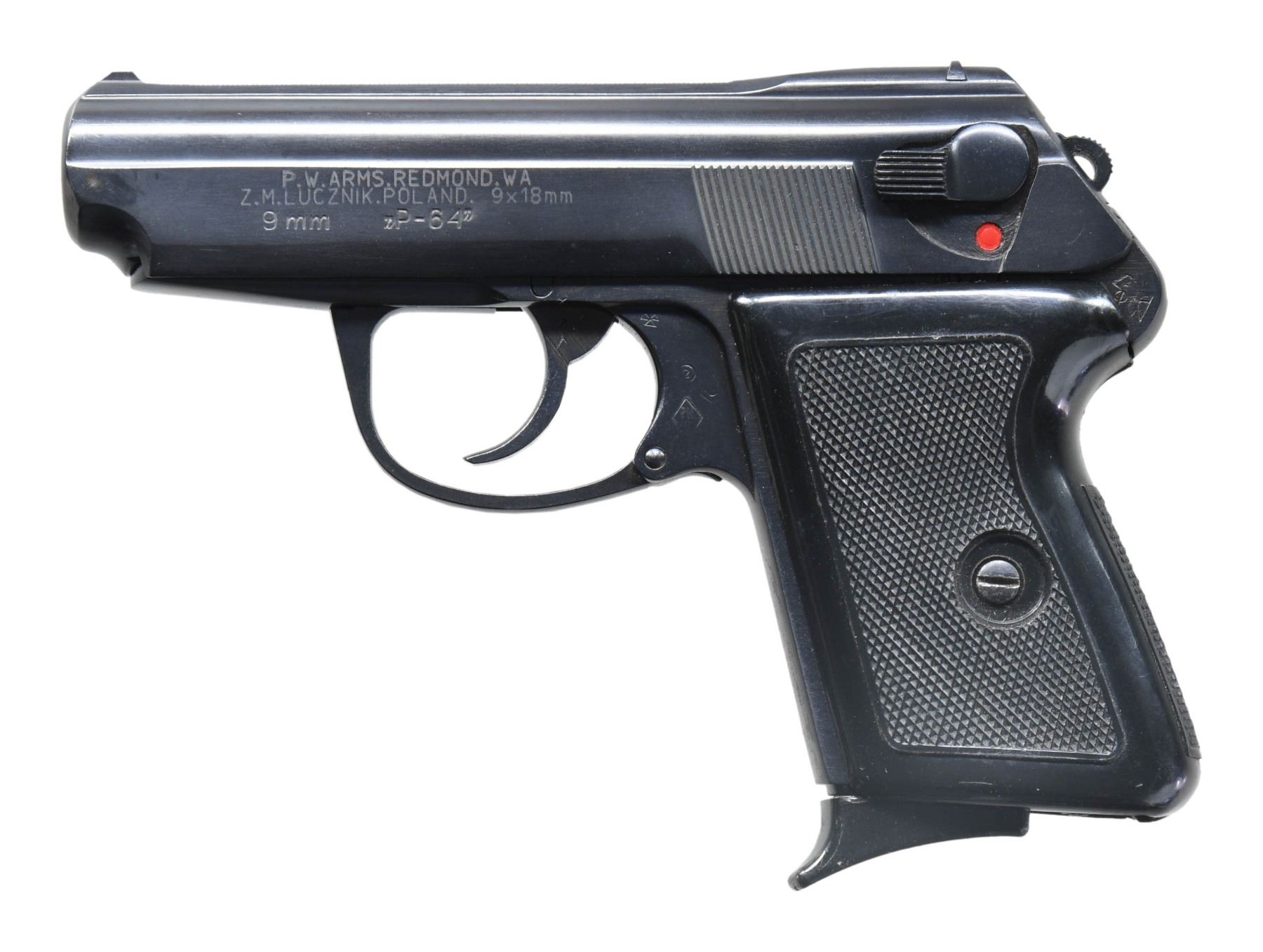 1) BELGIAN BROWING MODEL 1910. Cal. 380 ACP. S# 595034. Bbl. 3 7/16". Model 1910 (likely a Model 1910/55) semi-automatic pistol mfg. in Belgium by Fabrique Nationale and imported by Browning Arms Company. Left side of the slide is marked "BROWNING ARMS COMPANY ST LOUIS Mo & MONTREAL P.Q." above "MADE IN BELGIUM". Slide legend is weak, as is standard on later production Model 1910s. Right side of forward trigger guard web and bbl. are marked with Belgian proofs. Bbl. is marked "CAL.9m/m OO" beneath the proofs. Metal components exhibit a blue finish overall, save for on the bbl., which is polished in-the-white. Frame is mounted with 2-piece smooth wood aftermarket grips. Slide features a concave matte rib, with an integral blade front sight and U-notch rear sight. All serialized parts are matching and include the frame, slide, and bbl. MAGS: 1 blued 6-rd. mag. with 5 transverse indicator holes. CONDITION: metal components retain the vast majority of their original factory blue, exhibiting some spots of light edge wear and few superficial handling marks overall. Brilliant mirror bore, retaining well defined rifling throughout. Proper manual mechanics. Grips are very good overall. (25-4648/MLW). 2) FINE PORTUGUESE CONTRACT MAUSER MODEL 1910. Cal. 6.35mm. S# 274752. Bbl. 3 1/16". Model 1910 semi-automatic pistol mfg. by Mauser under contract for Portugal. Left side of the slide is marked with the S# followed by Mauser's mfg. information, with "Mauser-6,35" in script marked on the right. Metal components exhibit a rust blue finish, with the trigger, extractor, takedown rod, and heel mag. release lever exhibiting a nitre blue finish. Frame is mounted with a 1-piece flat checkered wood wrap around grip, stamped "MADE IN/ GERMANY" on the rear. Integral half-moon blade front sight with dovetailed V-notch rear sight. All serialized parts are matching and include the frame, sideplate, slide, and bbl. MAGS: 1 cleaned in-the-white 9-rd. CONDITION: metal components retain the vast majority of their original factory blue finishes, showing some spots of light edge wear, a few small spots of light wear, some superficial handling marks, and a few spots of freckling. Bore is bright, exhibiting what appears to be spots of hardened grease and possibly some light pitting, while retaining well defined rifling throughout. Proper manual mechanics. Grip shows a few superficial marks and minor impressions with a small crack present on the right rear edge. (25-4675/MLW). CURIO. $200-400. 3) POLISH P64. Cal. 9x18 Mak. S# HK17590. Bbl. 3 1/4".Blade front sight. Square notch rear sight. Matching numbers on slide & frame. Slide has circle "11" Radom marking & 1968 date. Left side of slide has PW Arms import marking. Arsenal rework blue finish. Checkered black grips. MAGS: 1-7 rd. CONDITION: grips show some dings & handling marks. Metal retains 95% arsenal rework blue with some edge & grip strap wear. Action functions properly when hand cycled. Very good bright bore. (25-4703/MJC). ALL CURIO. $700-1,100.
