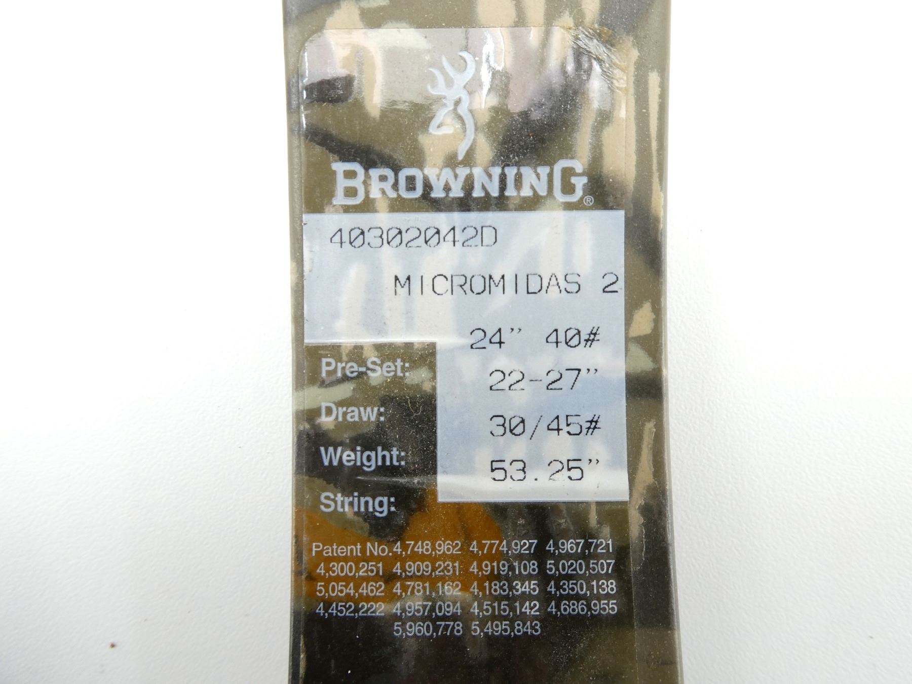 LOT INCLUDES; (1) BROWNING MICRO MIDAS 2 COMPOUND BOW, APPROX. DRAW LENGTH 22-27", DRAW WEIGHT 30/45 LBS, STRING LENGTH 53 1/4", (3) PIN SIGHTS, (1) (4) ARROW QUIVER, APPROX. OVERALL LENGTH 34", SHOWS WEAR AND TEAR FROM USAGE, SEE PHOTOS.