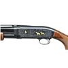 Cal. 28 ga. 2 3/4". S#. 000761NM972. Style No. 5 ornamentation. Right side marsh scene has 4 gold plated mallards. Left side woodland scene features 2 gold dogs and a flushing partridge. Scenes are surrounded by foliate scroll. Bbl. 26" with round post vent rib and fixed Mod choke. Steel bead. Forend & steel capped pistol grip stock of gloss finished fancy walnut and original buttplate. Cut checkering, with 3 diamond pattern on forend. Limited edition of 5000 mfg. in Japan 1991-1992. UNATTACHED ACCESSORIES: Original foam lined black box has matching label. Box contains Owners manual and Browning knives brochure. CONDITION: As new with box. (22-2717/DS). MODERN. $2000-2900.