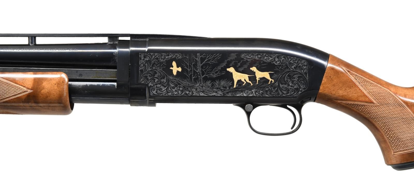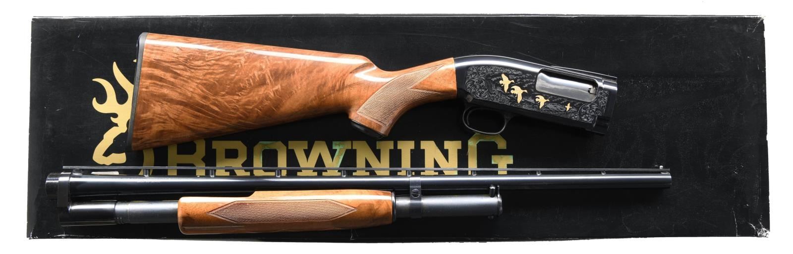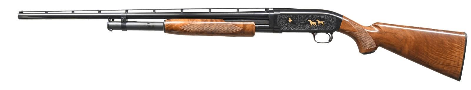 Cal. 28 ga. 2 3/4". S# 00693NM972. Bbl. 26" vent rib. Fixed Mod choke. Blue finish. Style 5 ornamentation with a scroll surrounding scenes of gold-plated mallards on the right side. Left side has two gold-plated pointers and a flushing partridge. Beavertail forend & steel-capped pistol grip stock of gloss-finished fancy walnut have cut checkering. Limited edition of 5,000 mfg. 1991-1992. UNATTACHED ACCESORIES: Original box with owner's manual & knife brochure. CONDITION: Near-excellent retention, over 99% finish. Bright, near-excellent bore. (23-1340/DS). MODERN. $1,200-1,800.