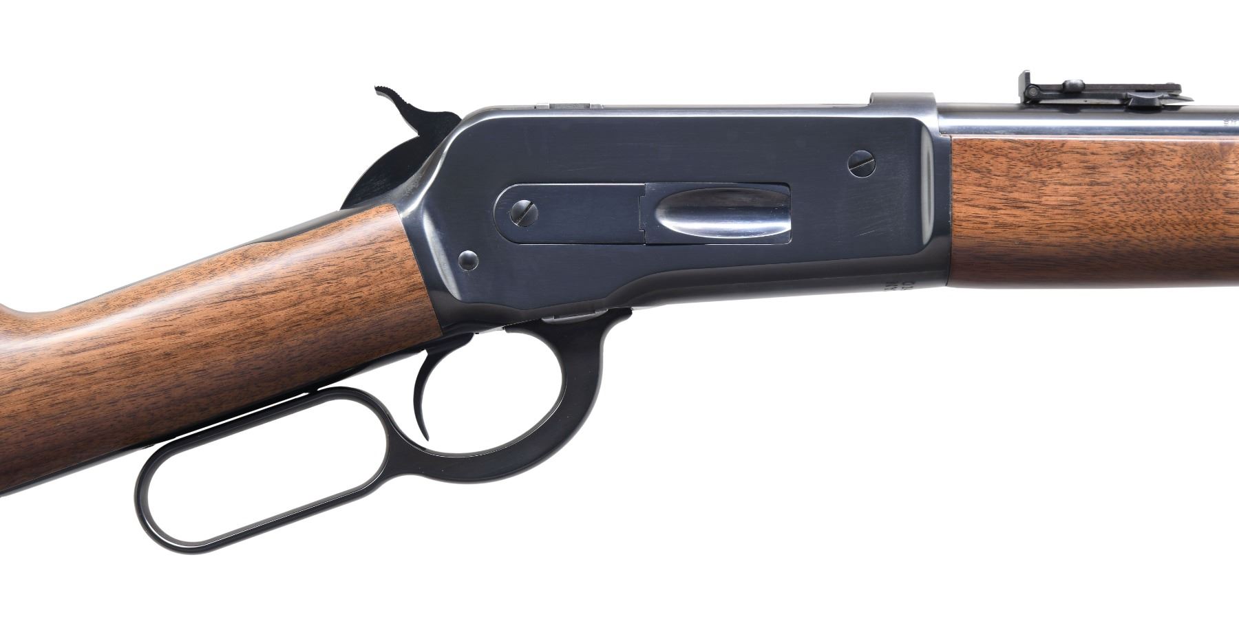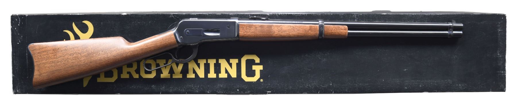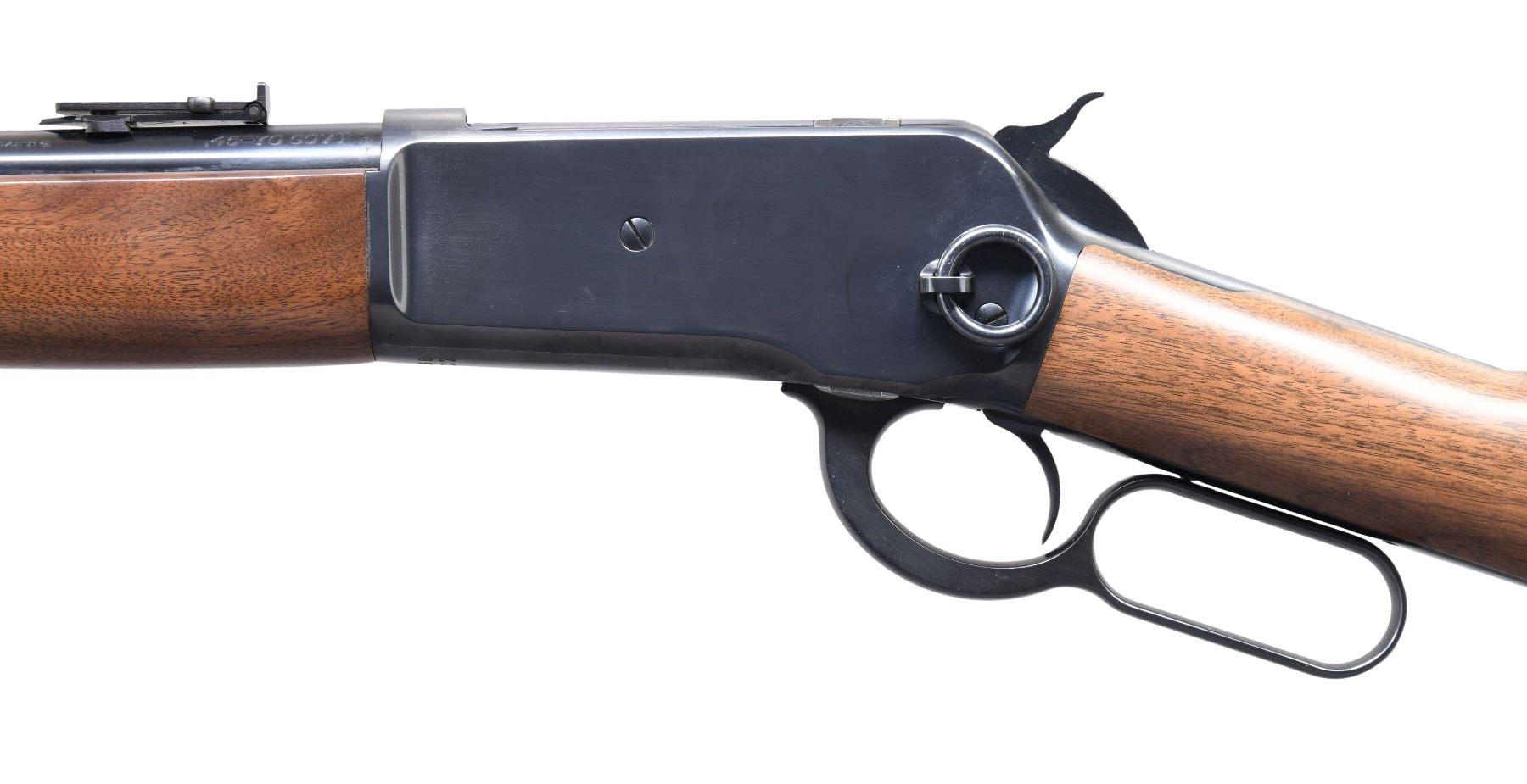 Cal. 45-70. S# 01436NY1C7. Bbl. 22" round. Pinned blade front sight w/ carbine leaf rear sight. Full length mag. Action has saddle ring on left side. Blue finish. Satin finished band fastened forearm w/ straight grip stock & steel carbine buttplate. Limited edition of 7,000 mfg. 1992-93. UNATTACHED ACCESSORIES: original foam-lined box containing owner's manual. CONDITION: as new in box. (24-6321/DS). MODERN. $1,500-2,000.