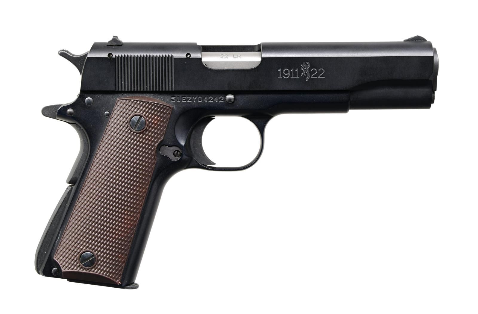 Cal. 22 LR. S# 51EZY04242. Bbl. 4 1/4". GI style sights. 1911A1 style rimfire pistol. Matte black finish. Checkered light brown grips. MAGS: 1-10 rd. CONDITION: grips show light handling wear. Metal retains 98% matte black w/ slide stop reassembly scratch on left side of frame & some handling marks. Bright near excellent bore. (24-1683/MJC). MODERN. $300-400.