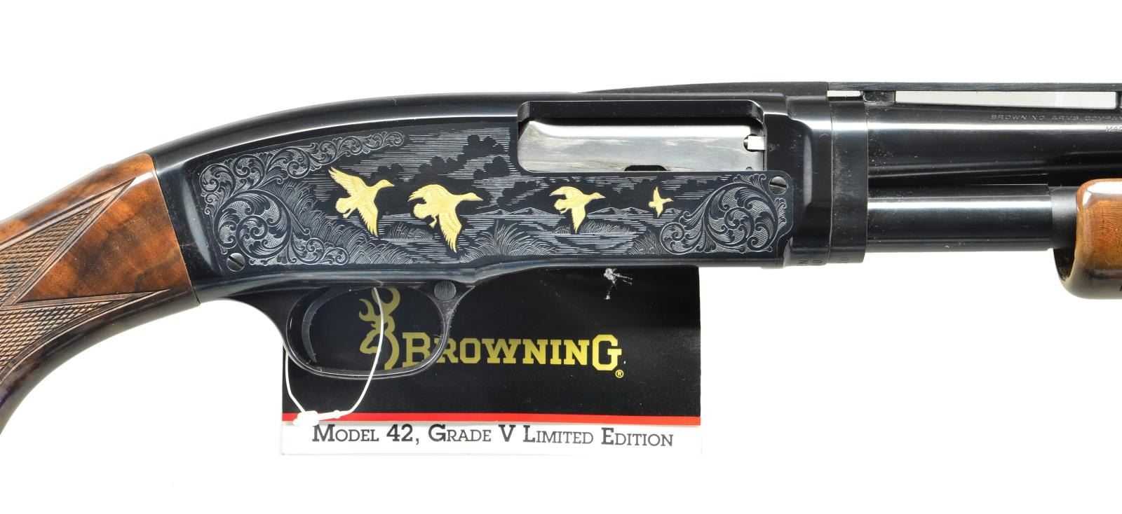 Cal. 410 3" S# 00761NZ982. Bbl. 26" with round post vent rib and fixed Full choke. Action has style 5 ornamentation. Right scene features 4 gold mallards. Left scene has 2 pointing dogs and a flushing partridge. Scenes are surrounded by foliate scroll with cross hatch backgrounds. Beavertail forend and steel capped pistol grip stock of gloss finished fancy walnut have 3 diamond style cut checkering and original buttplate. Limited edition of 6000 mfg. in Japan 1991-1993. UNATTACHED ACCESSORIES: Origianl foam lined black box. Showing some water damage. Box contains owners manual. CONDITION: Near new. Receiver still has bbl. attachment sticker, hang tag is still attached. (22-2718/DS). MODERN. $2000-2750.