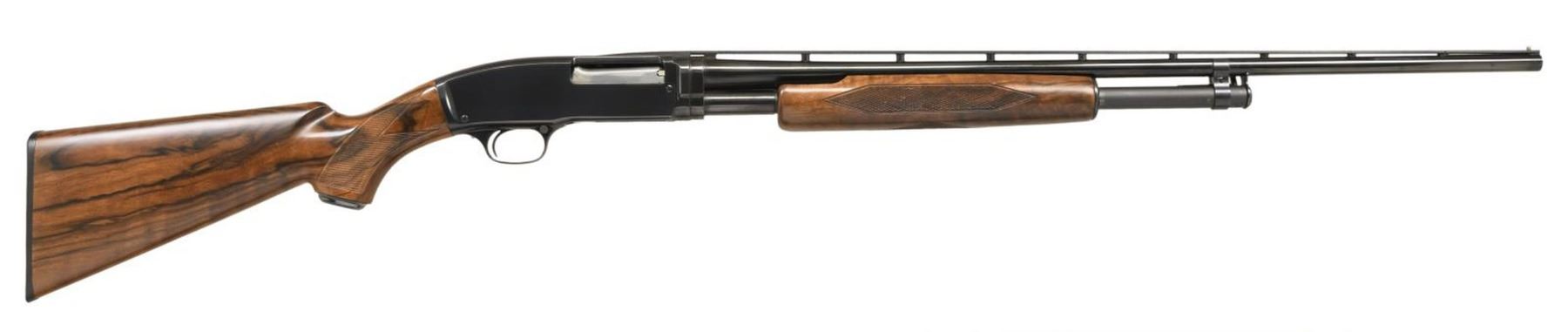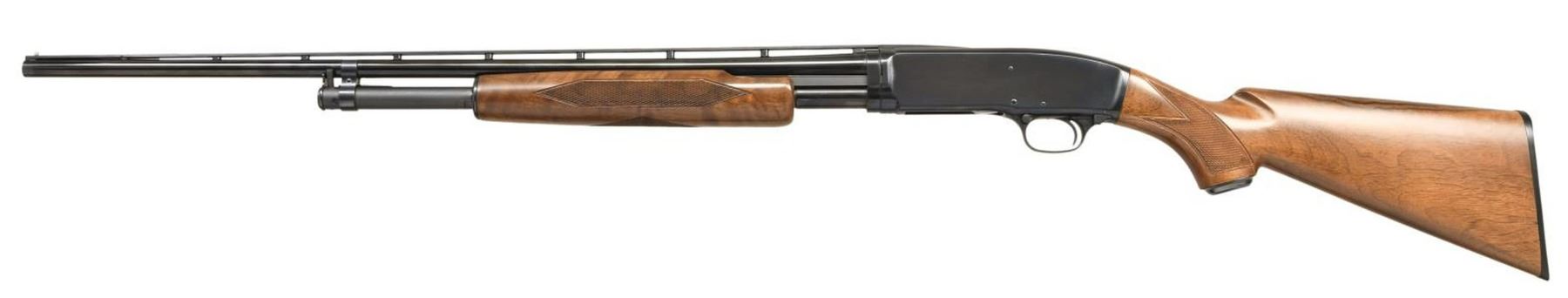 Cal. 410 GA, 2 1/2" or 3". S# 06408NZ882. Bbl. 26". Model 42 pump action shotgun mfg. in Japan and imported by Browning Arms Company. The left side of the bbl. is marked with the model and cal. designations, with Browning's importer information above "MADE IN JAPAN" marked on the right. Metal components exhibit a blued finish overall. Checkered wood pistol grip buttstock and pump. V/R with aluminum bead front sight. CONDITION: metal components retain the vast majority of their original factory blue finish overall. Mirror bore. Wood furniture shows a few minute marks from handling and storage, but otherwise is very good overall. A very nice Browning Model 42 pump action shotgun. (23-5984/MLW). MODERN. $600-900.