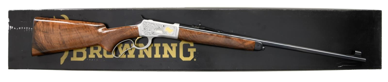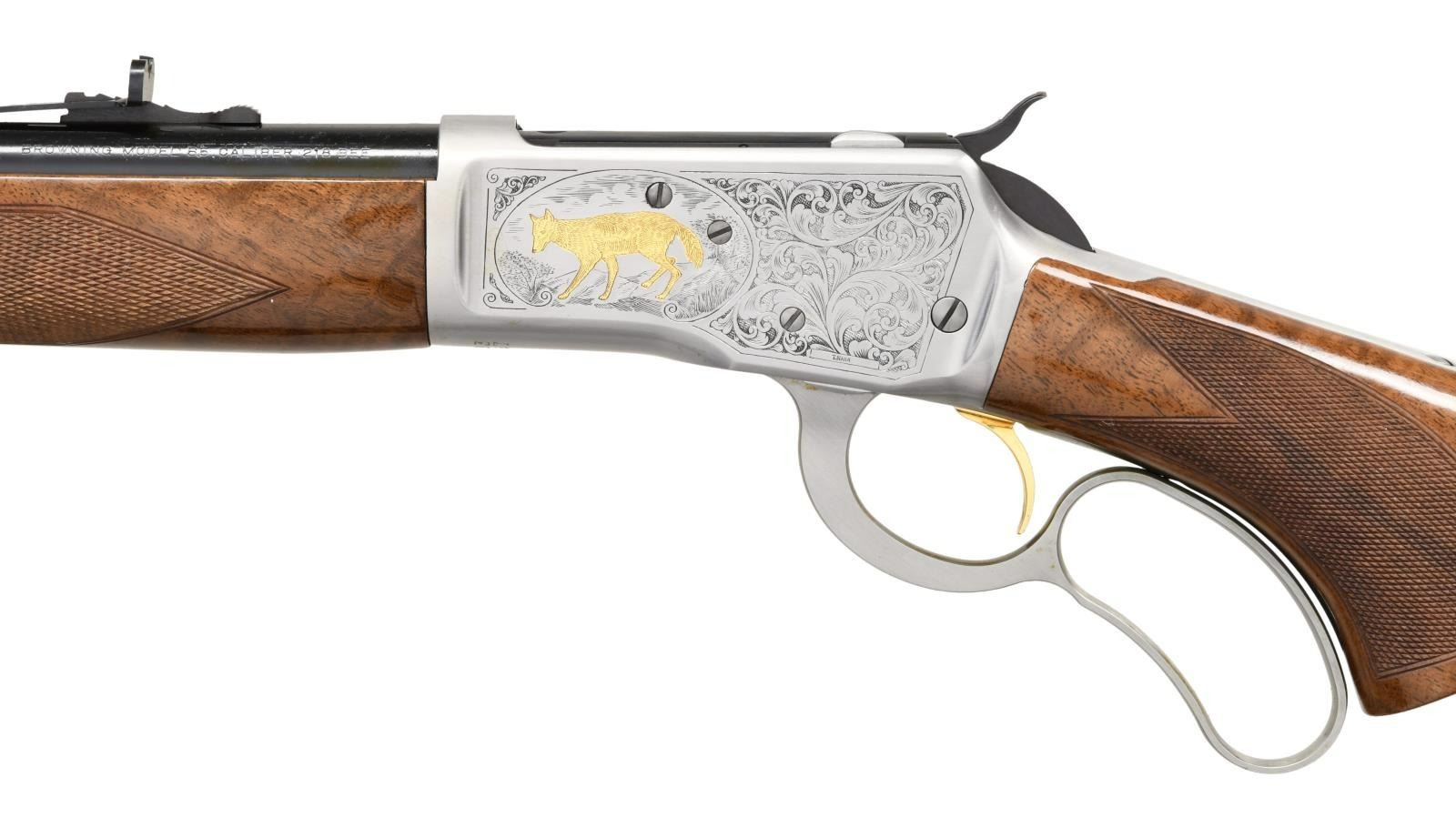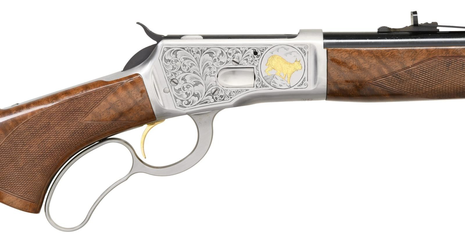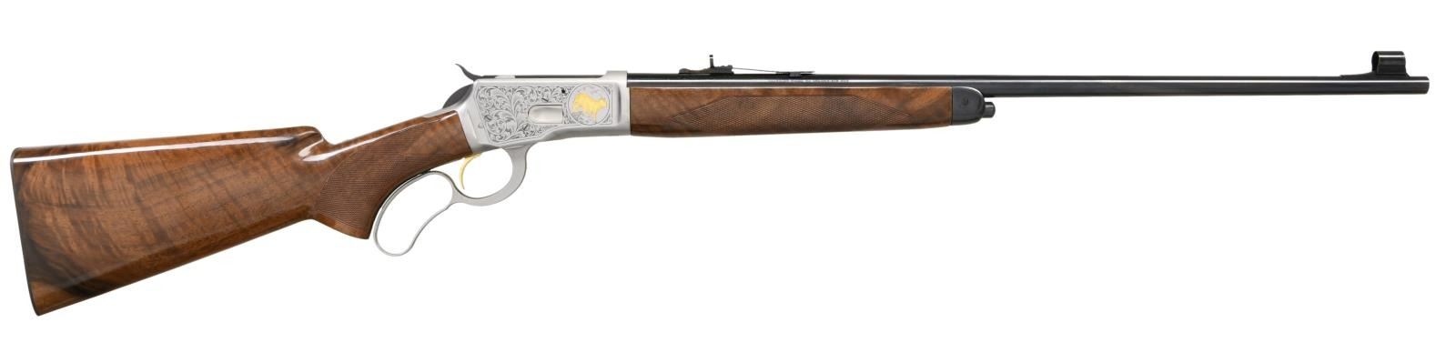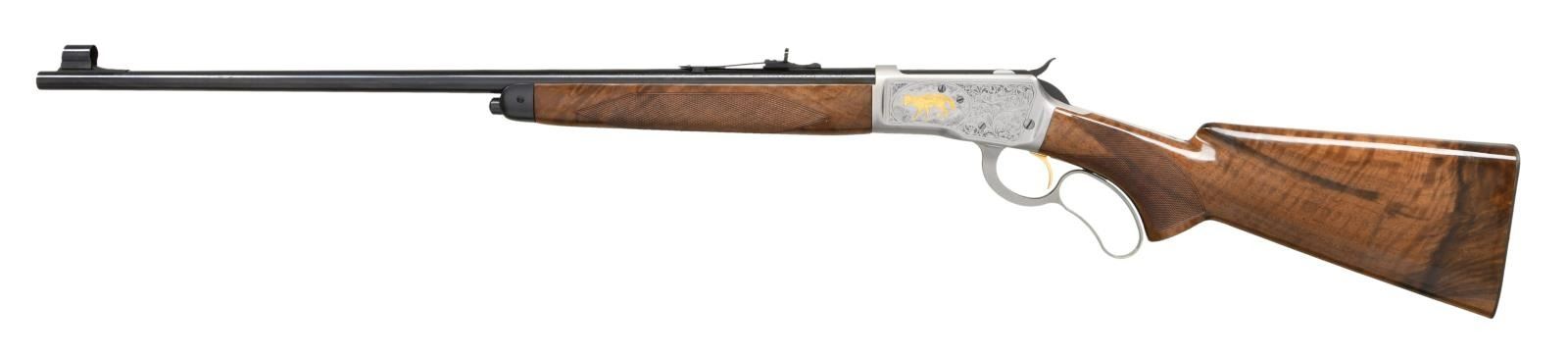 Cal. 218 Bee. S#. 00693PN667. Bbl. 24" tapered round with hooded ramp bead front and sporting rear sights. Button mag. Grey finished action has gold plated bobcat & coyote surrounded by vine type foliate ornamentation. Gold finished trigger. Semi beavertail forend and pistol grips stock of fancy walnut feature gloss finish, cut checkering and checkered steel buttplate. Limited edition of 1500 mfg. in 1989. UNATTACHED ACCESORIES: Original box. CONDITION: As new in box coated with factory grease. (23-1320/DS). MODERN. $1200-1800.