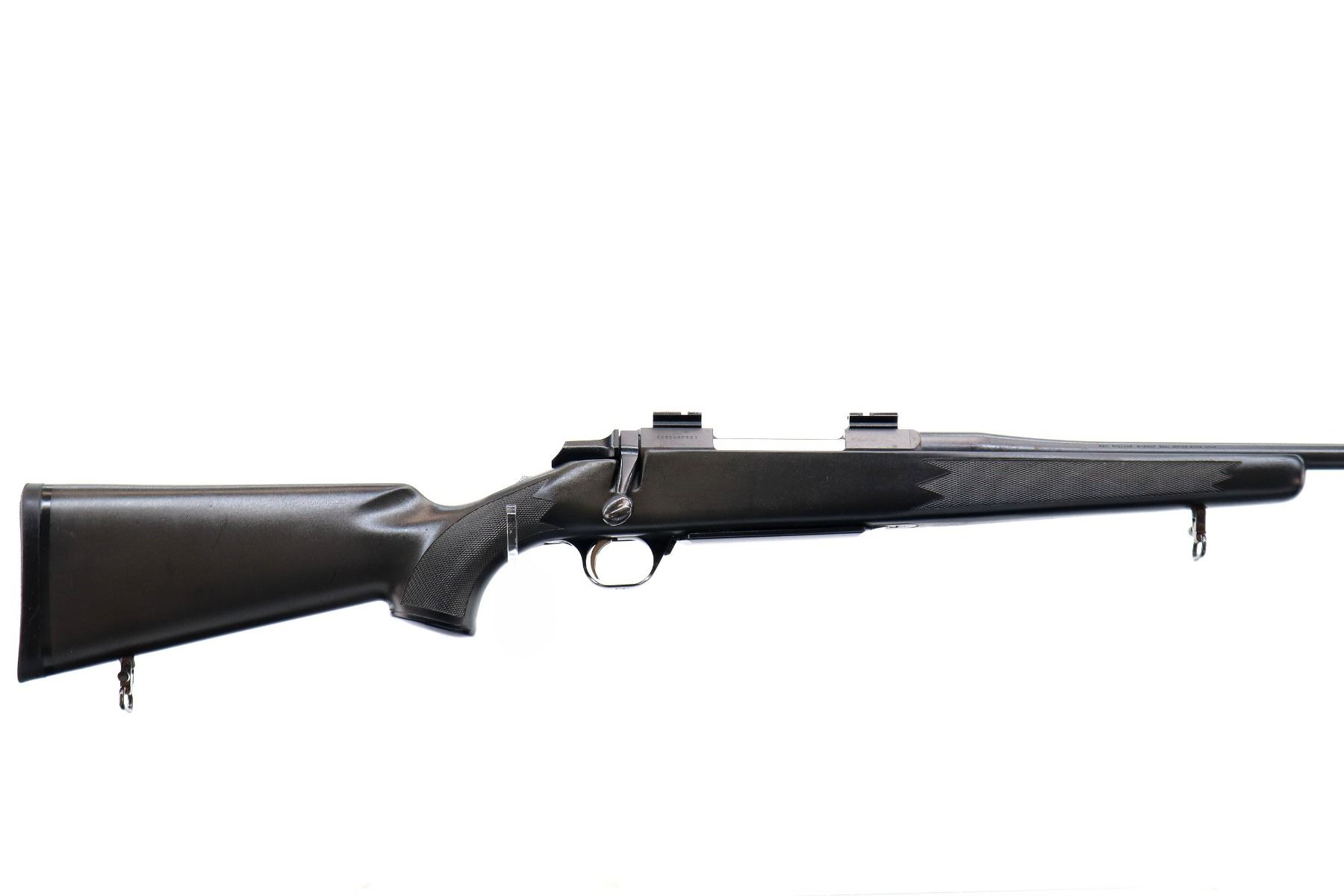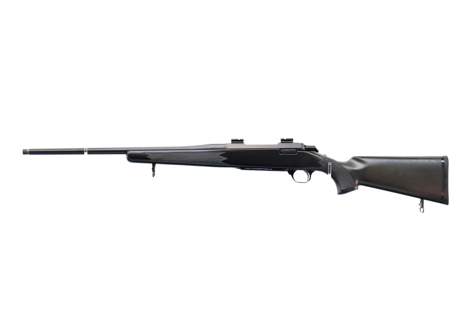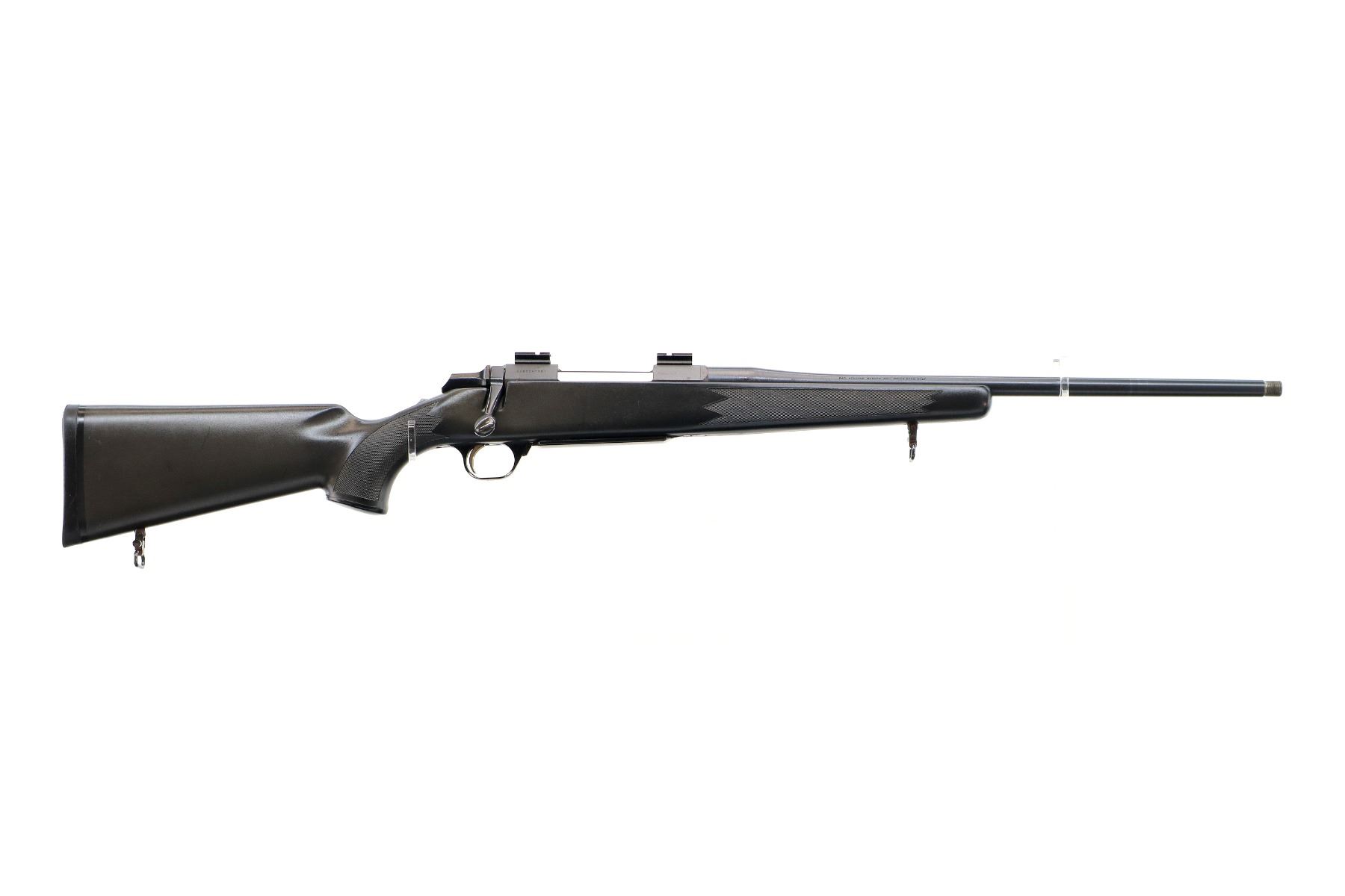 Main Description: No sights, Parkerized metal finish, barrel threaded at muzzle with no cap, receiver drilled and tapped with two piece scope bases installed, flat sided bolt knob, tang safety. One piece black synthetic stock, checkered forearm and pistol grip with right hand palm swell, black rubber recoil pad, grip cap, gold trigger, sling swivels.