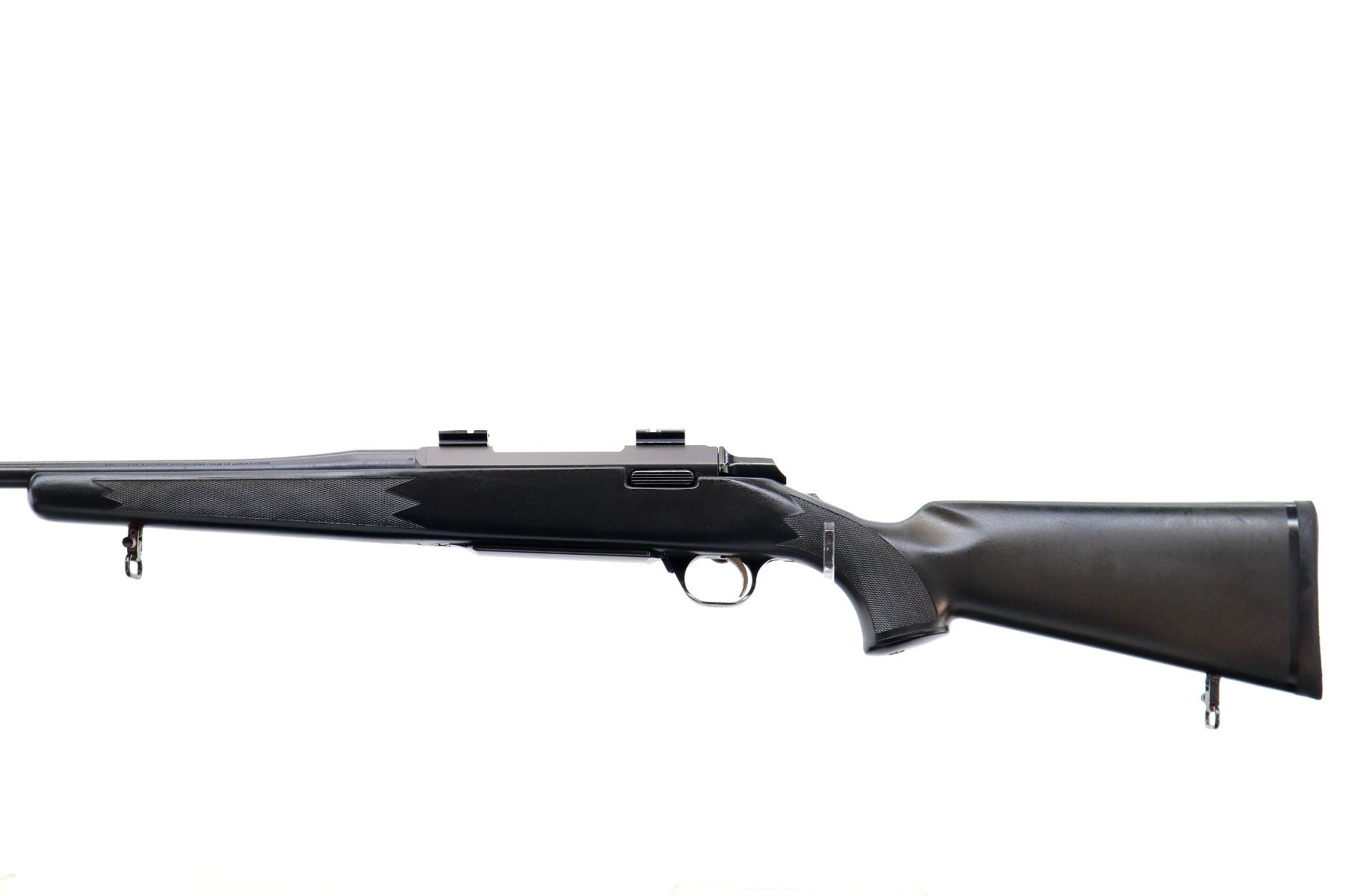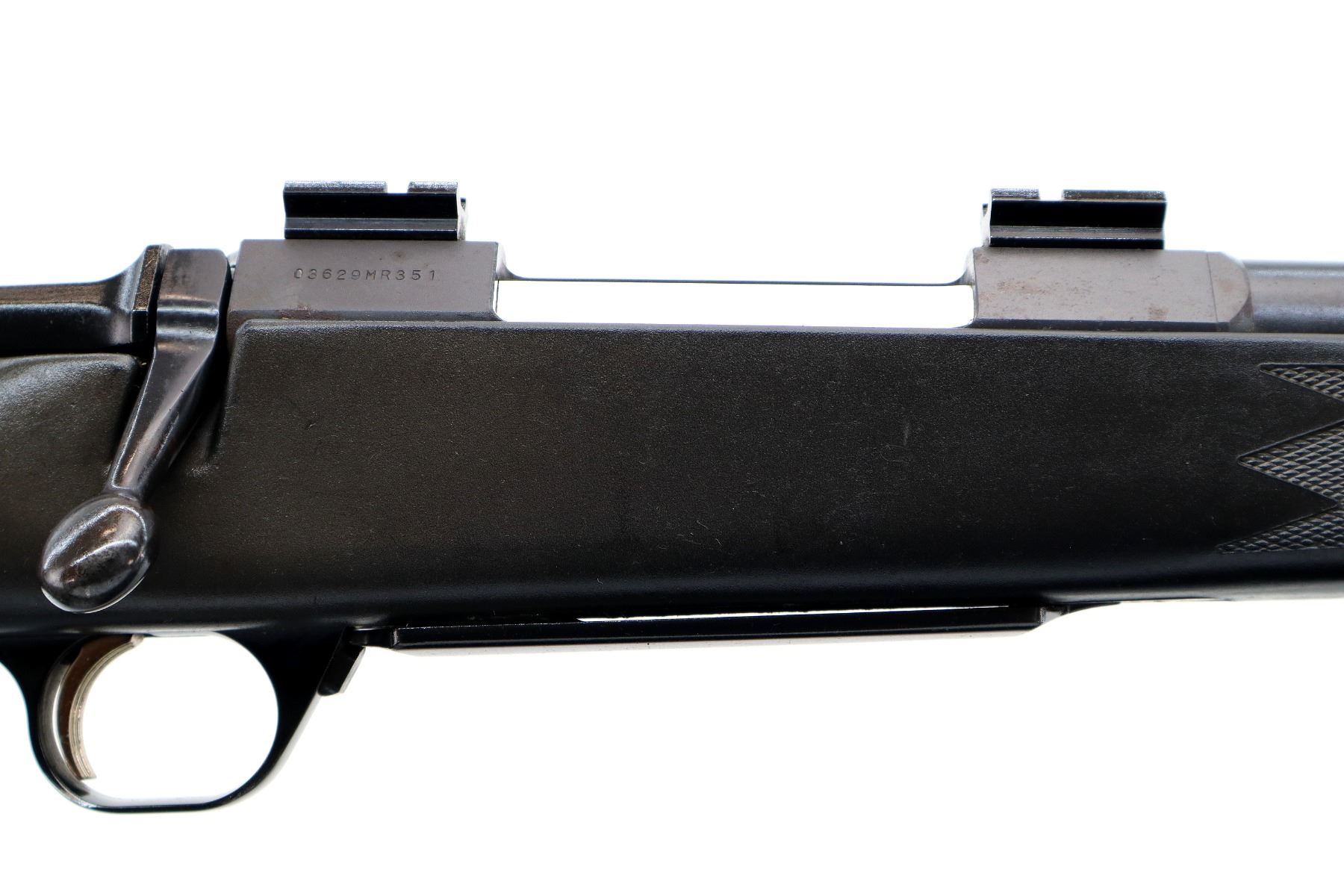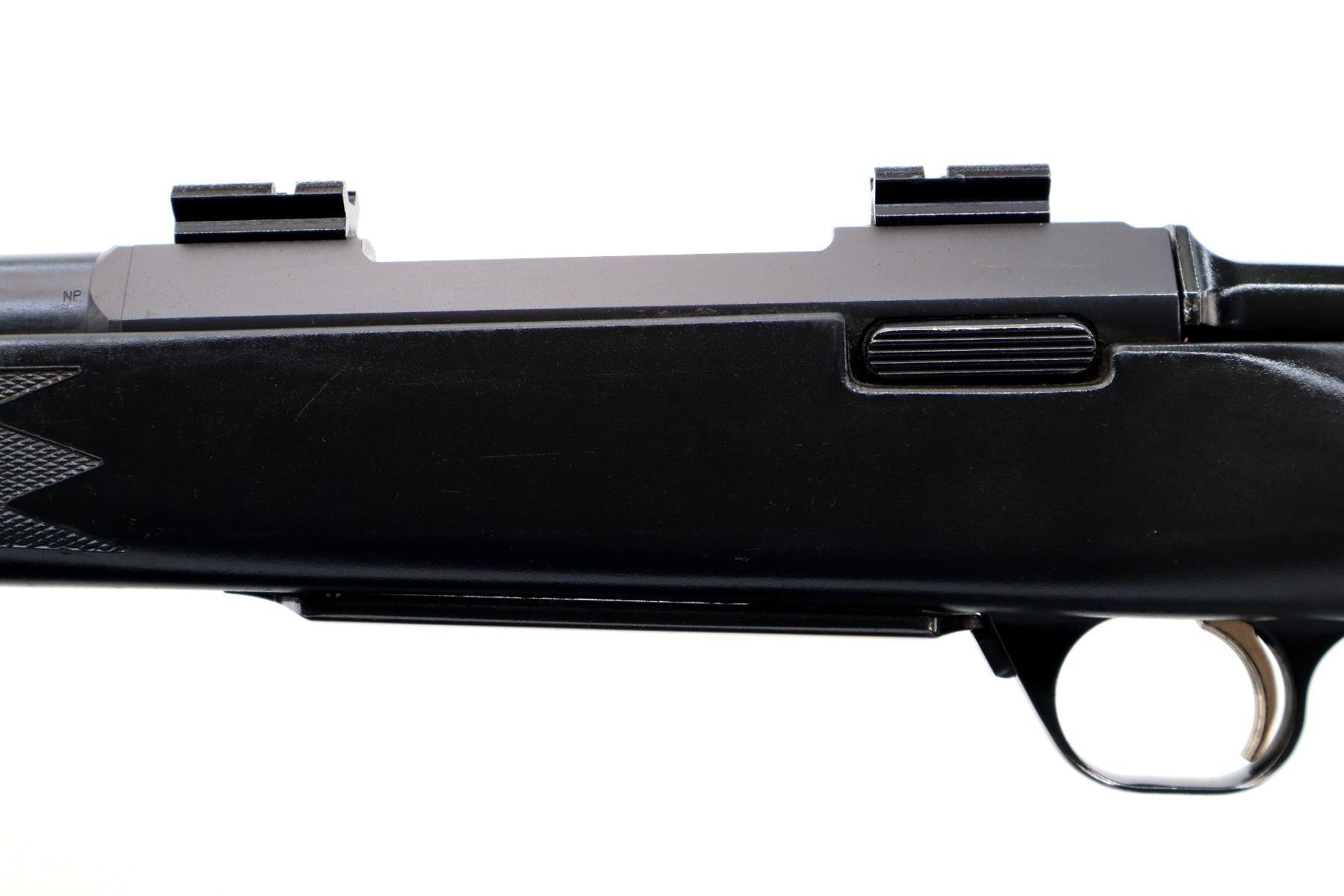 Main Description: No sights, Parkerized metal finish, barrel threaded at muzzle with no cap, receiver drilled and tapped with two piece scope bases installed, flat sided bolt knob, tang safety. One piece black synthetic stock, checkered forearm and pistol grip with right hand palm swell, black rubber recoil pad, grip cap, gold trigger, sling swivels.