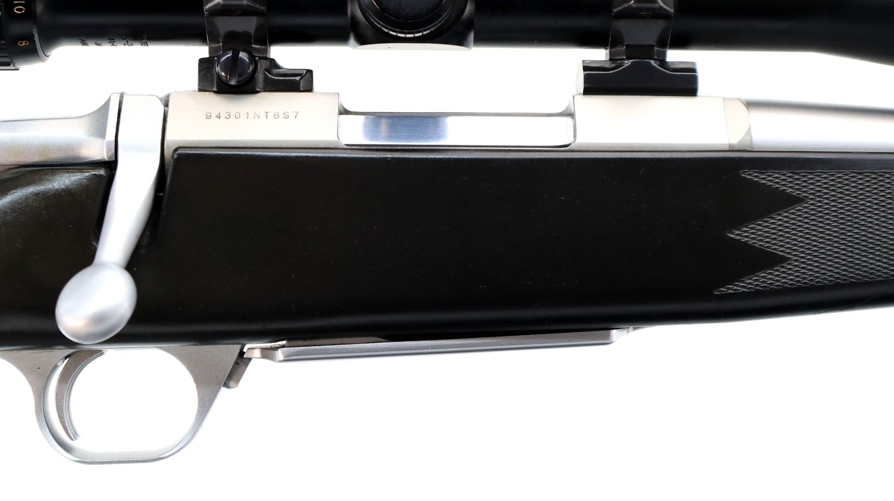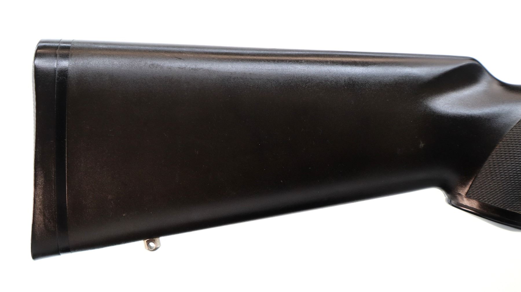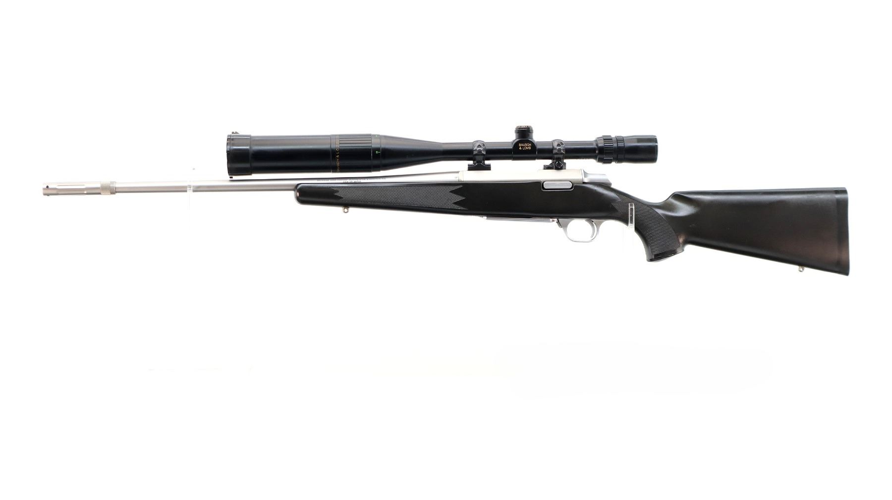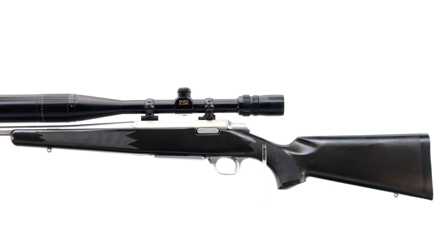 Main Description: No sights, stainless finish, threaded muzzle with Boss installed, receiver drilled and tapped with Bausch & Lomb Elite 4000 8-24x40 AO Scope installed, clear optics with duplex crosshair, includes sunshade. Flat sided bolt knob, tang safety. One piece black synthetic stock, checkered forearm and pistol grip with right hand palm swell, black rubber recoil pad, grip cap, swivel studs. Accessories include: Factory stainless ported muzzle brake and wrench.