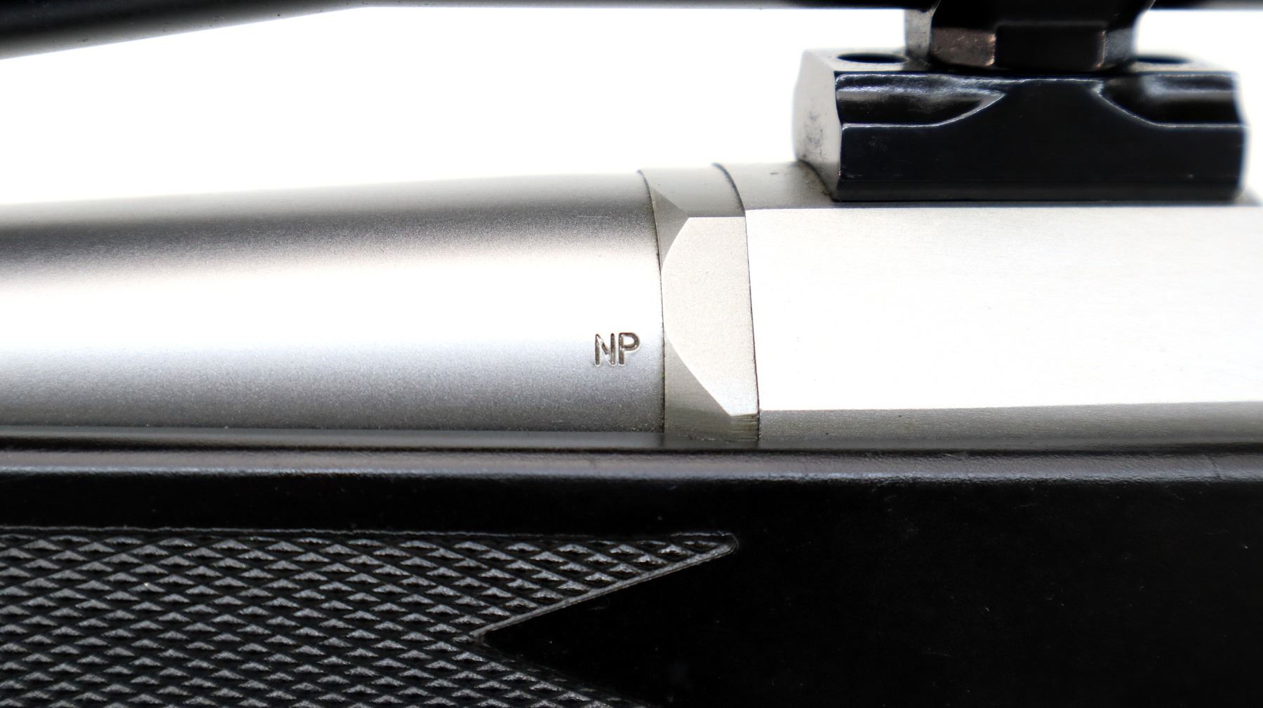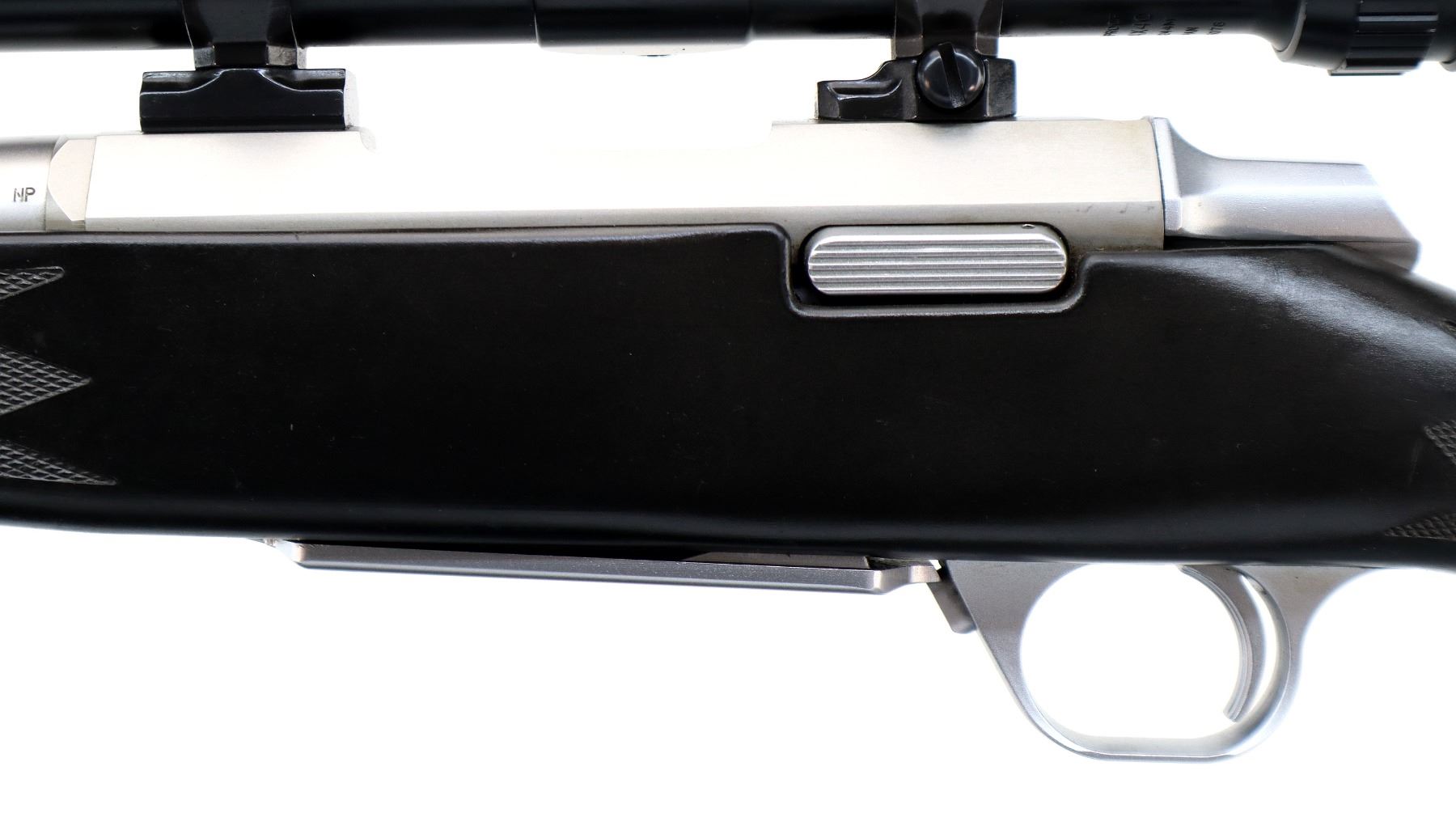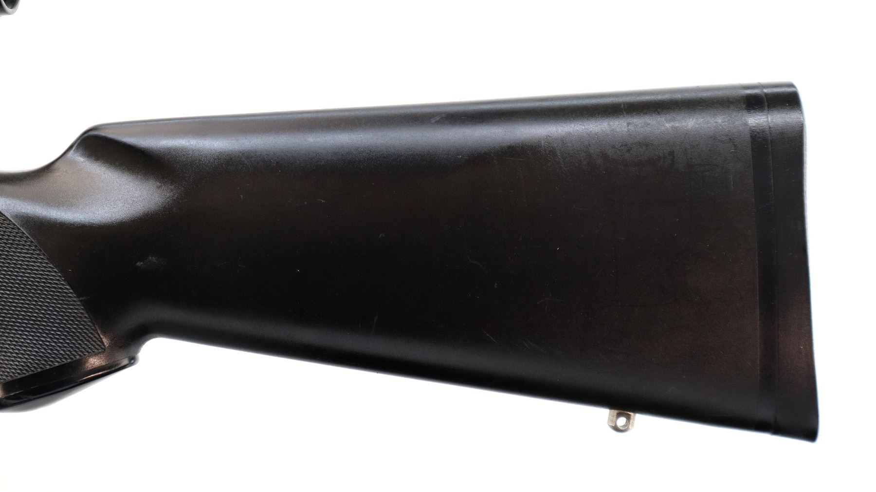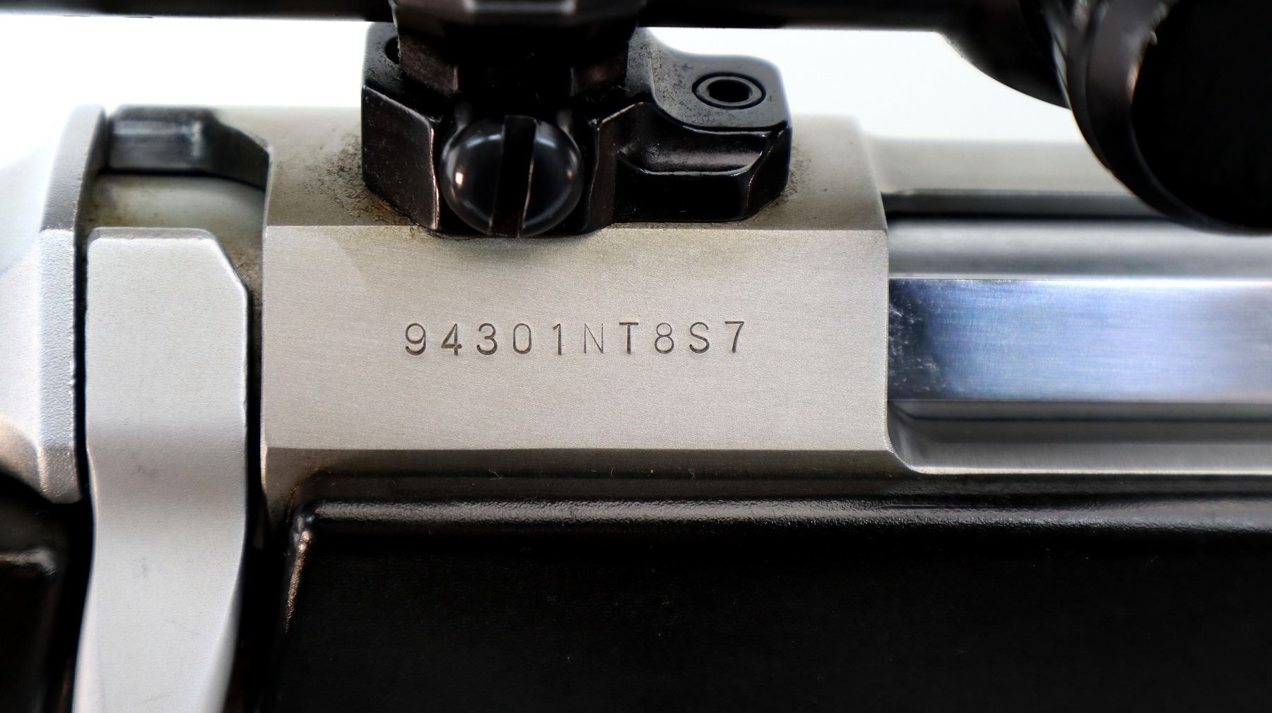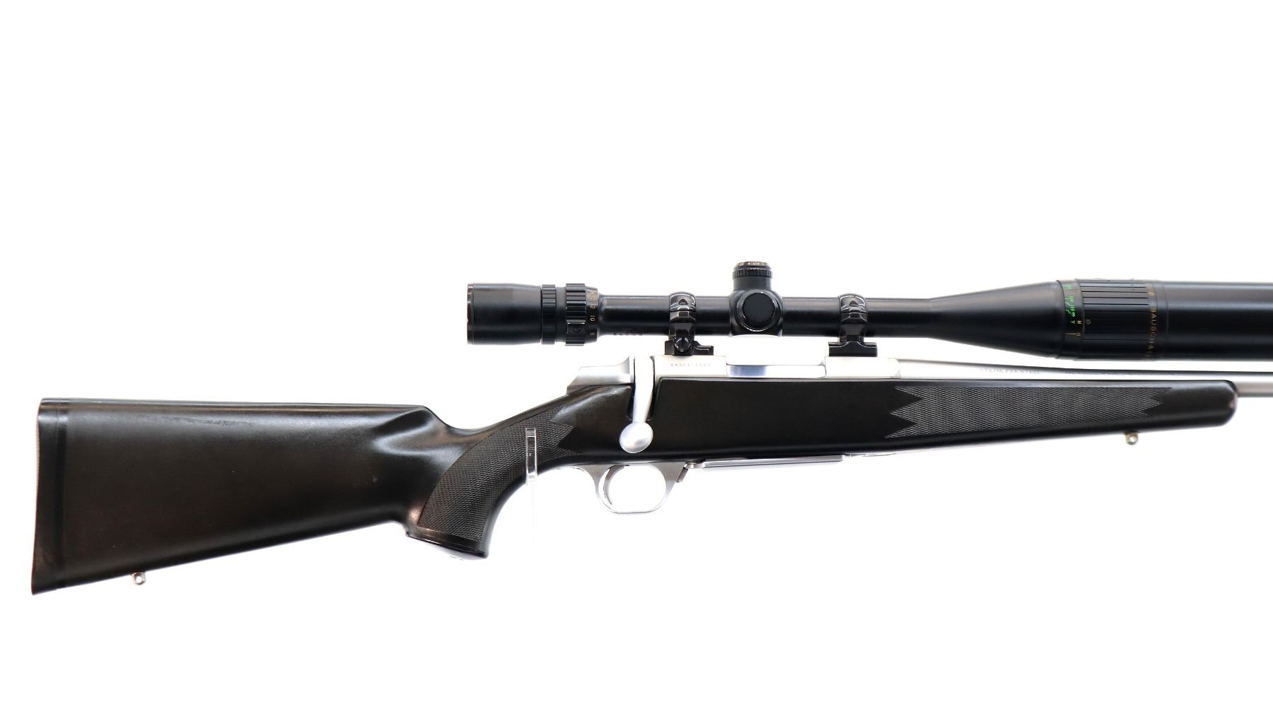 Main Description: No sights, stainless finish, threaded muzzle with Boss installed, receiver drilled and tapped with Bausch & Lomb Elite 4000 8-24x40 AO Scope installed, clear optics with duplex crosshair, includes sunshade. Flat sided bolt knob, tang safety. One piece black synthetic stock, checkered forearm and pistol grip with right hand palm swell, black rubber recoil pad, grip cap, swivel studs. Accessories include: Factory stainless ported muzzle brake and wrench.