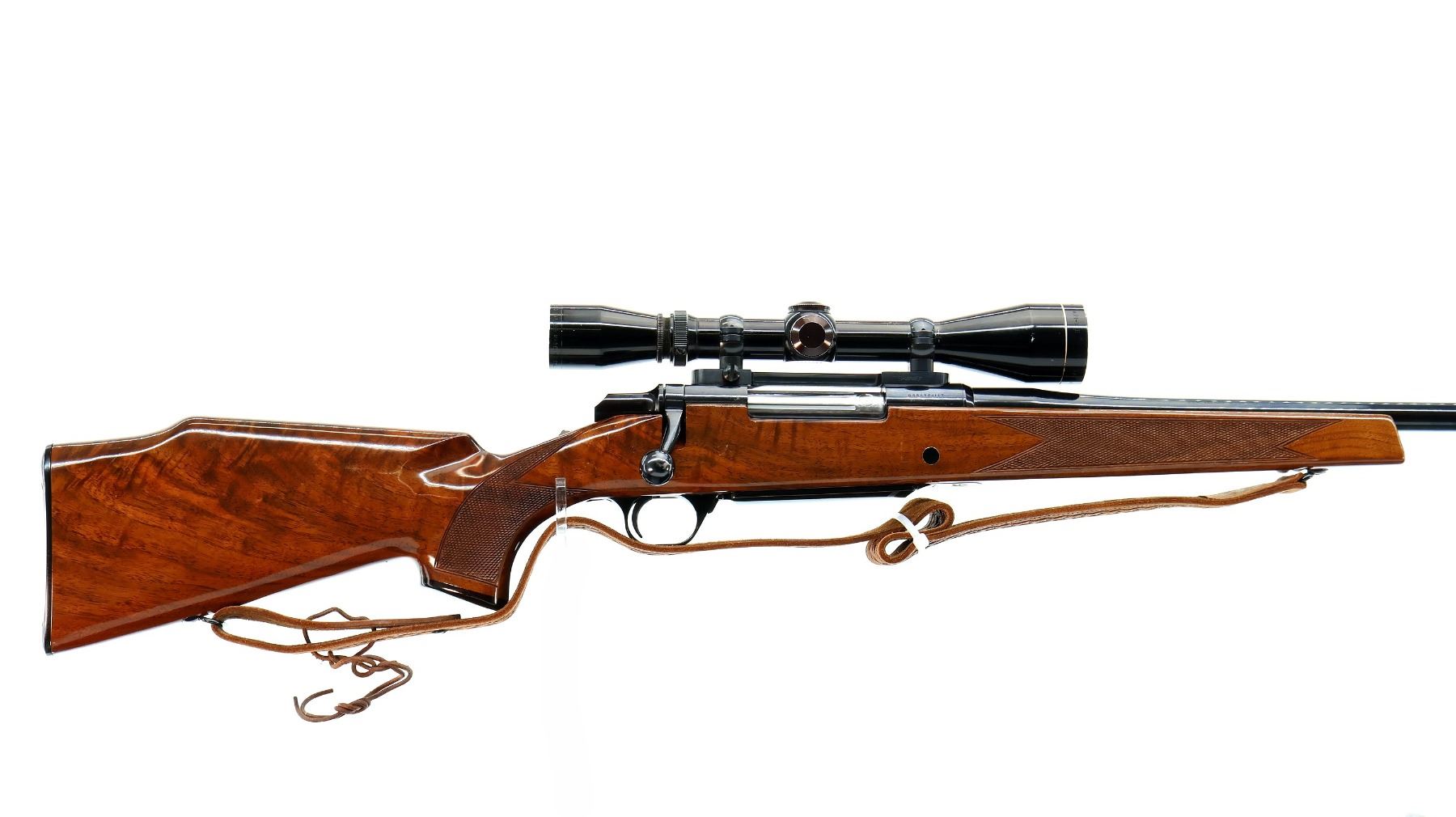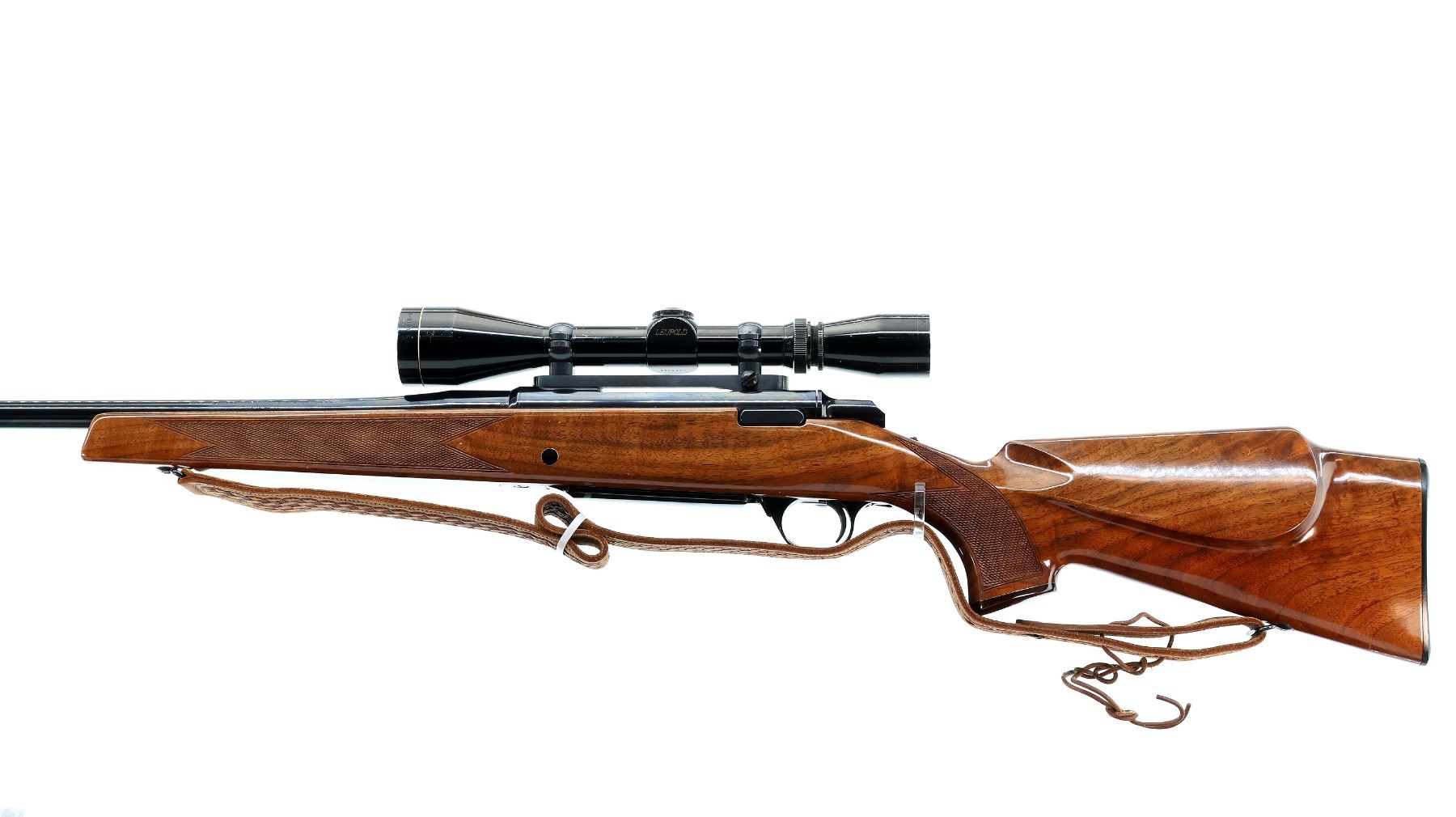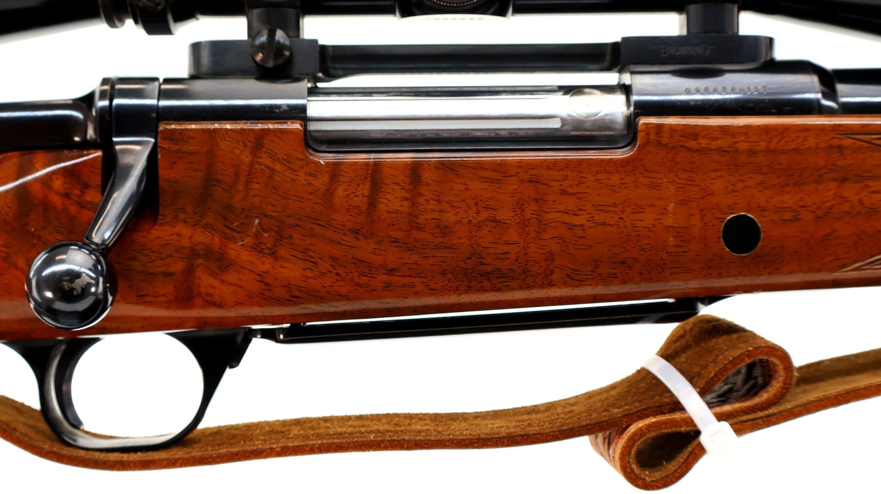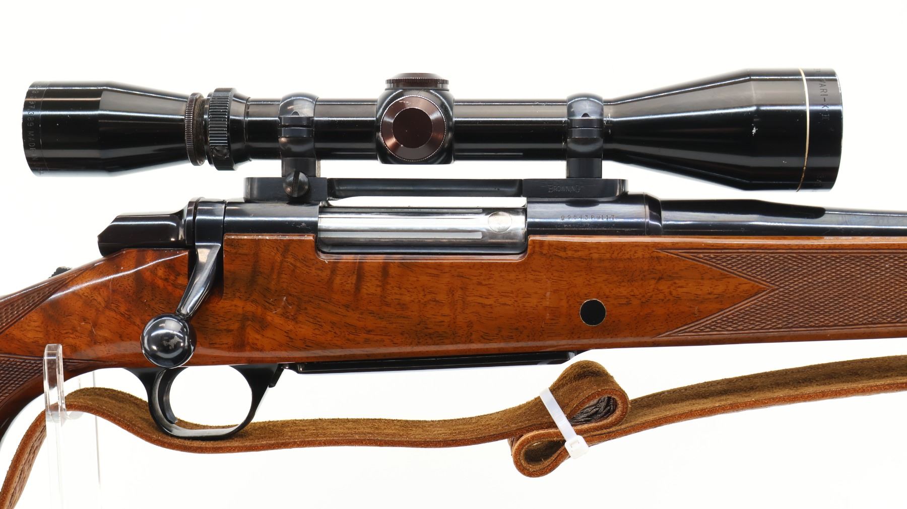 Main Description: No sights, polish blued finish, receiver drilled and tapped with Leupold Vari X II 3-9 scope installed, clear optics with duplex crosshair. Fluted bolt with smooth knob. One piece gloss finish wood stock, Rosewood forend and pistol grip caps, checkered forearm and pistol grip, cheek rest, Browning logo black polymer butt plate, sling swivels with brown leather sling.