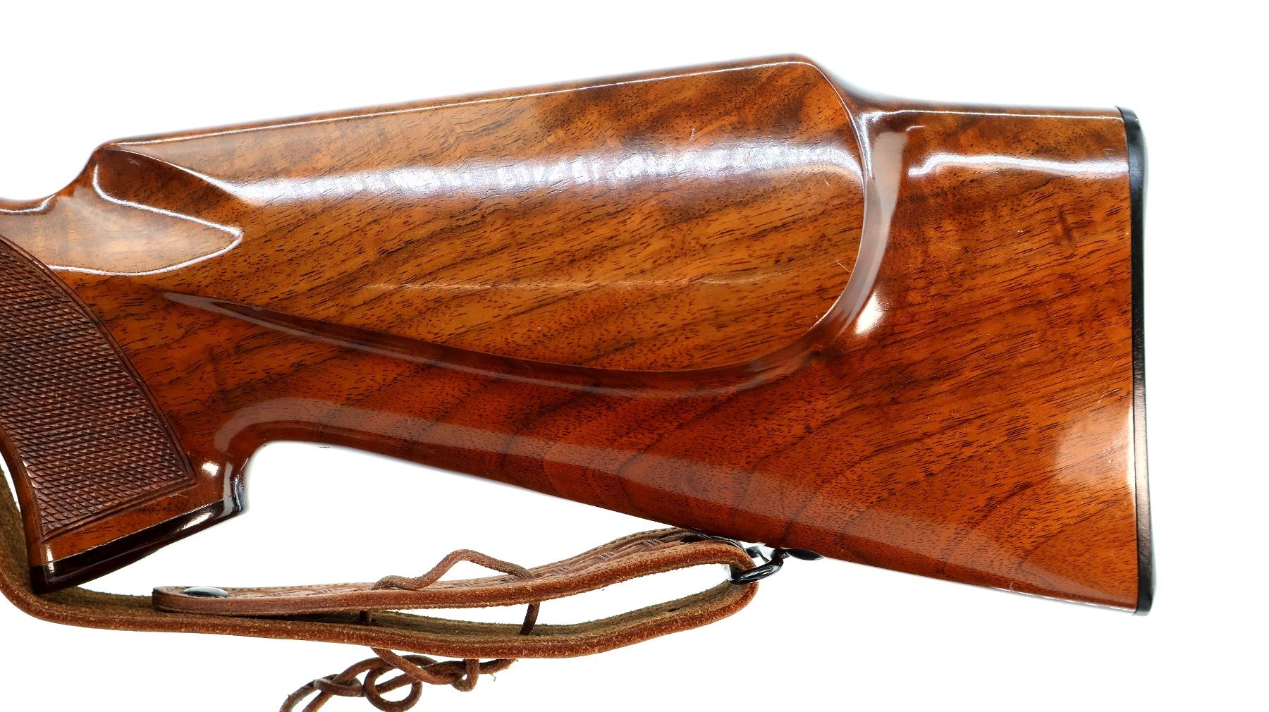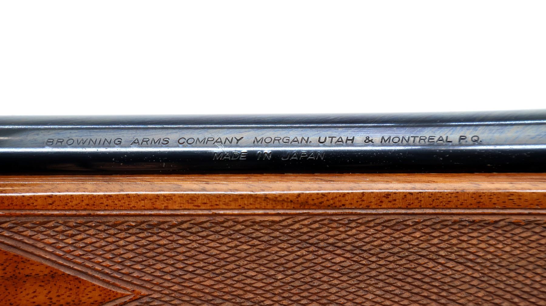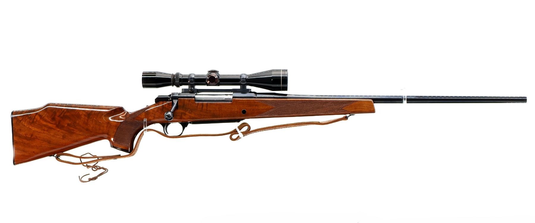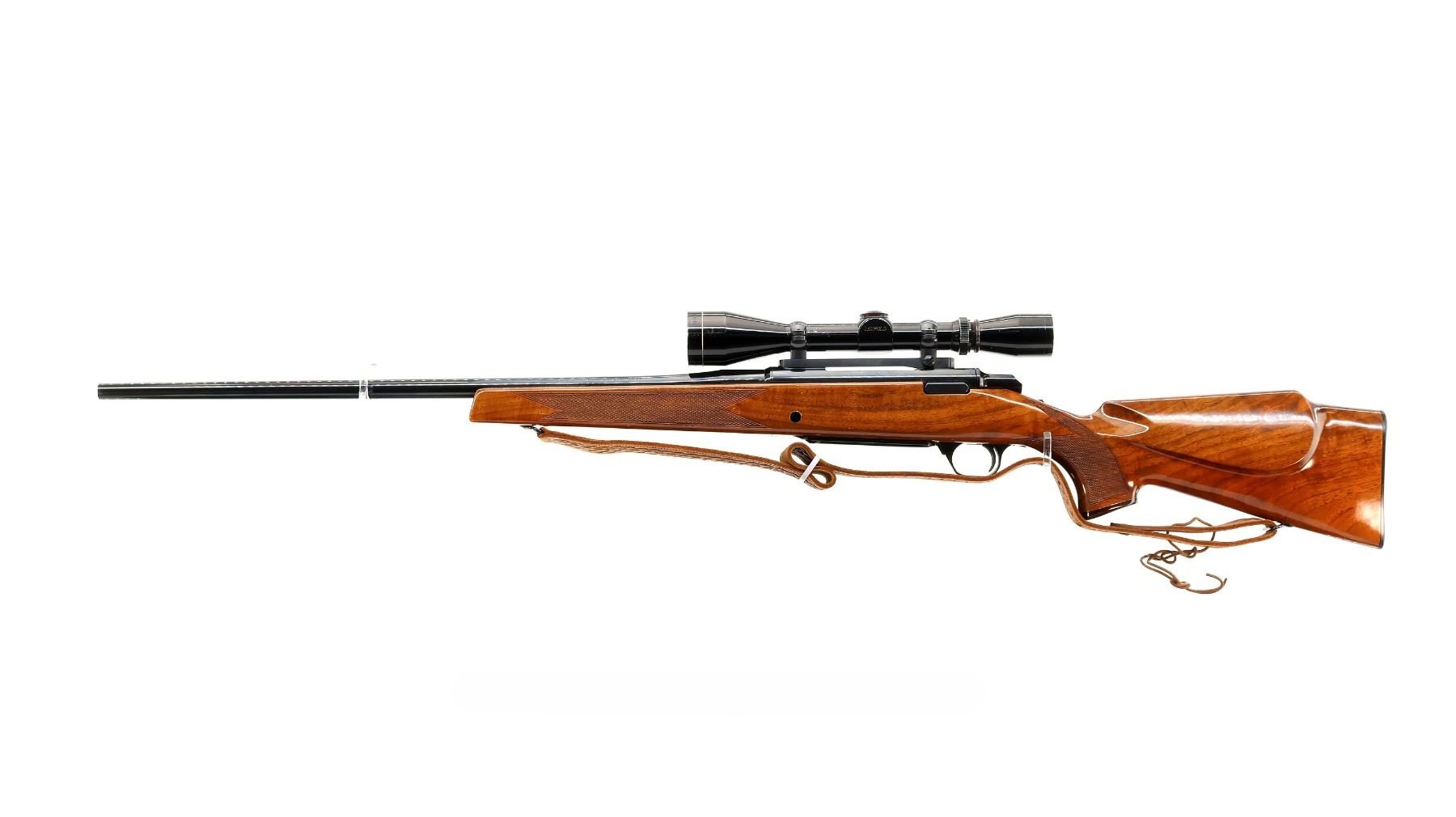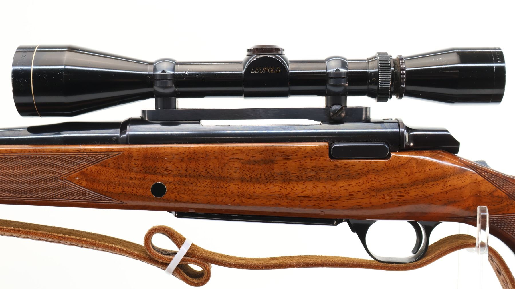Main Description: No sights, polish blued finish, receiver drilled and tapped with Leupold Vari X II 3-9 scope installed, clear optics with duplex crosshair. Fluted bolt with smooth knob. One piece gloss finish wood stock, Rosewood forend and pistol grip caps, checkered forearm and pistol grip, cheek rest, Browning logo black polymer butt plate, sling swivels with brown leather sling.
