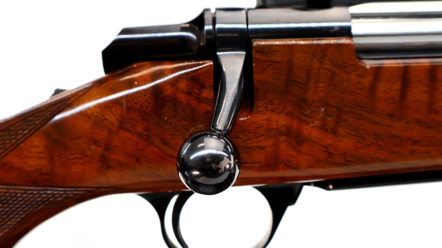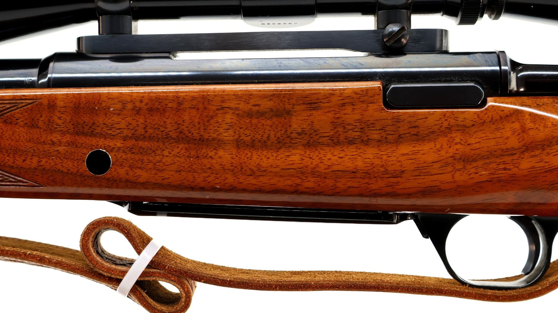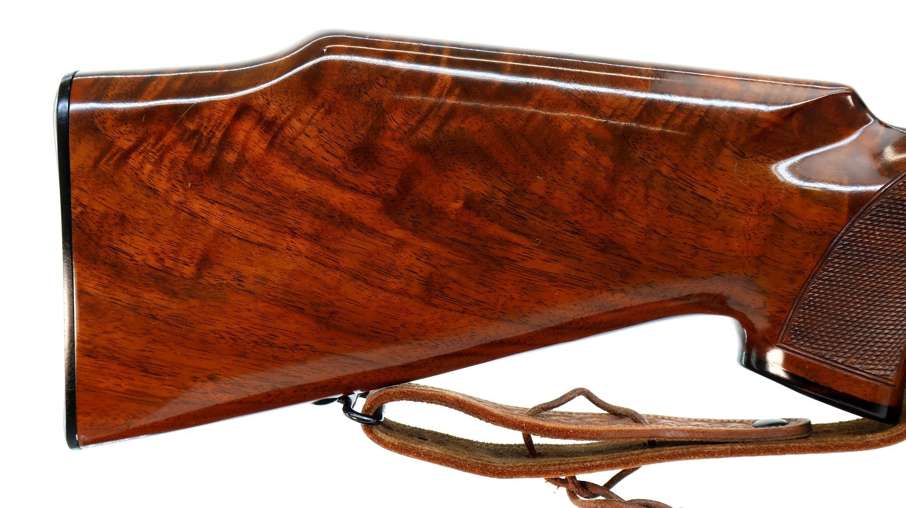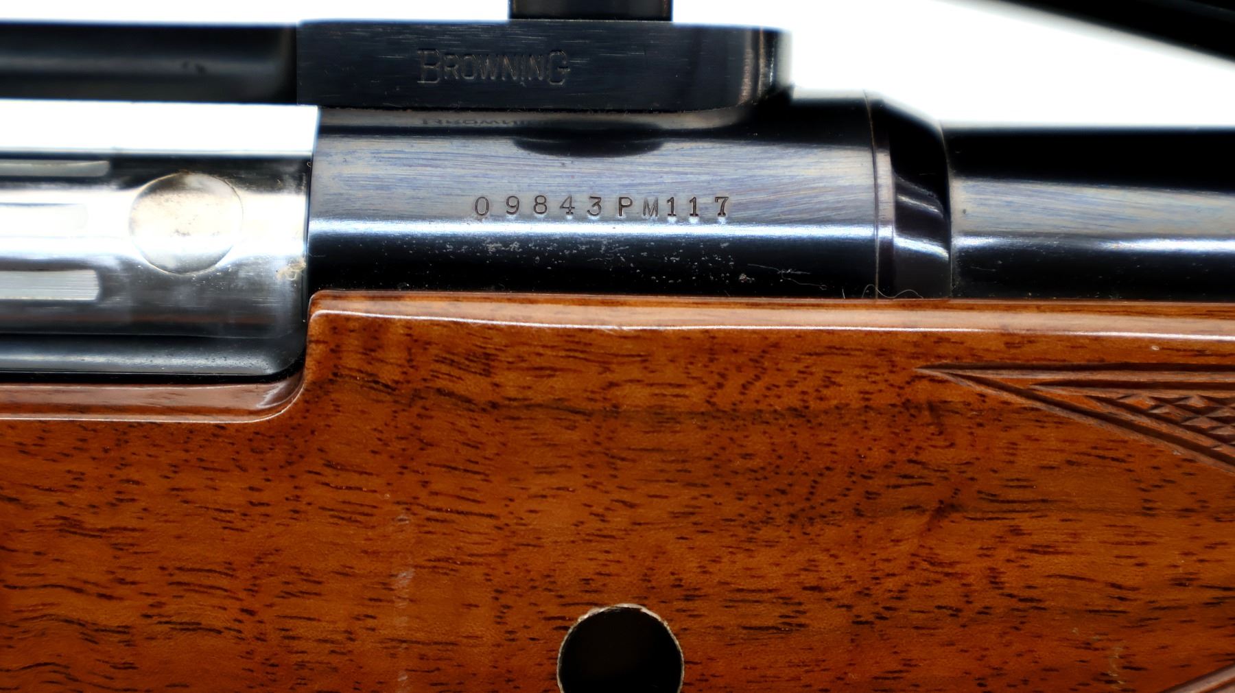Main Description: No sights, polish blued finish, receiver drilled and tapped with Leupold Vari X II 3-9 scope installed, clear optics with duplex crosshair. Fluted bolt with smooth knob. One piece gloss finish wood stock, Rosewood forend and pistol grip caps, checkered forearm and pistol grip, cheek rest, Browning logo black polymer butt plate, sling swivels with brown leather sling.