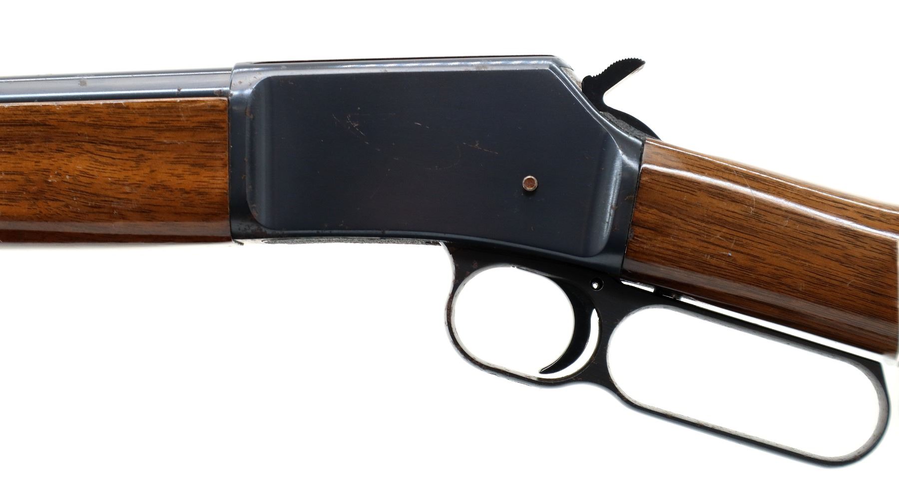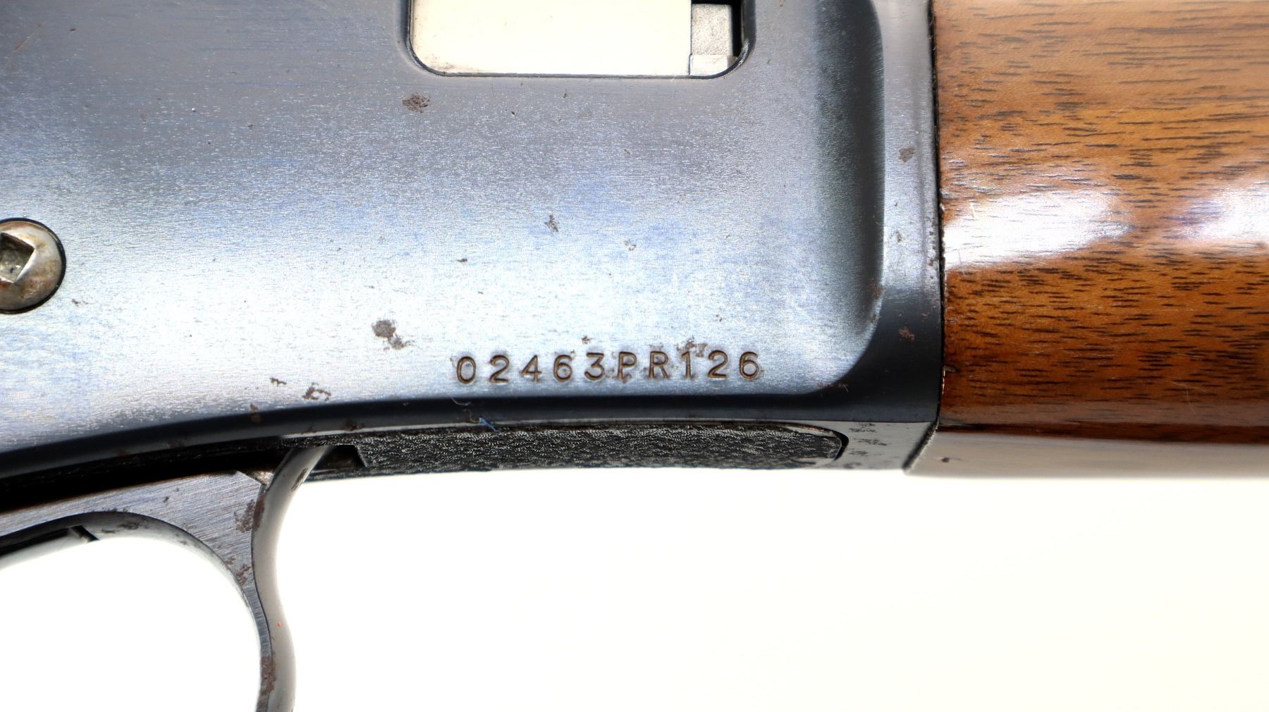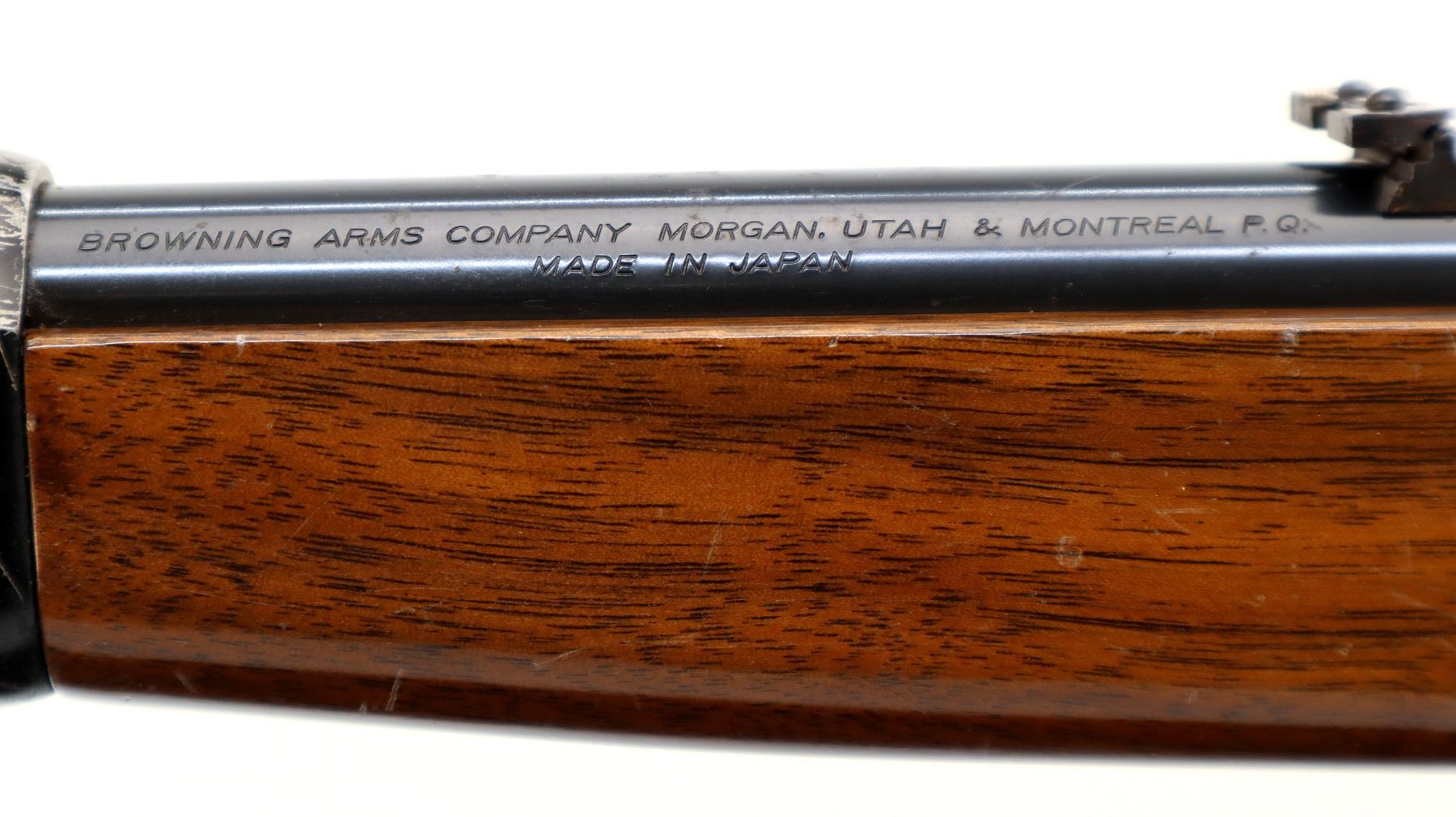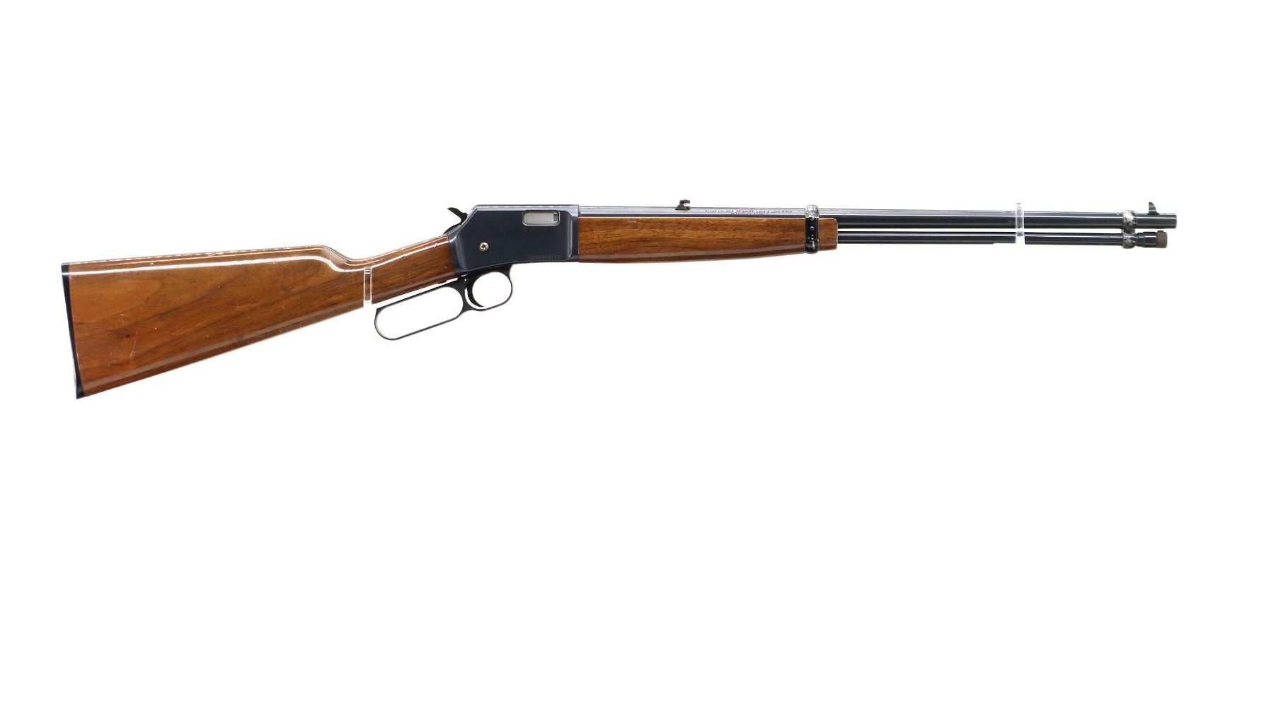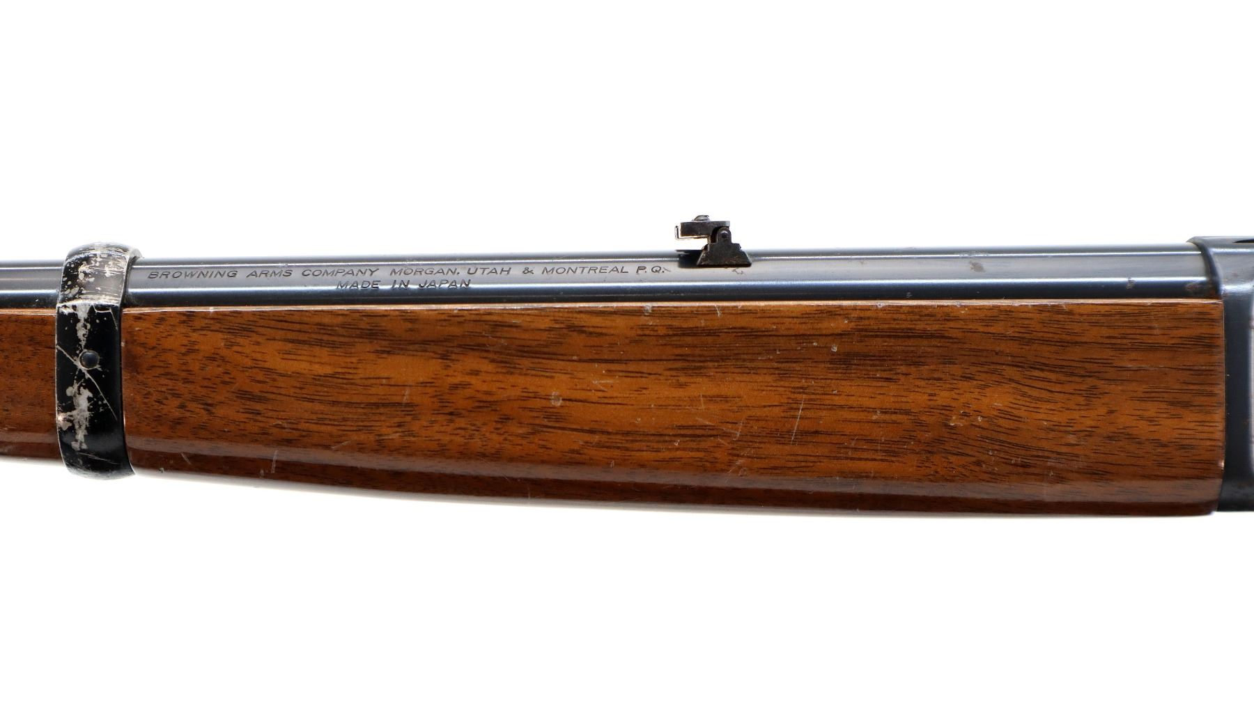 Main Description: Blade front sight, adjustable folding u notched rear sight, blued finish, grooved receiver, spur hammer. Note: takedown screw has been replaced threads possibly damaged. Two piece wood stocks, straight grip, Browning logo black polymer butt plate, full length magtube.