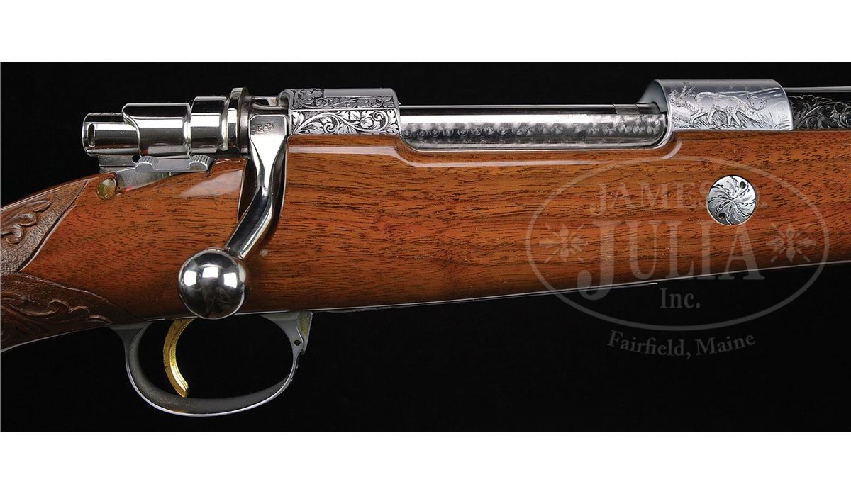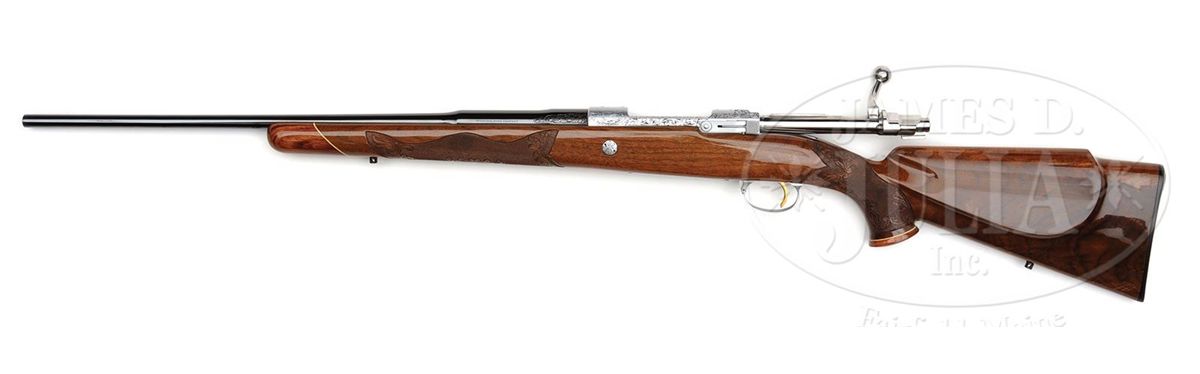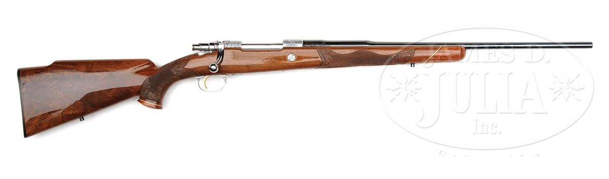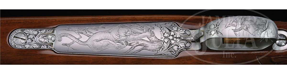 PLEASE NOTE (10-10-13): Wood has been tested for salt with silver nitrate. Result is negative. SN 5P32390. Cal. .308 Win. 22" Lightweight bbl, small ring mauser action, no sights, is marked with "BROWNING ARMS COMPANY" on left rear, and with caliber, SN, and "MADE IN BELGIUM" on right. Coin finished action is engraved on left side and bridge with deep, open, scrolled acanthus with stippled background. Left side of receiver ring portrays running pronghorn with cacti in foreground, and open prairie behind. Right side depicts grazing mule deer buck in hilly landscape. Both scenes are signed "A Marechal" at bottoms. Bottom metal with matching scroll, depicts puma climbing out of bare tree on floorplate, and with billy mountain goat on trigger guard bow. Puma scene is signed "R. Risack" at bottom. Flame figured American walnut stock features Monte Carlo swept right hand cheekpiece, rosewood grip cap and forend tip with white lines, and a Browning composition buttplate. Fancy checkering is surrounded by relief carved scrolled acanthus on grip and forend. Weight: 7 lbs. 3 oz. LOP: 13-3/4". CONDITION: Excellent, essentially as new, with only one or two faint scuffs and light marks in wood finish. Checkering is slightly darkened. 4-49122 MGM208
