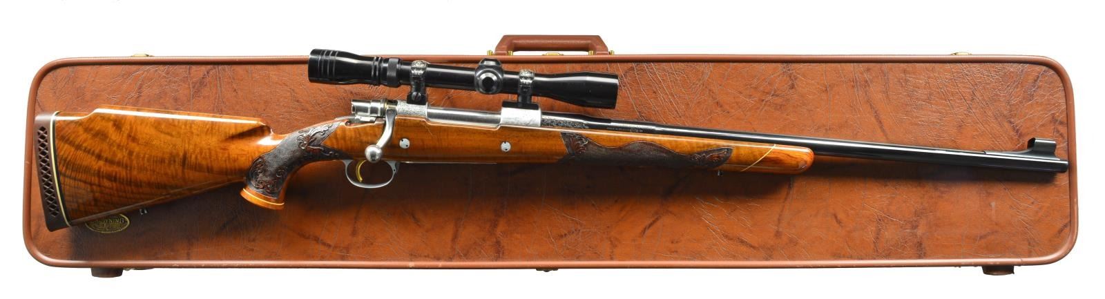 Cal. 338 Win. Mag. S# 5P33219. Bbl. 24 1/2" w/ ramp mounted hooded front sight & filler screws in holes for rear sight. FN 98 Supreme action w/ jeweled extractor & gold finished single stage trigger. French gray finished receiver has full coverage hand engraving by Master Engraver, A. Marechal. Engraving features bugling bull elk on right side of front ring, bull moose on left, balance of action has full coverage vine type foliate scroll w/ punch dot background that extends to breech end of bbl. Floorplate & trigger guard have full coverage engraving by Master Engraver, R. Dewill. Engraving features a standing grizzley on floorplate w/ snarling mountain lion on trigger guard. Scenes are surrounded by vine type foliate scroll that match the receiver. Redfield Lo-Pro 3-9x gloss finished scope w/ duplex reticle on Redfield Jr. mts. w/ engraved Redfield rings. Monte Carlo cheekpiece sporter stock of gloss finish fancy walnut having a tight fiddle grain. Forearm & wrist have fine hand checkering w/ elaborate carved borders surrounded by punch dot backgrounds. Stock features include contrasting forearm tip, flared grip cap w/ white line spacers & swivel bases. LOP: 13 1/2" over original Browning pad. Weight w/ scope: 9 lbs., 15.8 oz. 1965 Belgium mfg. UNATTACHED ACCESSORIES: Browning luggage case. CONDITION: 99% metal finish. Very good original stock finish. Sound mechanics. Near excellent bore. Bright optics. (20-1913/DS). CURIO. $7,000-10,000.