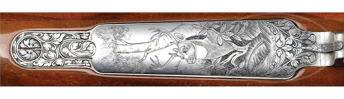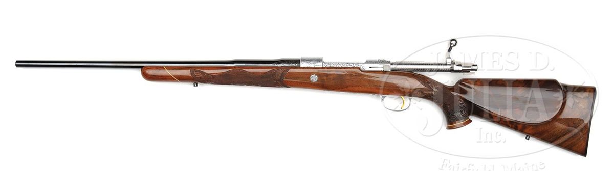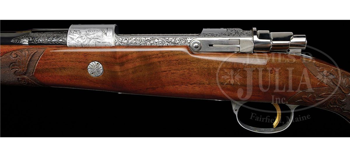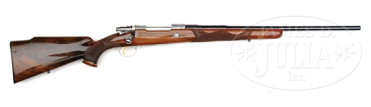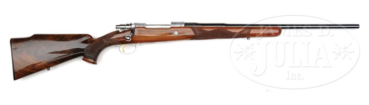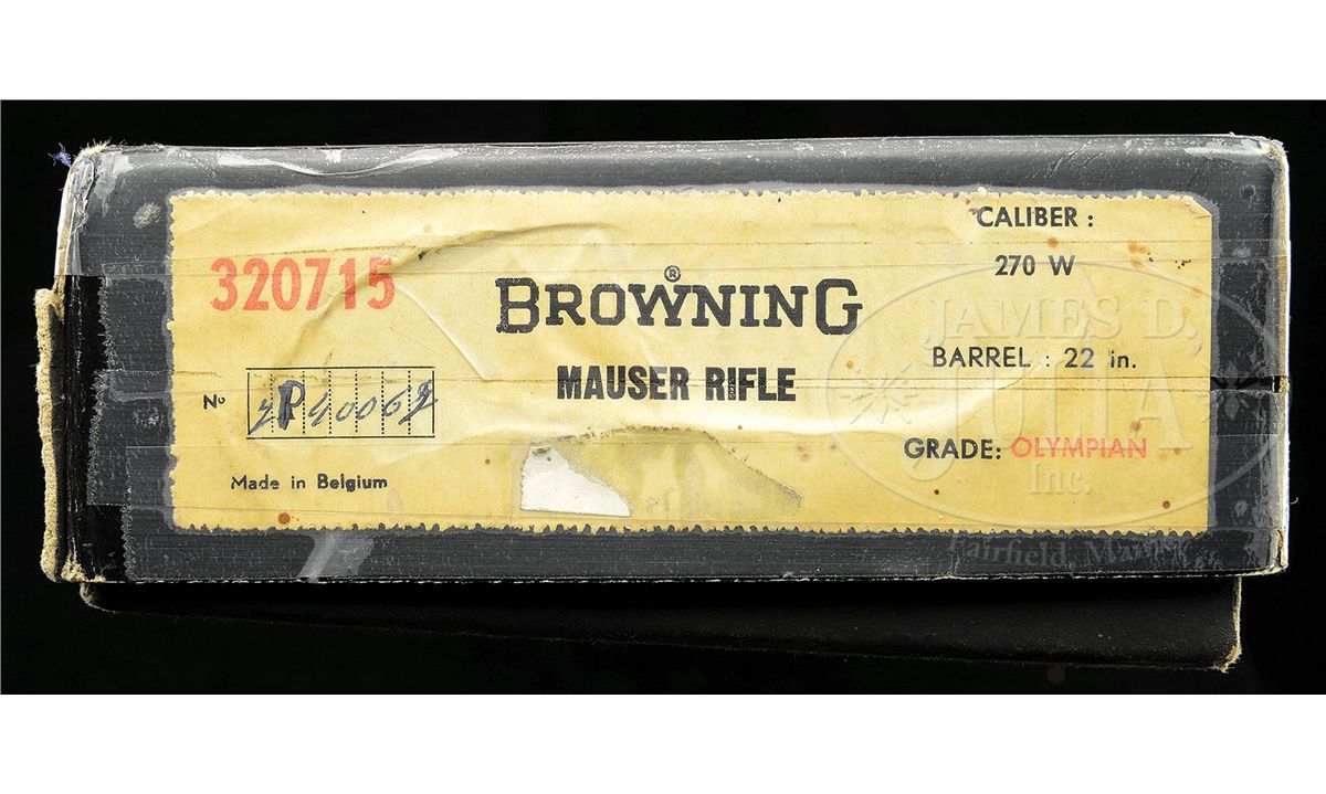 PLEASE NOTE (10-10-13): Wood has been tested for salt with silver nitrate. Result is negative. SN 7P40067. Cal. .270 Winchester. 22" Bbl without sights. Standard configuration and markings. Coin finished action has side wall and bridge engraved with semi-relief open shaded scrolled acanthus. Receiver ring is engraved with bull moose on left side and bellowing elk on right. Bottom metal has matching scroll with grizzly bear on trigger guard bow. Floorplate is engraved with portrait of buck mule deer peering out of bracken with birch tree in background. Floorplate and moose on receiver ring is signed by "R. Risack". Very fine feather crotch figured and dark marbled claro walnut stock with swept right hand Monte Carlo cheekpiece, is fitted with composition Browning buttplate, single reinforcing bolt, sling eyes, and rosewood grip cap and forend tip with white line spacers (grip cap has inset gold diamond). Checkering at grip and forend is framed by well carved relief scrolled acanthus with stippled background. Weight: 7 lbs. 12 oz. LOP: 13-7/8". Rifle is accompanied by its orig black and gold box with end label marked for this rifle, which contains instruction booklet. CONDITION: Excellent. Metal parts retain essentially all of their fine finishes. Stock retains essentially all of a high gloss finish with some slight crazing and lifting of finish on left side near grip cap. Checkering is slightly worn and dark. Bore is excellent. Bolt runway shows some slight marks. Box is very fine, with some new tape reinforcements at corners. Label is light brown and covered with tape. Interior foam has some small breaks and light soiling. Instruction booklet envelope is somewhat tattered. 4-49165 MGM249