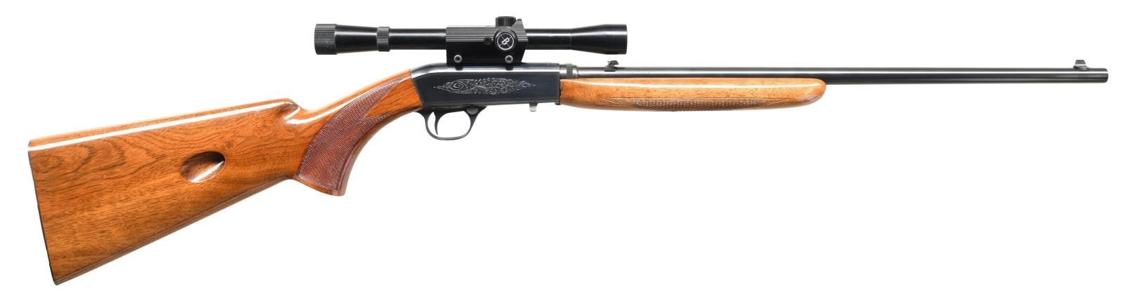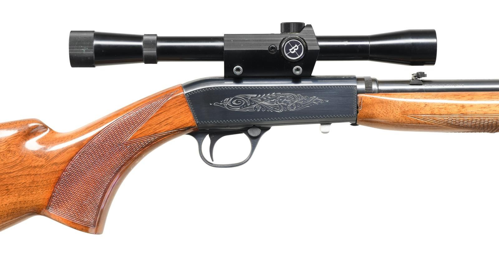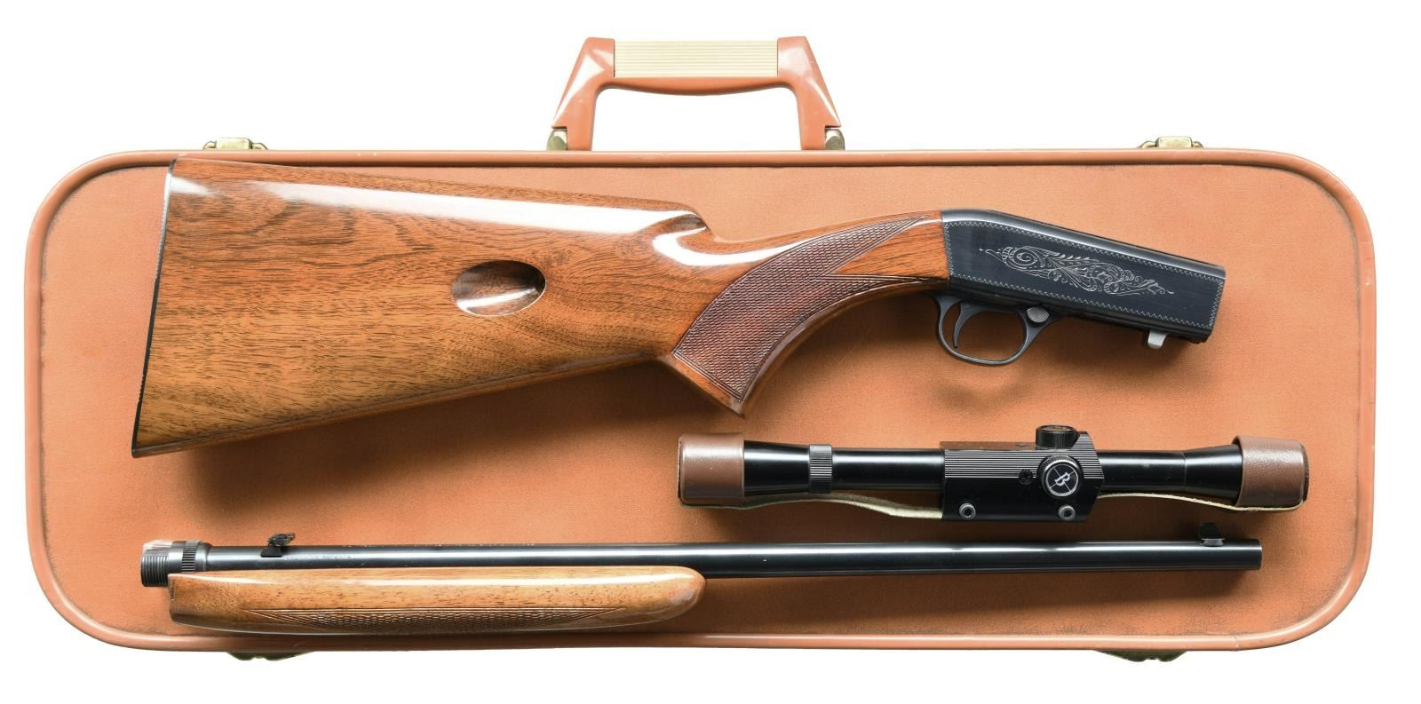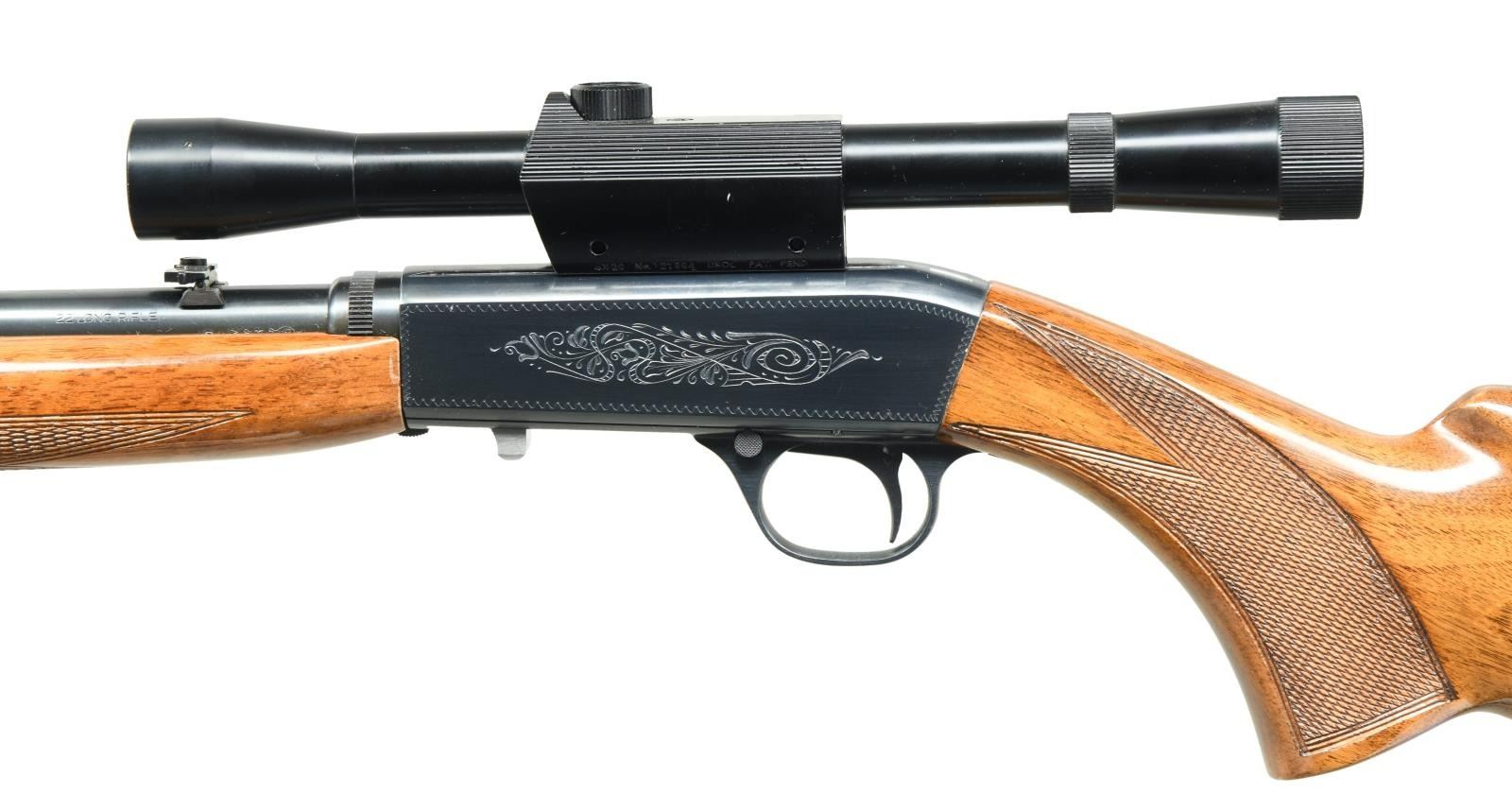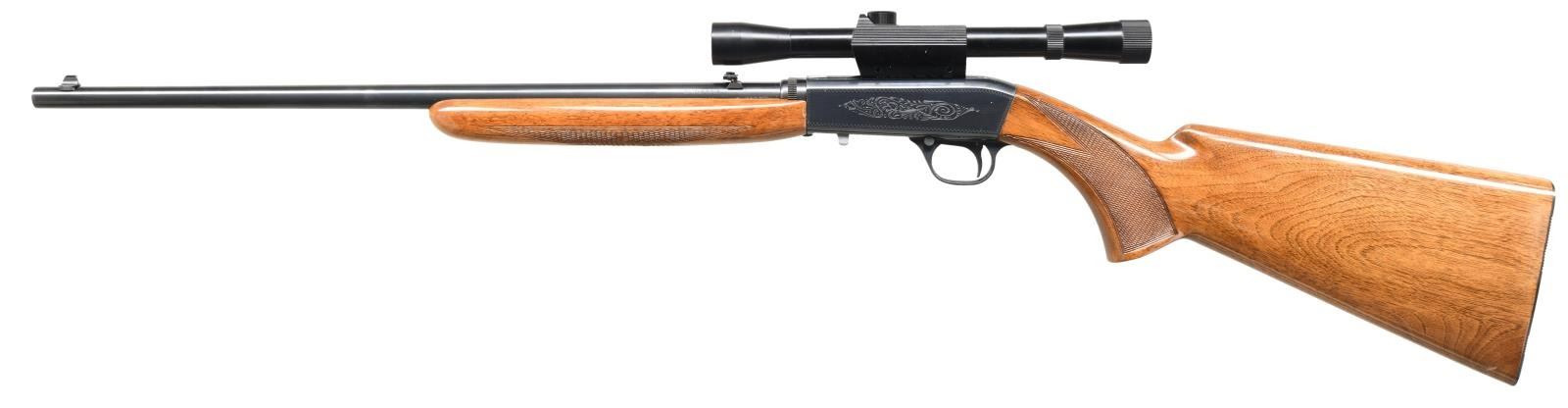 CASE. Cal. 22 LR. S# 2T46044. Bbl. 19 3/8". SA-22 semi-automatic rifle manufactured by FN in Belgium and imported/retailed by Browning Arms Company in 1962. The top of the barrel is marked with Browning's importer information above "MADE IN BELGIUM", with the caliber designation stamped on the left at the breech. Receiver, bolt, and barrel exhibit Belgian proofs. Receiver features light foliate engraving with a wavy line border on the left and right sides. Metal components exhibit a blued finish. Checkered wood buttstock with grooved steel buttplate, and checkered wood forend. Receiver is mounted with a Bushnell Scope Chief 22 4x20 scope. UNATTACHED ACCESSORIES: Hartmann brown leatherette case containing original factory paperwork. CONDITION: fine, with metal components retaining bountiful amounts of their original factory blue finish overall, exhibiting some light superficial marks from handling and storage. Brilliant mirror bore, exhibiting well defined rifling throughout. Wood furniture shows some scattered marks from handling and storage, but is otherwise very good overall. Scope retains a clear image. Case shows some mild exterior wear, with brass components exhibiting some mild oxidation and discoloration. PROVENANCE: The Collection of Gun Sport Ltd. owned by Jon R. Thomas. (23-3629/MLW). CURIO. $1,250-1,750.