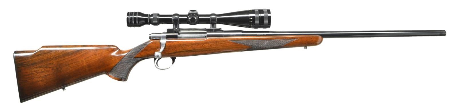 Cal. 243 Win. S# 2895Z5. Bbl. 24". Browning rifle built in Finland on a Sako action with blued metal and bolt left in the white. Monte Carlo stock with pistol grip and forend checkered with sling swivel studs. LOP: 13 5/8” to the factory buttplate. No provisions for a front sight; there are 2 drilled and tapped holes filled with plug screws for a rear sight. One piece Redfield base holds a Redfield 6X-18X scope with very fine crosshairs and target dot. CONDITION: metal retains about 95% original finish with the floorplate and trigger guard just starting to tone and fade to a plum patina. Stock retains strong checkering but the points show some usage flattening. Finish is also strong with some fine scratches and crackling starting. Scope tube retains strong original blue with slightly hazy optics. (22-3655/CW). CURIO. $1,000-1,500.