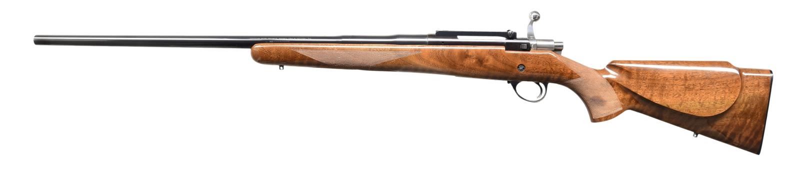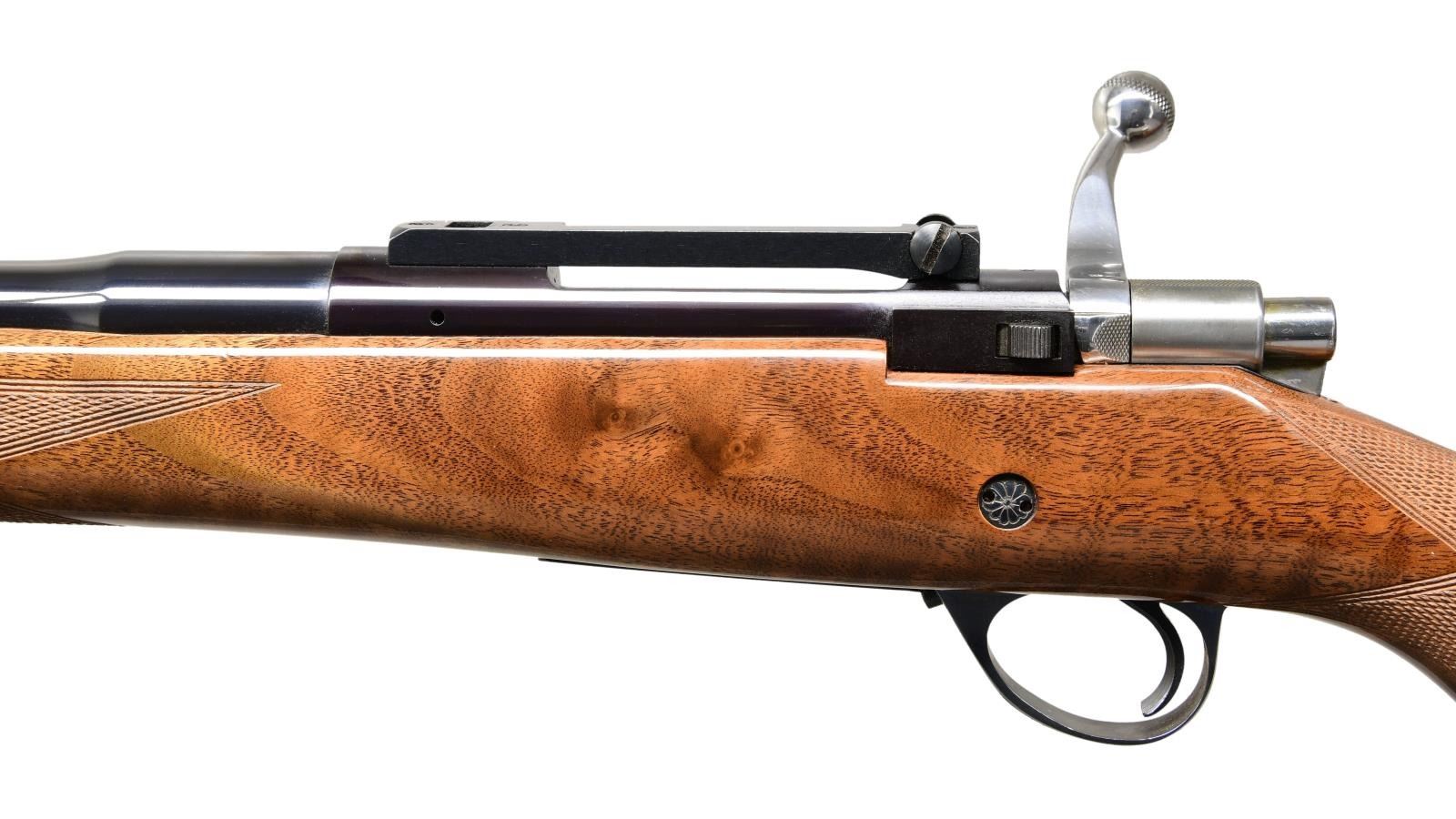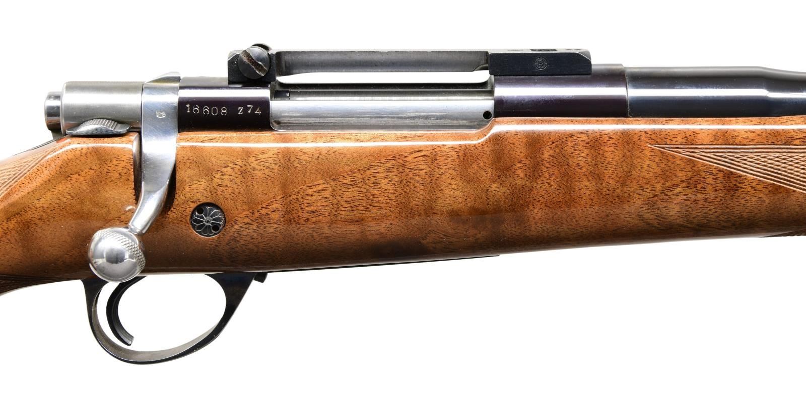 Cal. 243 Win. S# 16608Z74. Bbl. 24". Receiver has Redfield scope base. Rear of receiver has one screw hole behind scope base. Bbl. has two screw holes. Finnish made Browning Safari grade rifle. Left side of bbl. marked "BROWNING ARMS COMPANY MORGAN UTAH & MONTREAL P.Q./MADE IN FINLAND". Blued finish. Floorplate & trigger guard have floral gold engraving. Checkered Monte Carlo stock w/ left side cheekpiece & bottom mounted sling studs. CONDITION: stock near excellent retaining a high degree of original varnish. Metal retains 98% original blue w/ some light handling wear on bottom metal. Bright near excellent bore. (24-2358/MJC). MODERN. $900-1400.