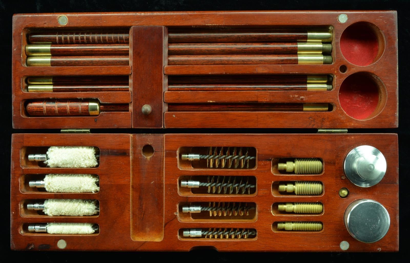 15" x 5" x 3" wooden case w/ Browning plaque on lid. Includes multi piece cleaning rod set , 12 Gauge through 410 gauge mops, brushes, jags. Also includes 2 alloy containers. CONDITION: very good overall. (02-16763/MD). $50-100.