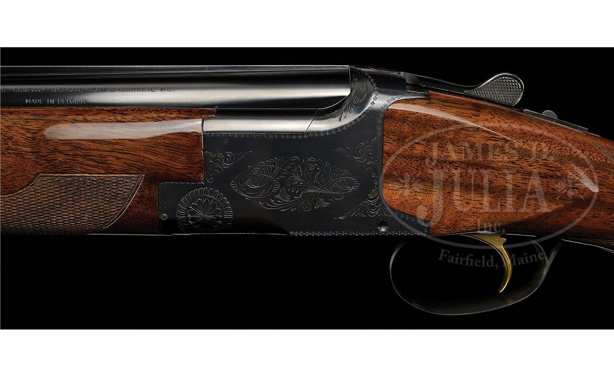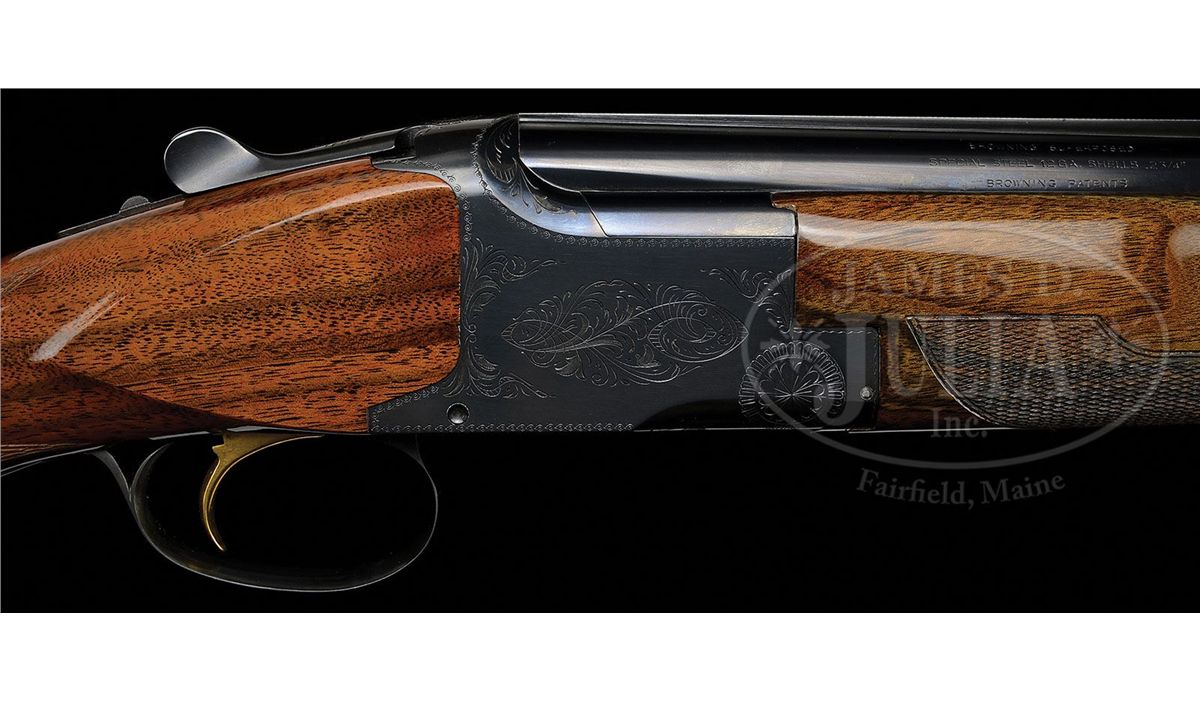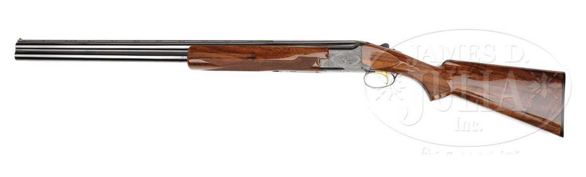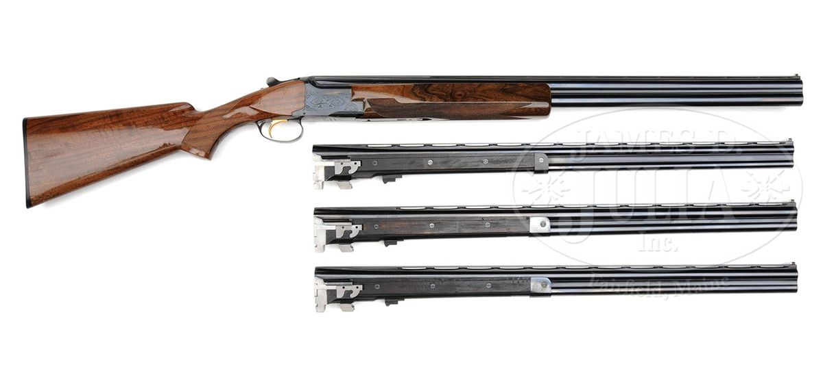SN 19315S73. Cal. 12 ga, 20 ga, 28 ga. and .410. 28" Vent rib bbls. Standard configuration, markings, and engraving. Nicely figured American walnut long tang, square knob buttstock is fitted with Browning buttplate. Tapered beavertail forend matches well. Drop at heel: 2-1/2, drop at comb: 1-1/2". Weight with 12 ga. bbls.: 7 lbs. 12 oz. LOP: 14-3/8". Aluminum case with riveted on composition trim and black corners, is lined in black corduroy, and has compartments, for stock,action, and forend in top, and all four sets of bbls in bottom. CONDITION: Excellent, near new, with only a few light handling marks on wood and metal. Small gauge bbls are still wrapped in tissue paper. Case is excellent. 4-49044 MGM196
