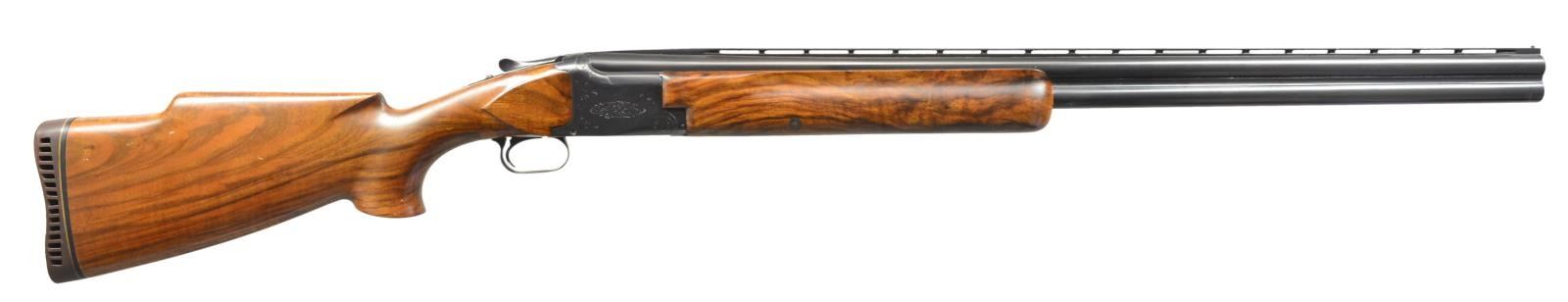 Cal. 12 Ga., 2 3/4". S# 288C5. Bbls. 30" VR w/ fixed Mod. & Full chokes. Steel front bead. Blued boxlock action w/ scroll engraving. SST. Selective ejectors. Custom target style forearm & Monte Carlo cheekpiece pistol grip stock of nicely grained Bastgone walnut. Replacement trigger guard. LOP: 14" over Pachmayr trap pad. 1965 Belgium mfg. CONDITION: 90% reblued metal finish retaining some light pitting & showing a few handling marks. Wood shows scattered scratches & marks. Stock has an added wood repair near the back of the lower tang. Selective trigger is not shifting properly to 2nd bbl. Good bright bores. (20-2494/DS). CURIO. $500-800.
