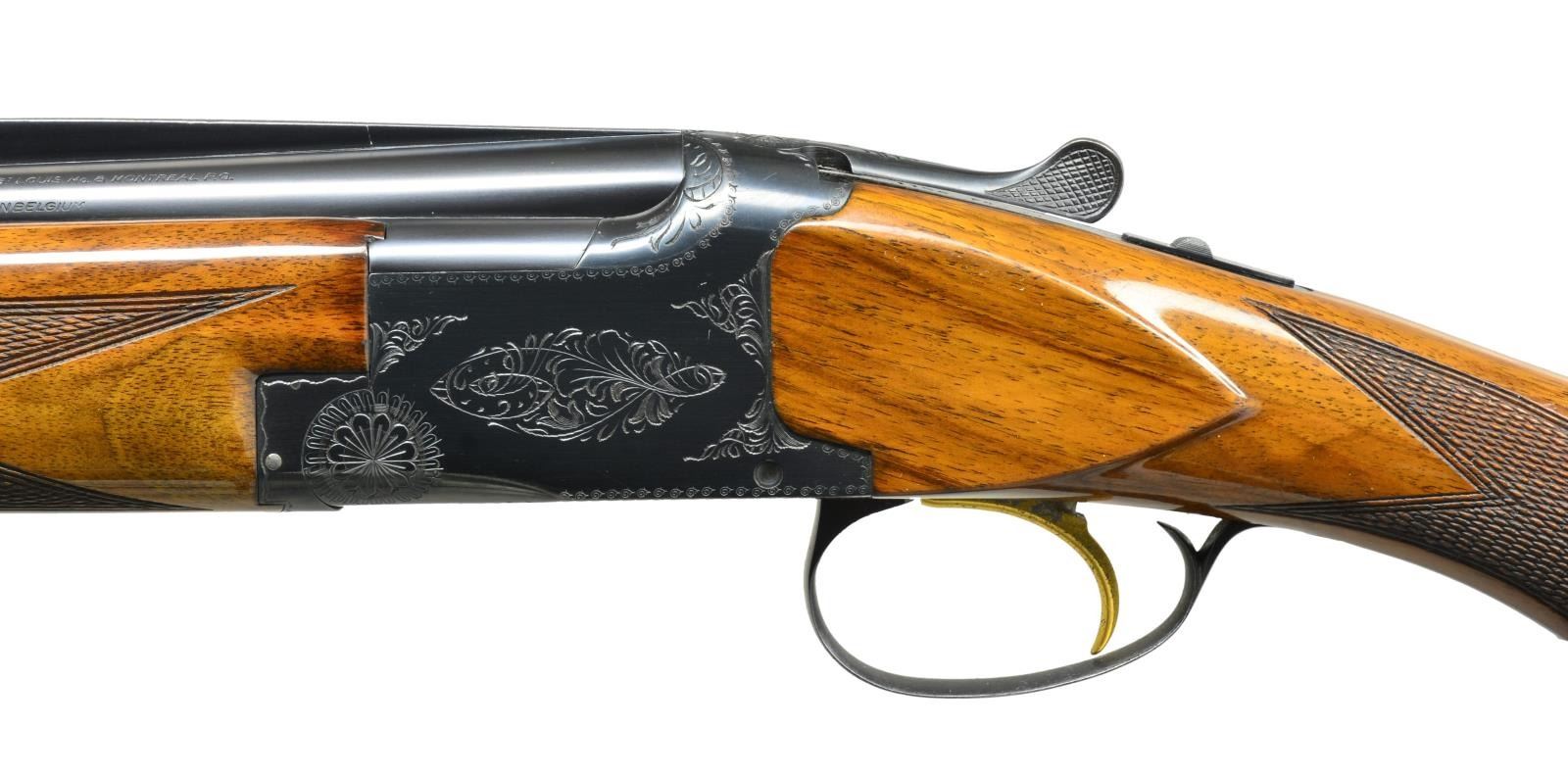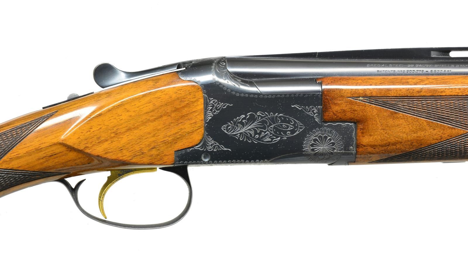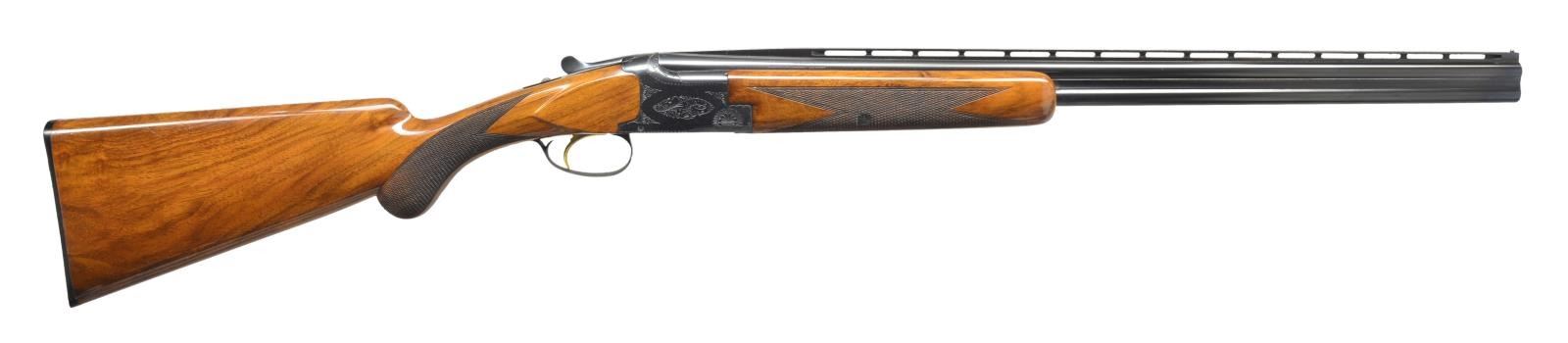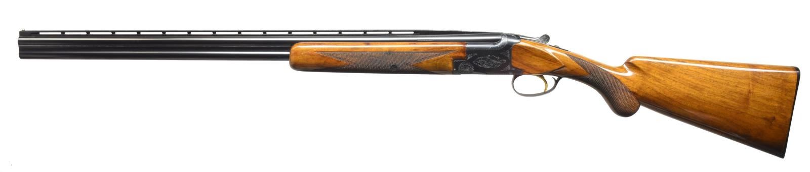 Cal. 28 Ga., 2 3/4". S# 1156F6. Bbls. 26 1/2" VR w/ fixed Skeet (.006) & Skeet (.006) chokes & steel bead. Blued boxlock action w/ Grade 1 scroll engraving. Gold finished SST. Selective ejectors. Lightning forearm & rnd. knob long tang stock of gloss finished walnut w/ hand checkering. LOP: 14 1/8" over original buttplate. 1966 Belgium mfg. CONDITION: over 98% original blue. Trigger retains 70% gold finish. Original stock finish shows numerous scratches & sm. marks. Bright near excellent bores. (21-1607/DS). CURIO. $4,000-6,000.
