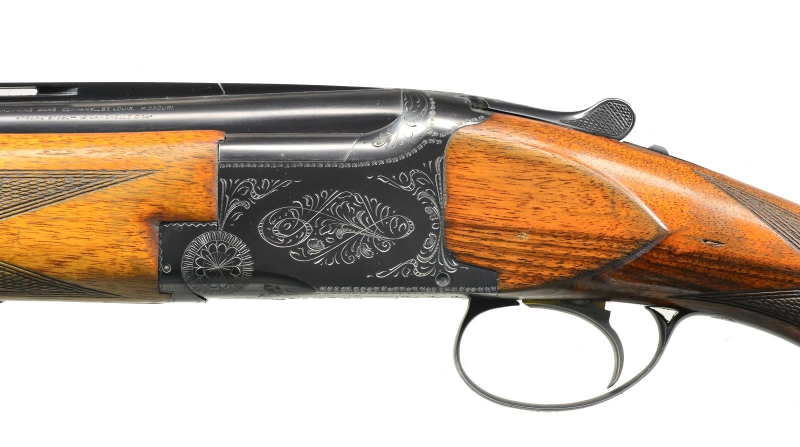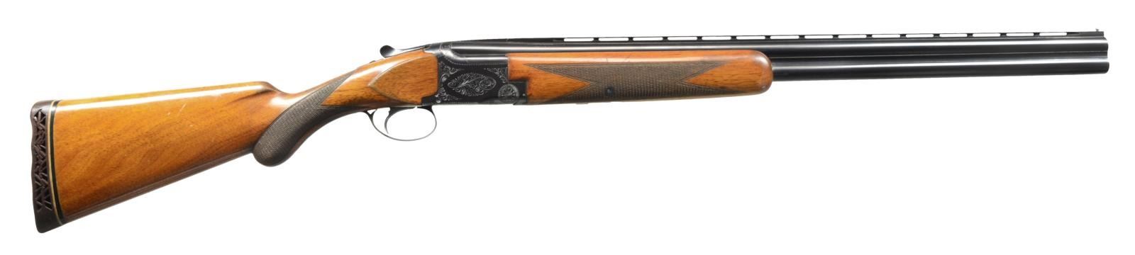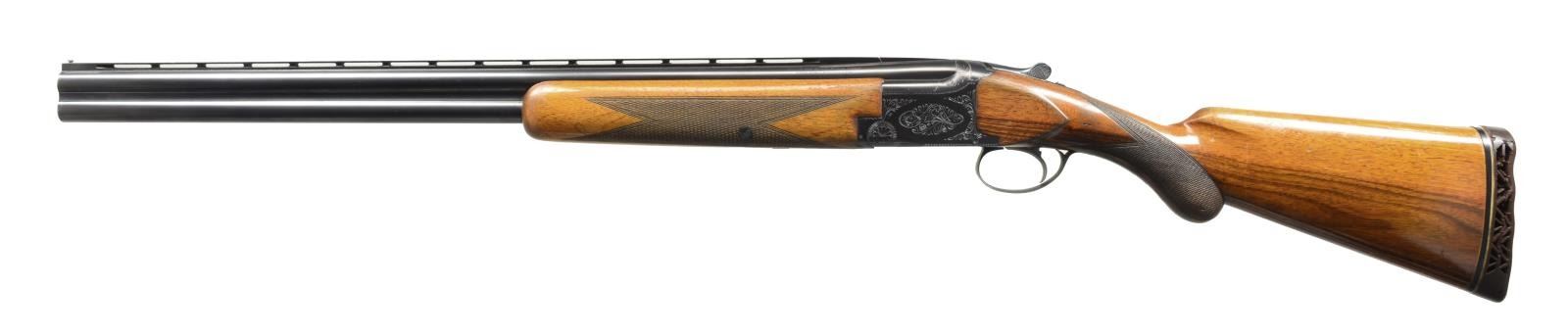 SHOTGUN. Cal. 12 Ga., 2 3/4". S# 60813. Bbls. 26 1/2" VR w/ fixed Skeet & Skeet chokes. Steel front bead. Blued boxlock action w/ scroll engraving. Gold plated SST. Selective Ejectors. Lightning forearm & rnd. knob long tang stock of checkered European walnut. LOP: 13 5/8" over aftermarket Browning pad. CONDITION: 80% dull lightly faded blue. Stock & forearm show wear w/ areas of peeling finish showing scattered scratches & handling marks. Recoil pad is age hardened & crushed. Sound mechanics. Good bright bores. (20-2495/DS). CURIO. $600-900.