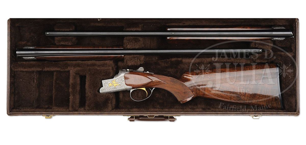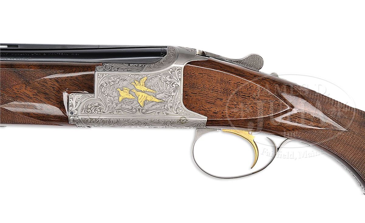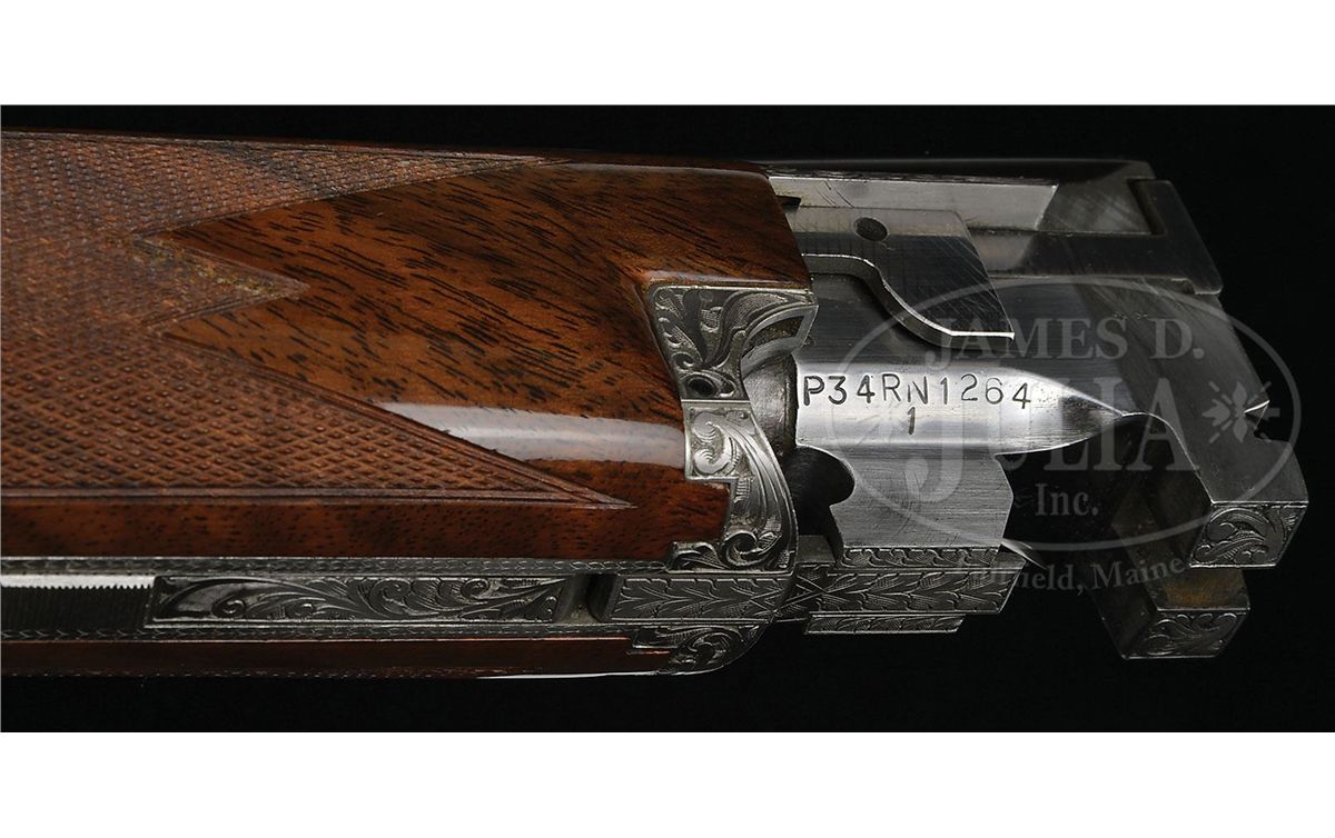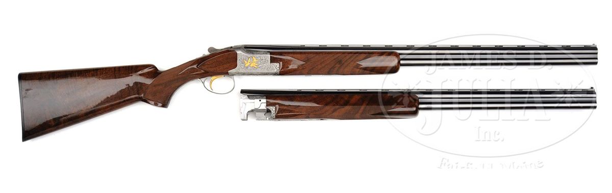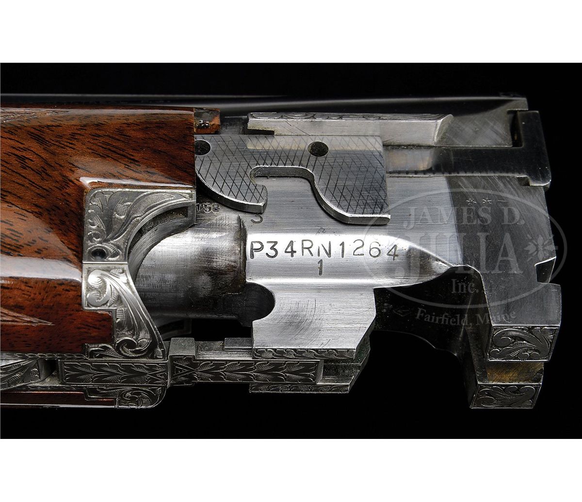 SN P34RN1264. Cal. 20 ga. 3" Chambers. Bbl set "1" has 26-3/8 Skeet choked bbls, and Bbl set no. "2" are 26-3/8" choked IC and Mod. Both have narrow, matted, ventilated ribs, and are marked with Browning Morgan Utah and Montreal PQ addresses, and "Made in Belgium", on left side of top bbl, and with typical Browning gauge and chamber length markings on right side. Coin finished superposed action with single selective trigger, is engraved with very well cut, large, shaded, scrolled acanthus, framing well detailed vignettes of raised gold inlaid game birds, in appropriate backgrounds; trio of pheasants is on left side, trio of mallards on right, and pair of quail on bottom of action. Each scene is by a different engraver. The signature of "R. Capece" is at bottom rear of left hand scene, and that of "C. Perfido" is on right. Beautifully fiddle figured, and nicely contrasting claro walnut long tang, square knob buttstock measures 14-1/2" over Browning composition buttplate. 24 LPI wraparound checkering is at grip. Each bbl set has its own forend with skeet set fitted with large beavertail, and field set with smaller rounded type. Set no. "1": Bore diameter: top -.617, bottom -.620. Bore restrictions: top -.010 (Mod), bottom -.005 (IC). Wall thickness: top-.040, bottom -.040. Drop at heel: 2-1/8", drop at comb: 1-1/2". Weight: 6 lbs. 1 oz. LOP: 14-1/2". Set no. "2": Bore diameter: top -.622, bottom -.620. Bore restrictions: top -.005 (skeet), bottom -.002 (Skeet). Wall thickness: top-.038, bottom -.042. Drop at heel: 2-1/8", drop at comb: 1-1/2". Weight: 6 lbs. 3 oz. LOP: 14-1/2". Dark brown Browning leatherite case with brown faux fur lining, has space for gun and extra bbls, and contains two keys. PROVENANCE: Browning catalog. CONDITION: Excellent, near new, with only a few minor light marks on bbls, mostly from contact with forend. Action retains essentially all of its coin finish. There are slight cartridge halos on breech faces. Stocks have a few slight pings. Mechanically crisp. Case is excellent with a few scuffs on exterior, and slight compressions on interior cloth. 4-48686 MGM90