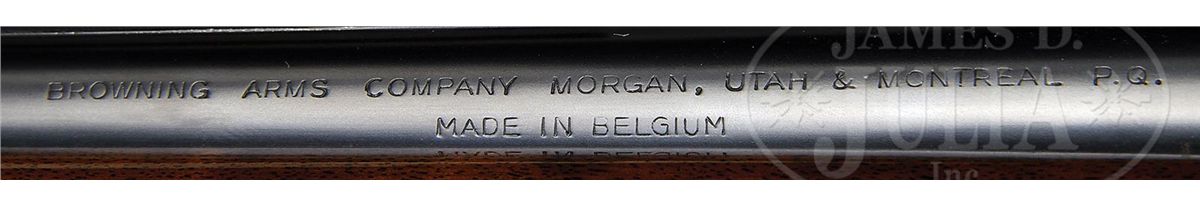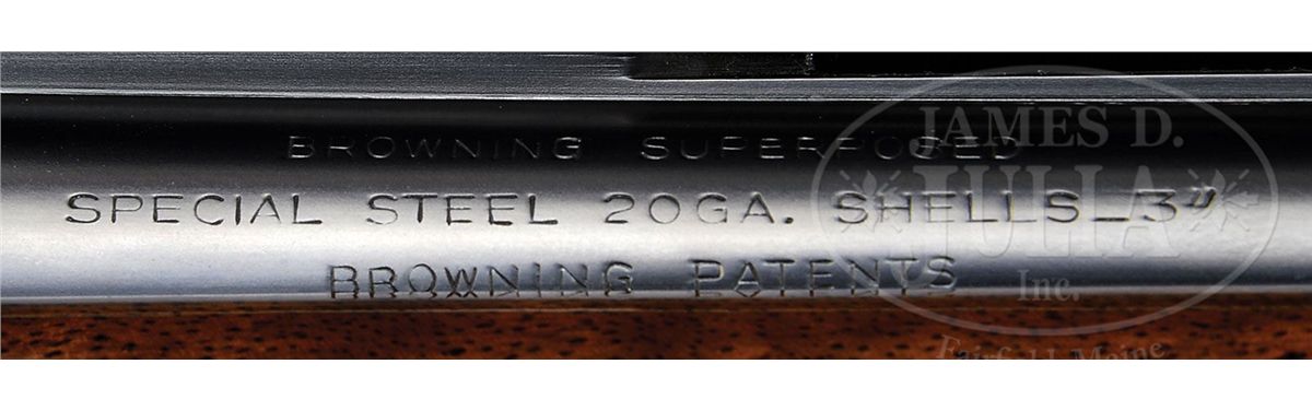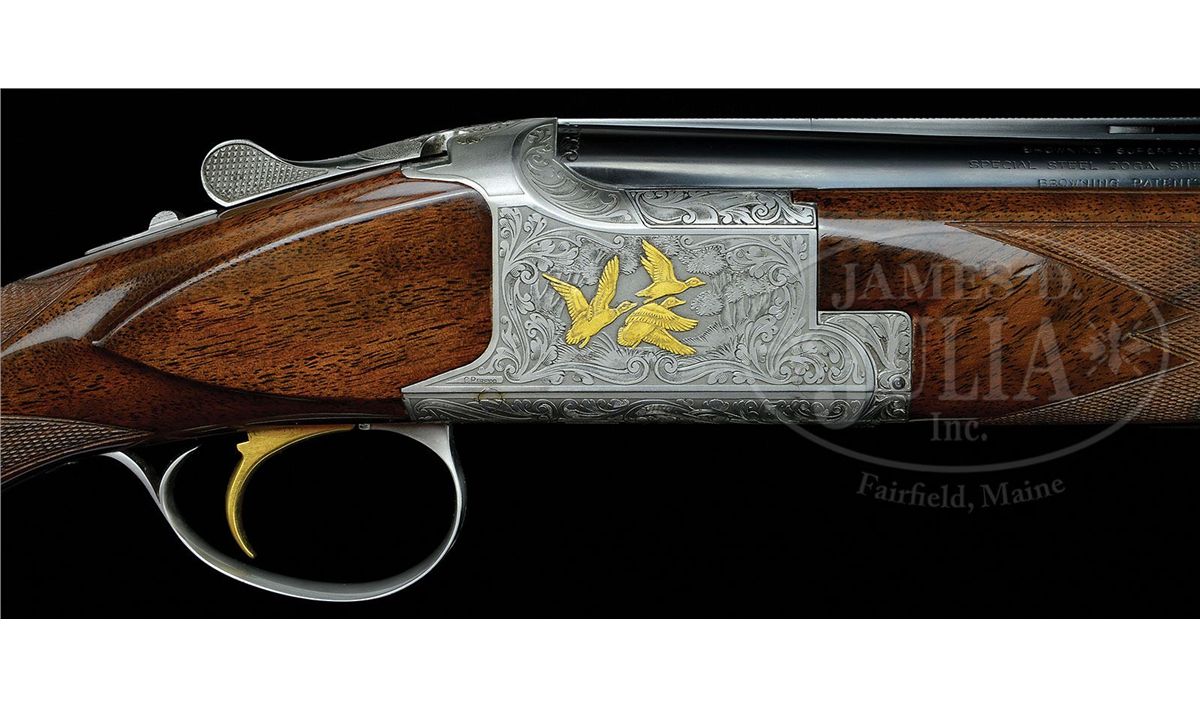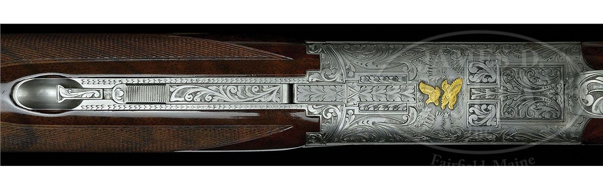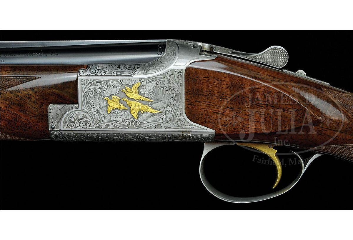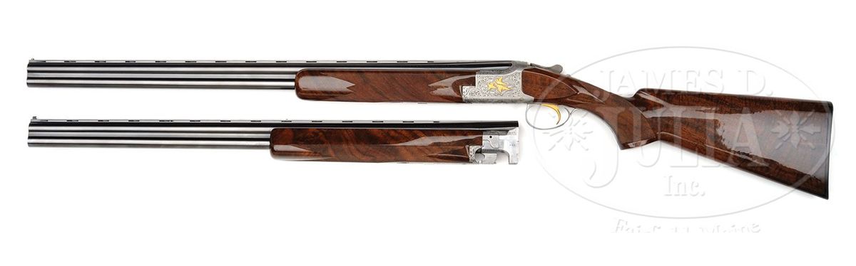 SN P34RN1264. Cal. 20 ga. 3" Chambers. Bbl set "1" has 26-3/8 Skeet choked bbls, and Bbl set no. "2" are 26-3/8" choked IC and Mod. Both have narrow, matted, ventilated ribs, and are marked with Browning Morgan Utah and Montreal PQ addresses, and "Made in Belgium", on left side of top bbl, and with typical Browning gauge and chamber length markings on right side. Coin finished superposed action with single selective trigger, is engraved with very well cut, large, shaded, scrolled acanthus, framing well detailed vignettes of raised gold inlaid game birds, in appropriate backgrounds; trio of pheasants is on left side, trio of mallards on right, and pair of quail on bottom of action. Each scene is by a different engraver. The signature of "R. Capece" is at bottom rear of left hand scene, and that of "C. Perfido" is on right. Beautifully fiddle figured, and nicely contrasting claro walnut long tang, square knob buttstock measures 14-1/2" over Browning composition buttplate. 24 LPI wraparound checkering is at grip. Each bbl set has its own forend with skeet set fitted with large beavertail, and field set with smaller rounded type. Set no. "1": Bore diameter: top -.617, bottom -.620. Bore restrictions: top -.010 (Mod), bottom -.005 (IC). Wall thickness: top-.040, bottom -.040. Drop at heel: 2-1/8", drop at comb: 1-1/2". Weight: 6 lbs. 1 oz. LOP: 14-1/2". Set no. "2": Bore diameter: top -.622, bottom -.620. Bore restrictions: top -.005 (skeet), bottom -.002 (Skeet). Wall thickness: top-.038, bottom -.042. Drop at heel: 2-1/8", drop at comb: 1-1/2". Weight: 6 lbs. 3 oz. LOP: 14-1/2". Dark brown Browning leatherite case with brown faux fur lining, has space for gun and extra bbls, and contains two keys. PROVENANCE: Browning catalog. CONDITION: Excellent, near new, with only a few minor light marks on bbls, mostly from contact with forend. Action retains essentially all of its coin finish. There are slight cartridge halos on breech faces. Stocks have a few slight pings. Mechanically crisp. Case is excellent with a few scuffs on exterior, and slight compressions on interior cloth. 4-48686 MGM90