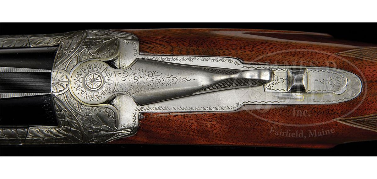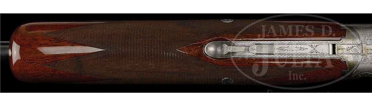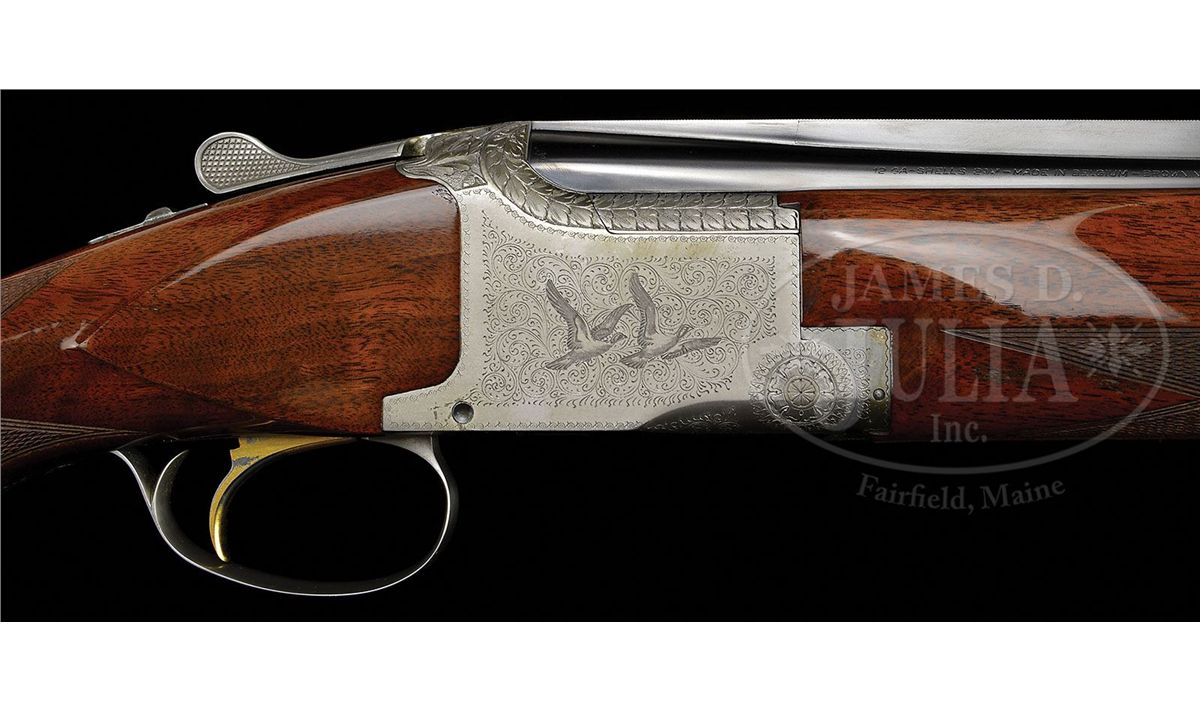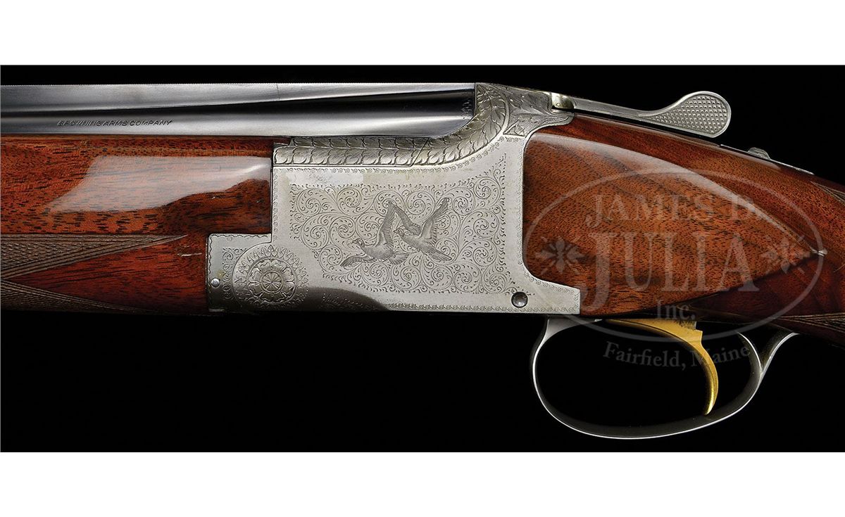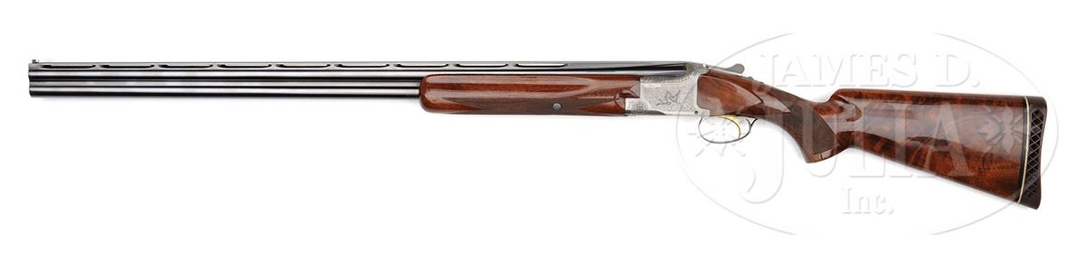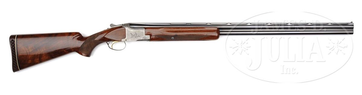 SN 56759S7. Cal. 12 ga. 3" Chambers. 32" Bbls with Broadway ventilated rib are marked full and full, but have been fitted with choke tubes. Bbls are marked "BROWNING ARMS COMPANY" on left side of top bbl, and with chamber information and "MADE IN BELGIUM" on right. Typical coin finished pigeon grade action has carved oak leaves on fence, and usual pairs of pigeons flying through medium scroll on sides. Flame figured American walnut long tang, square knob buttstock measures 14-3/8" over brown Browning open sided white line trap pad. Point pattern checkering is at grip and on small forend with finger grooves. Drop at heel: 1-5/8", drop at comb: 1-5/16". Weight: 8 lbs. 12 oz. LOP: 14-3/8". CONDITION: Excellent, as refinished, most likely by factory, retaining all its renewed finishes on wood and metal, with some slight scratches on bbl from contact with forend, and some light chips under new finish on buttstock, along with a number of minor marks. Trigger retains most of its gold-plating. Bores are excellent, forcing cones lengthened. Action is tight. Mechanically excellent. 4-49050 MGM192