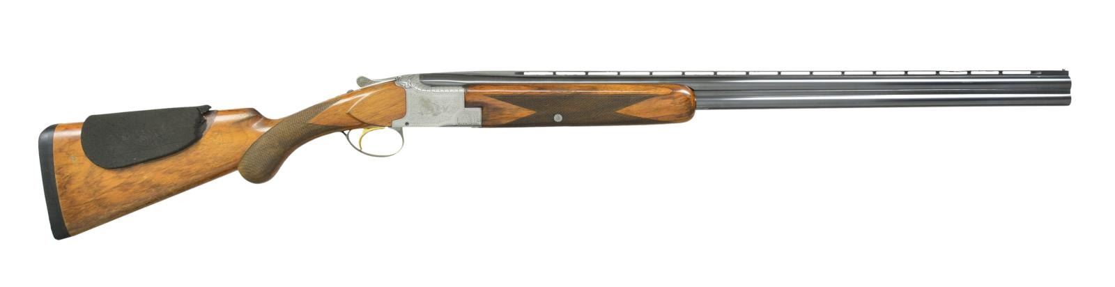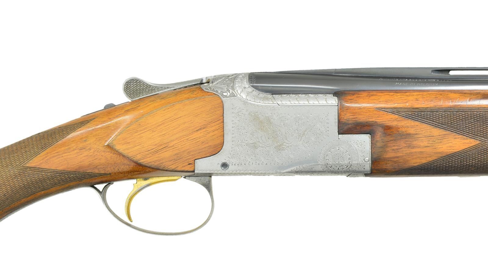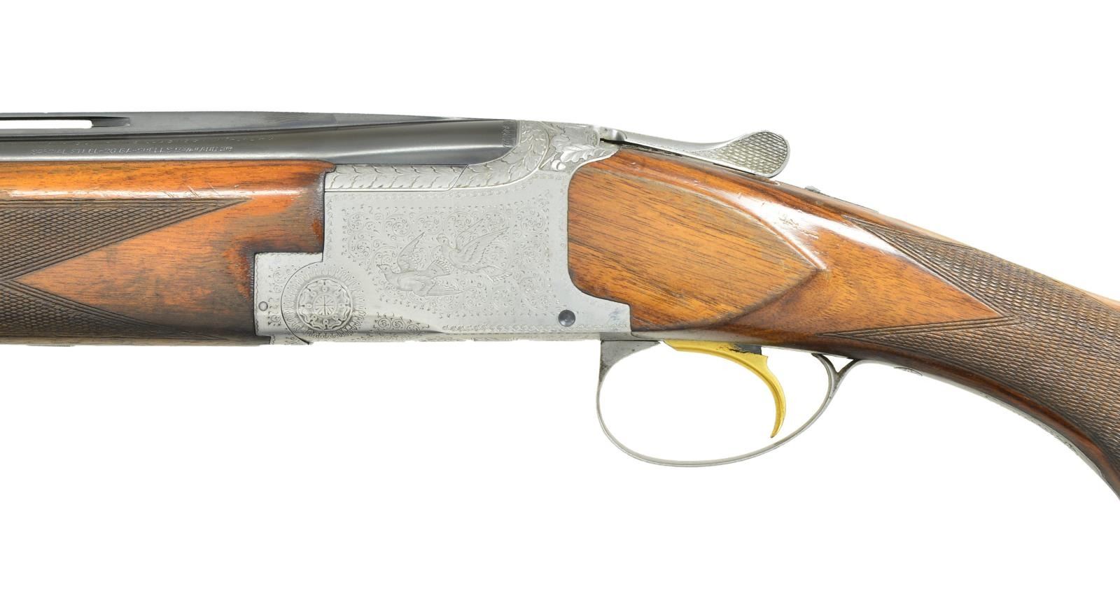 Cal. 20 ga., 2 3/4" and 3". S# 16806. Bbls. 28" vent rib with steel bead. Fixed IC and Mod chokes. Coin finished action with full coverage engraving featuring flying pigeons on receiver sides surrounded by scroll engraving. Floorplate has rose and scroll engraving. Top of action has leaf engraving with sunburst and scroll engraving on top lever. Gold finished SST. Selective ejectors. Lightning forearm and round knob long tang stock of fancy European walnut with hand checkering. LOP: altered to 14" over a solid black Kick-Eez pad. Comb has black foam cheek pad. 1960 Belgian mfg. CONDITION: 90% barrel blue. Action has worn finish fading to gray. There is a minor dent in rib approx. 4 3/4" from muzzle. Wood has worn finish and checkering showing numerous scratches and handling marks. Rubber cheek pad is torn at leading edge. Good bores. (22-2196/DS). CURIO. $1,500-2,250.