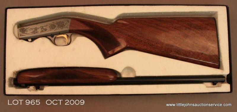 BROWNING Semi- Auto Rifle, # 02154RT246, Grade II, .22 LR, French grayed receiver, 19.25" barrel, figured walnut stock. Rifle is in good condition, stock is missing a 3/4" x 1 1/4" piece from the right lower side at the receiver. Minordiscoloration on the top of the receiver. In it's original box, Japanese made. Est. $250-$500.