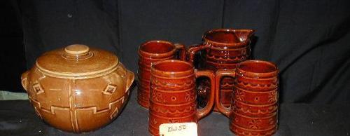 BROWNWARE ULITARIAN LOT INCLUDES (1) MAR-CREST PITCHER 6in W/ (3) 5in TANKARDS, COVERED COOKIE STONEWARE 5 1/2inT 9 1/2inDIA., REDWARE COVERED BAKEWARE 6 1/2in H TO H 3 3/4inT., STERLING OVERLAY POTTERY SUGAR (NO COVER) & CREAMER, 8 PCS. EXCELLENT