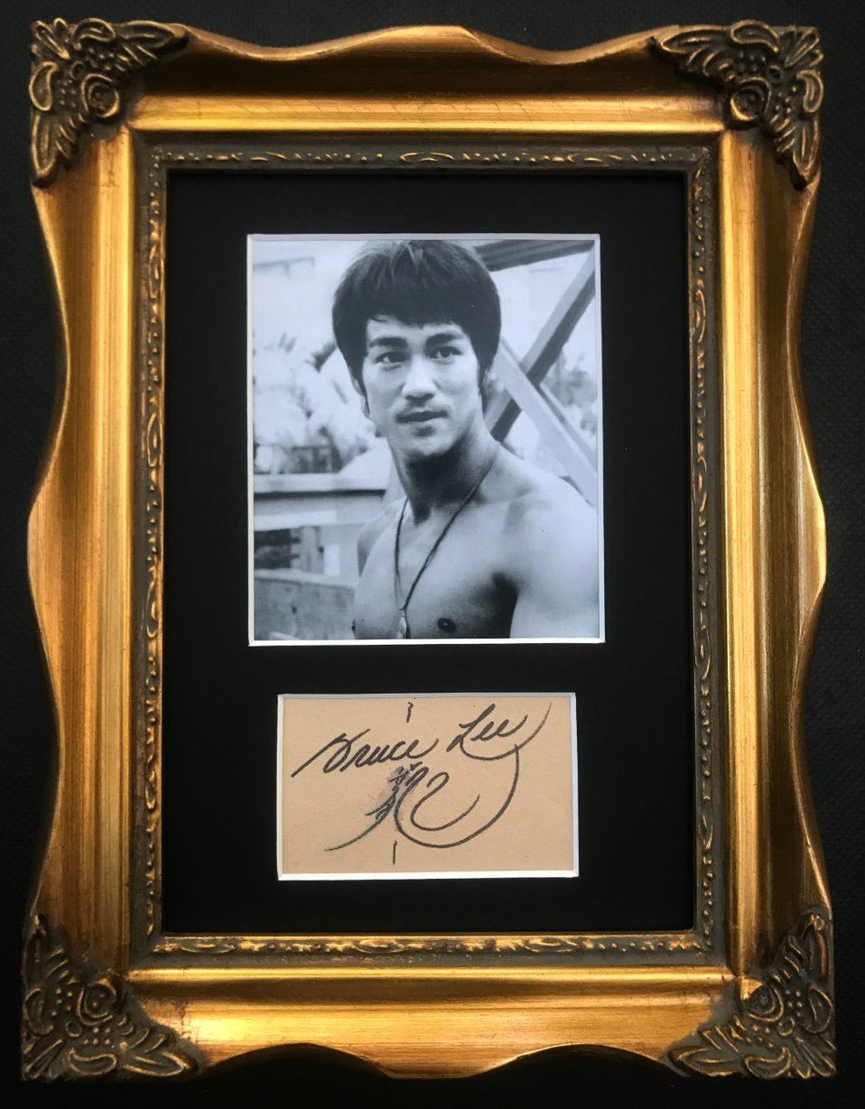 Lee Jun-fan, known professionally as Bruce Lee, was a Hong Kong-American actor, director, martial artist, martial arts instructor, and philosopher. He was the founder of the hybrid martial arts Jeet Kune Do. Lee was the son of Cantonese opera star Lee Hoi-chuen. His autograph is professionally mounted and framed in a gold antique style frame and supplied with coa. Condition is good, with some water damage on the autograph.