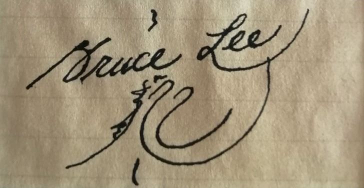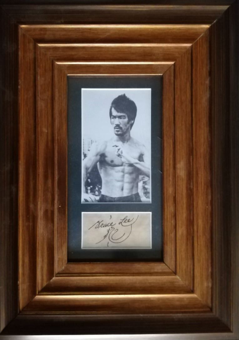 Bruce Lee autograph set among an unusual attractive frame. Supplied with coa.
