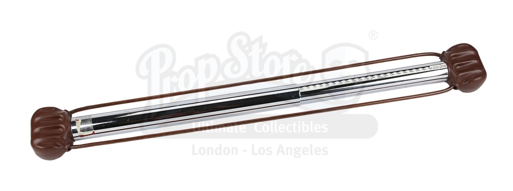 Bruce Lee's personal Bullworker from his office at Golden Harvest. Lee used his Bullworker to maintain his physical fitness while working at the offices in 1972/3, as seen in many photographs. The Bullworker strengthens arm and chest muscles, and is operated by holding the ergonomic brown grips at each end of its metal bar and pressing them towards the middle. A numbered "powermeter" sticker is used to gauge progress. This piece was exhibited at a 2014 SENI show at the London Soccerdome, alongside many other pieces of Lee memorabilia. There are some scratches and scuffs from use and one of the stickers at the end partially remains. The item comes with a letter of authenticity signed by Lee's close friend and student Taky Kimura, who came into possession of it after his passing and kept it for 40 years. It also comes with a copy of "The Bruce Lee Story", which features the Bullworker in the background of a picture of Lee. Dimensions: 87 cm x 6 cm x 10 cm (34 1/4" x 4" x 2 1/4")