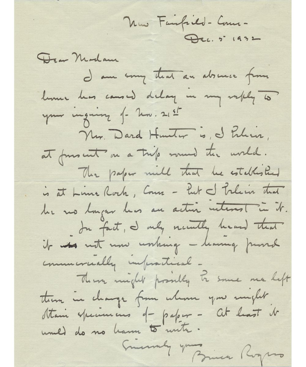 (1870 - 1957) American typographer and type designer, acclaimed by some as among the greatest book designers of the twentieth century. Rogers was known for his "classical" style of design. A.L.S. 1p. 8vo., New Fairfield, Dec. 5, 1932. Rogers discusses a paper mill in Lime Rock, Ct. established by David Hunter and advises that Hunter may no longer have an interest in it as it had become "commercially impractical". He adds: "There might possibly be some one left there in charge from whom you might obtain specimens of paper...". Very good.