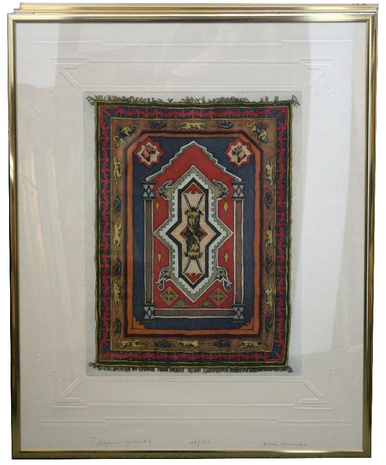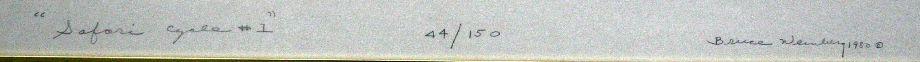 Framed 30x37 inches. Plate size 18x24 inches. Multi-plate color etching with embossed border by Bruce Weinberg (American, 1942-1994) entitled "Safari Cycle #1". Piece is signed signed, dated and numbered in pencil on bottom center. Piece is one of a four part series. Very good condition.