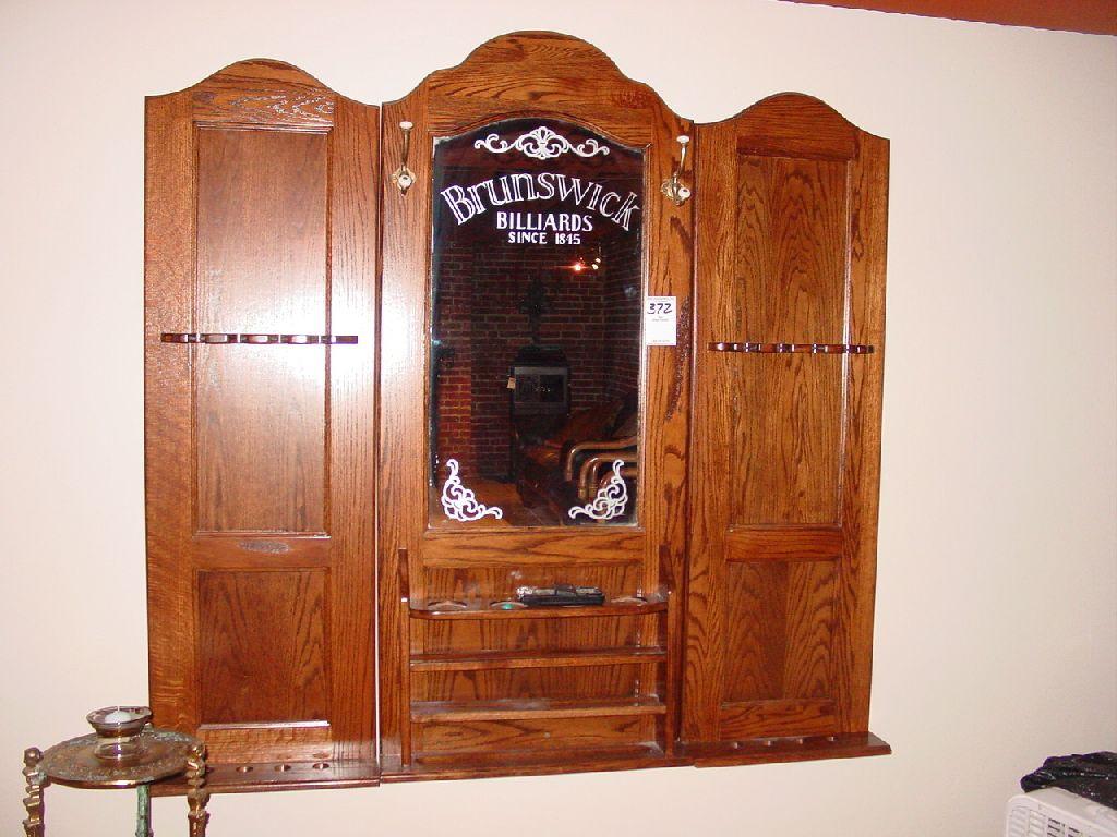 BRUNSWICK WALL HANGING WOODEN POOL CUE RACK WITH MIRRORS AND COAT HOOKS