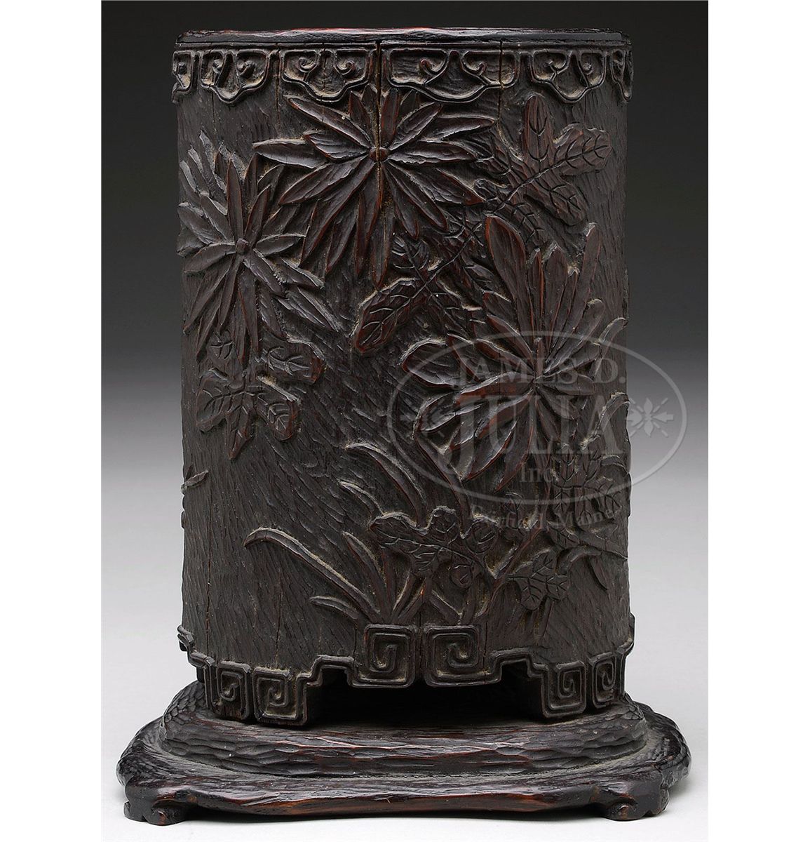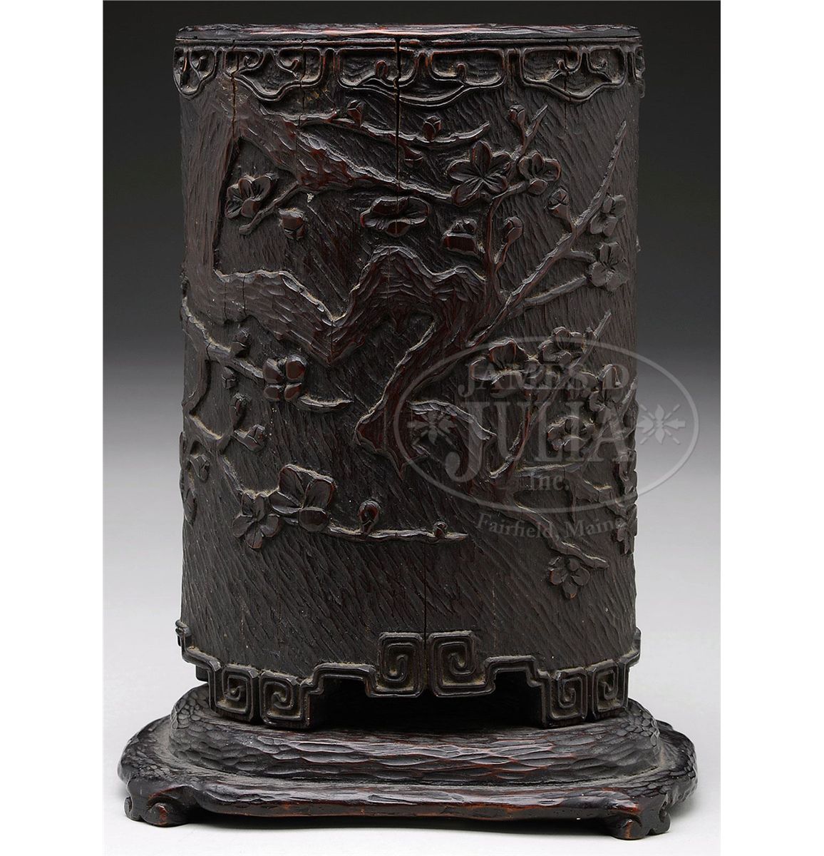 19th century, Japan. Bamboo carved in relief with flowering trees o a textured ground with archaic borders. Carved rosewood base. SIZE: 6" w x 9" h. CONDITION: Cracks, otherwise very good. 7-74545