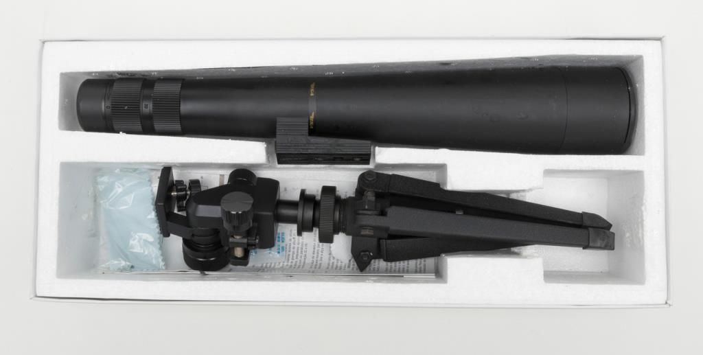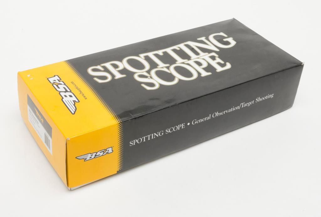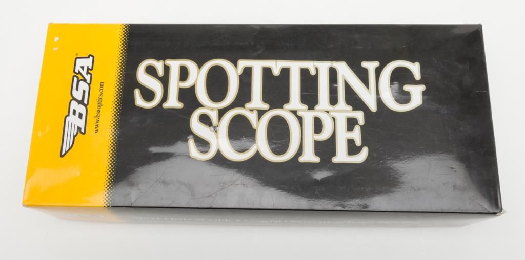 BSA Deerhunter Model 20-60 x 60 MM Spotting Scope with tripod in box with instructions (CAUTION: FINISH ON SCOPE BODY IS DEGRADED AND STICKY TO TOUCH; NOT EASILY CLEANED FROM SKIN; BUYER WILL NEED TO STABILIZE FINISH BEFORE USE OF SCOPE INFIELD). Accompanied by factory box and instructions. Est.: $50-$75.