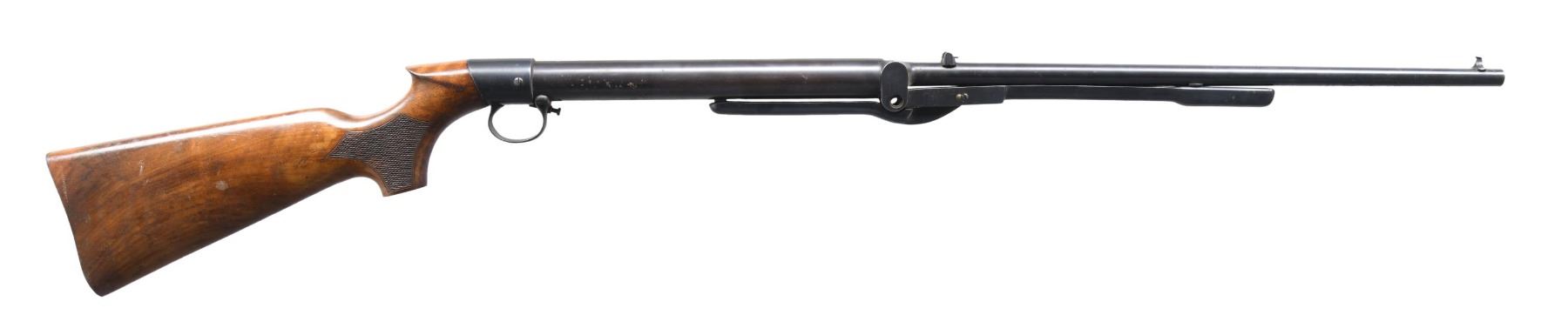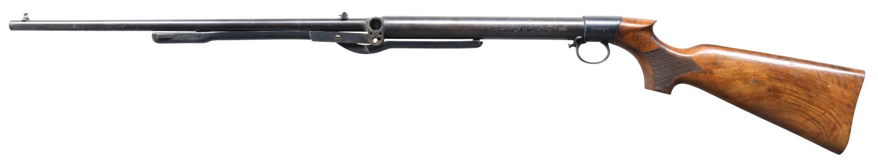 Cal. .22. S# 50914. Barrel 19.5". Walnut checkered buttstock. CONDITION: Missing parts include lever hinge pin, buttplate, trigger & internal spring. Metal has good blue with spots of oxidation. Fair wood finish with marks. (02-23781/MD). $100-200.