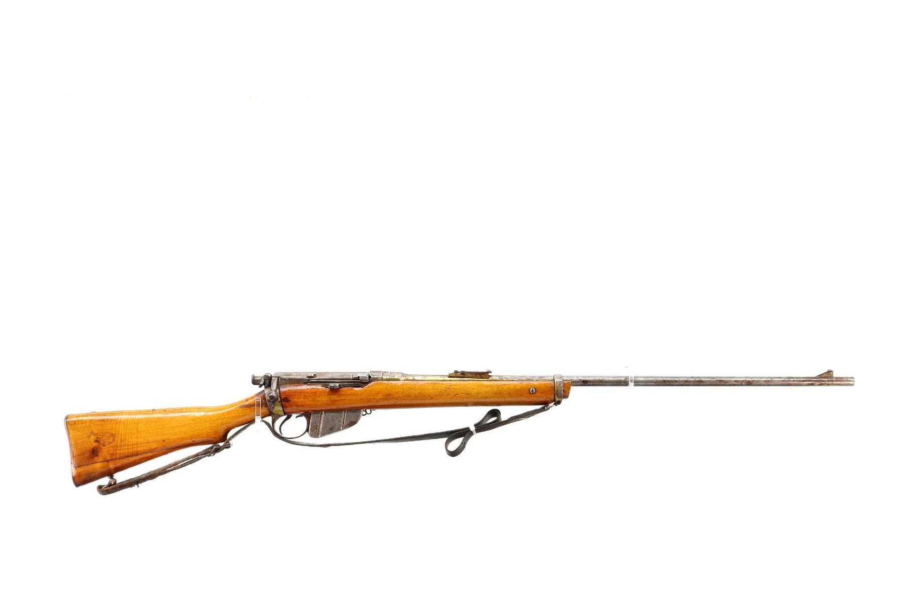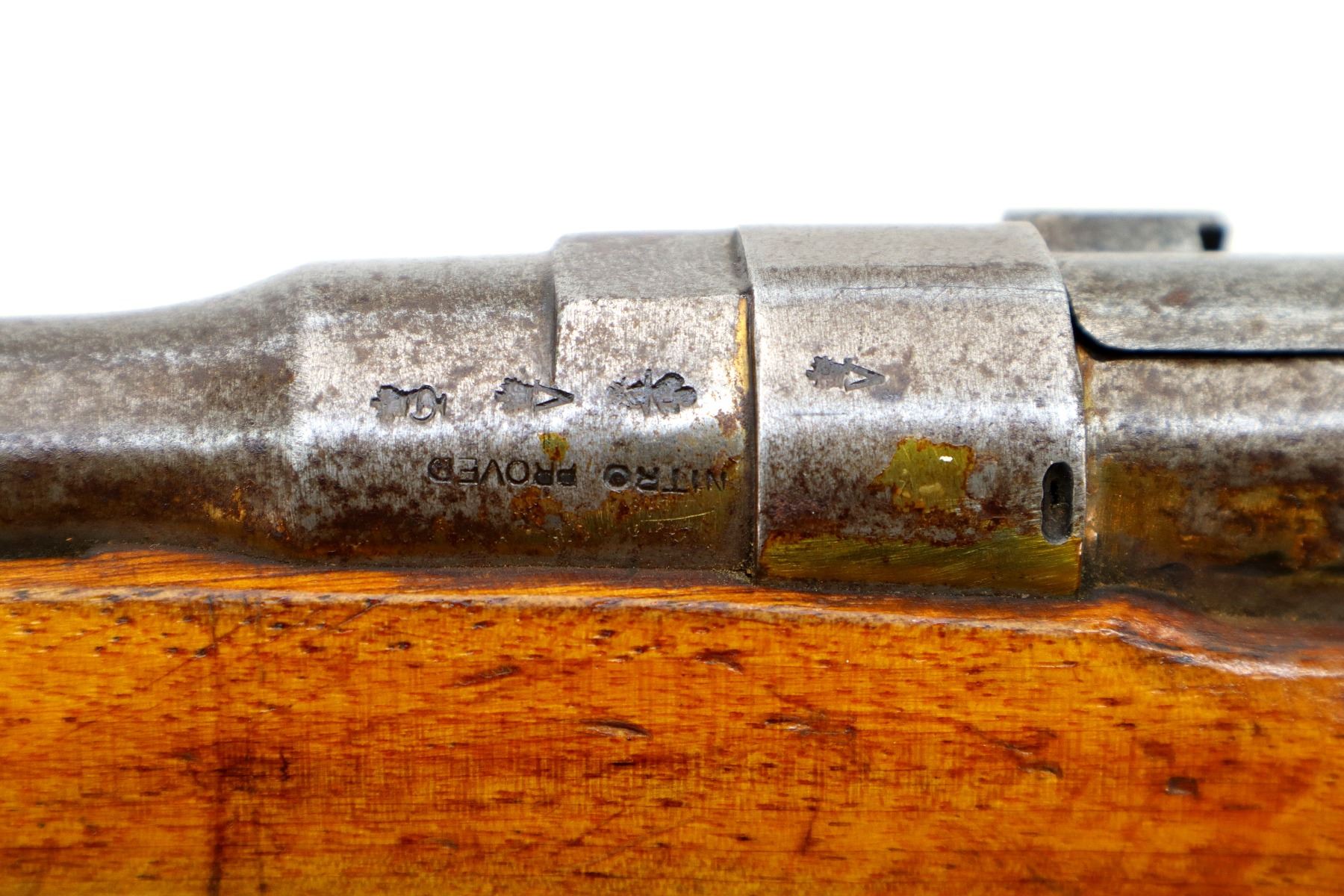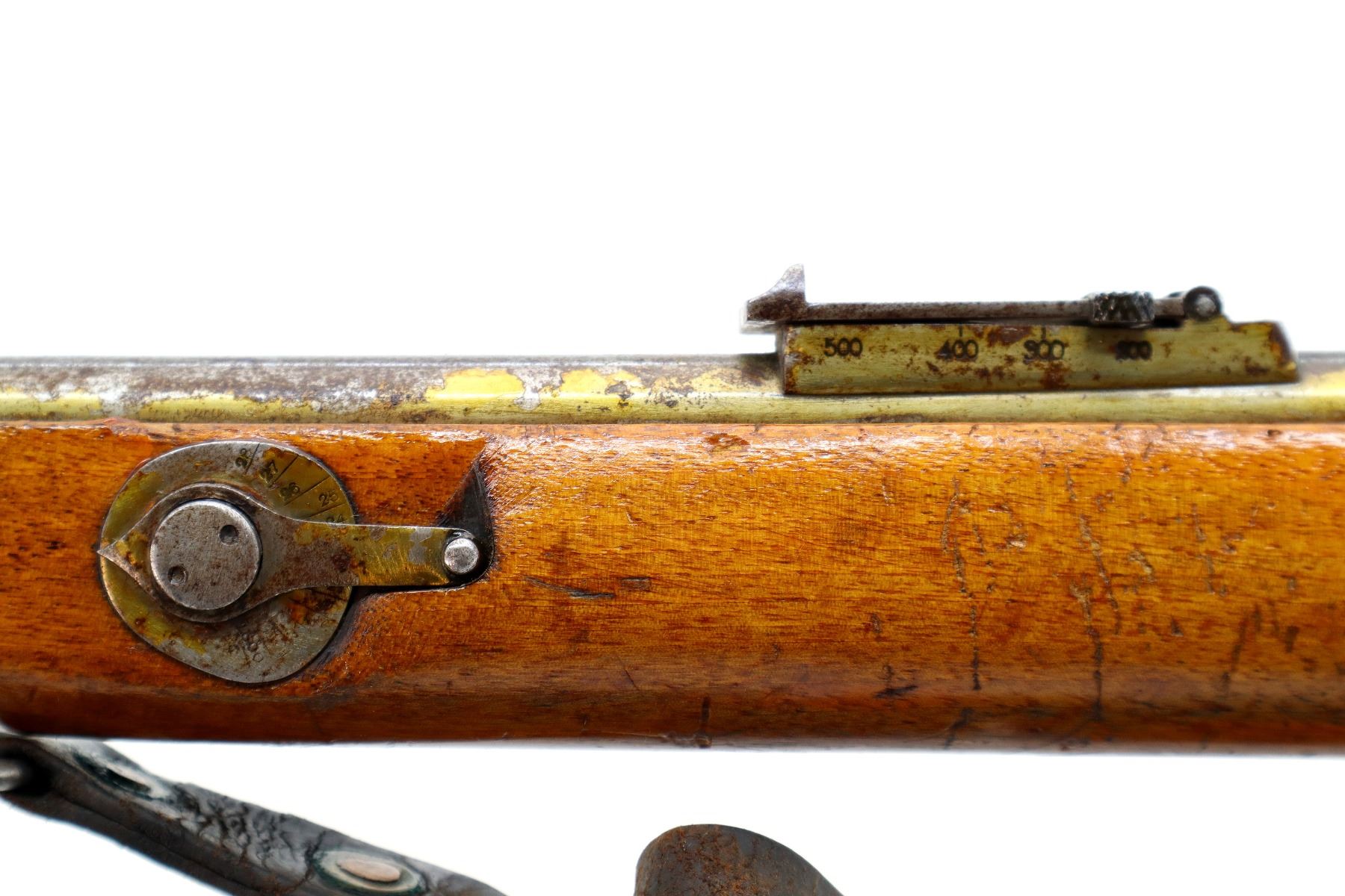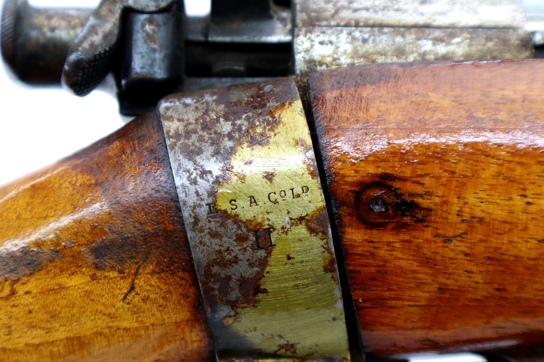 Main Description: Manufactured by BSA, Bolt Matches. Blade front sight with ramp, adjustable u notched ladder rear sight, magazine cut off, bolt has dust cover and safety on cocking piece, retains front and rear volley sights. Two piece sporterized wood stocks cracked on left side, pistol grip, smooth brass butt plate with trap, tang marked R3689, faint roundel on right of stock, sling swivels with brown leather sling