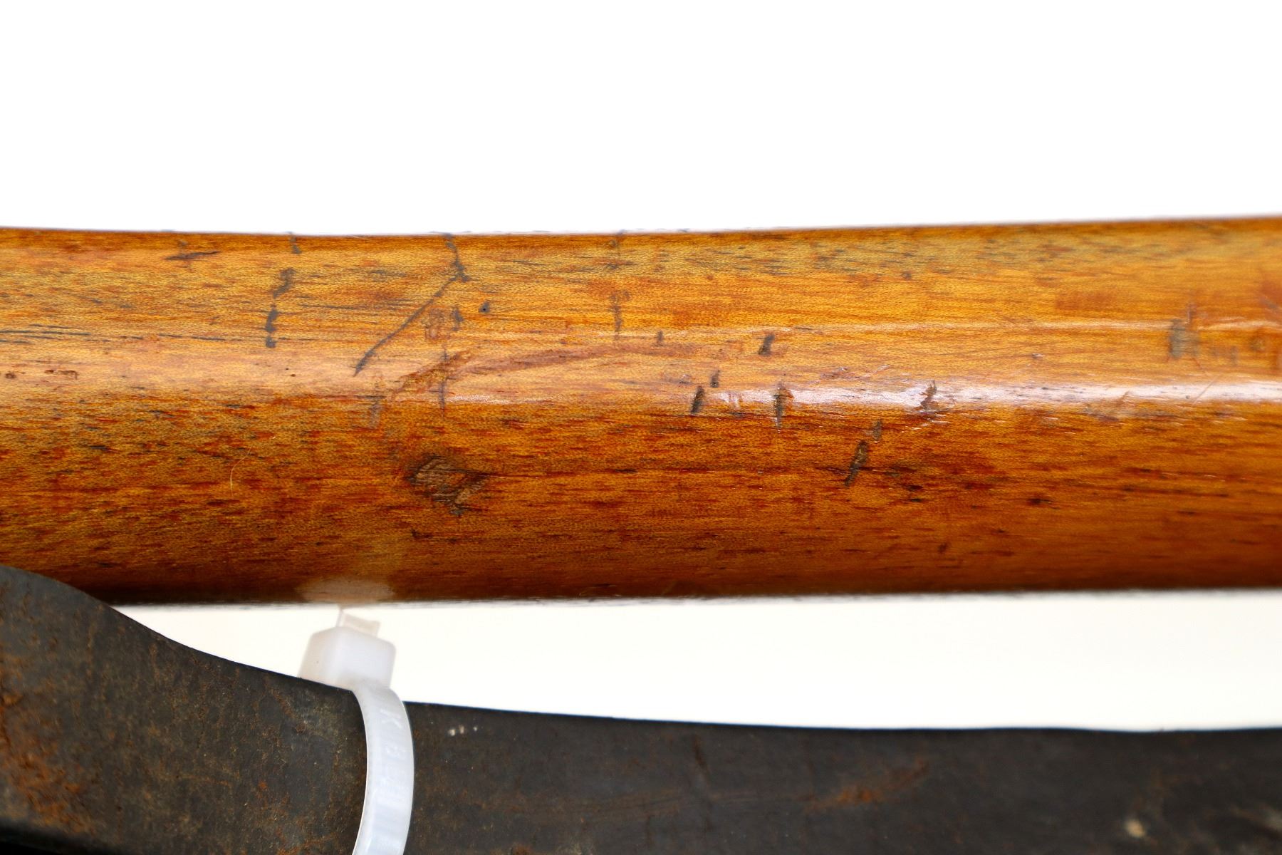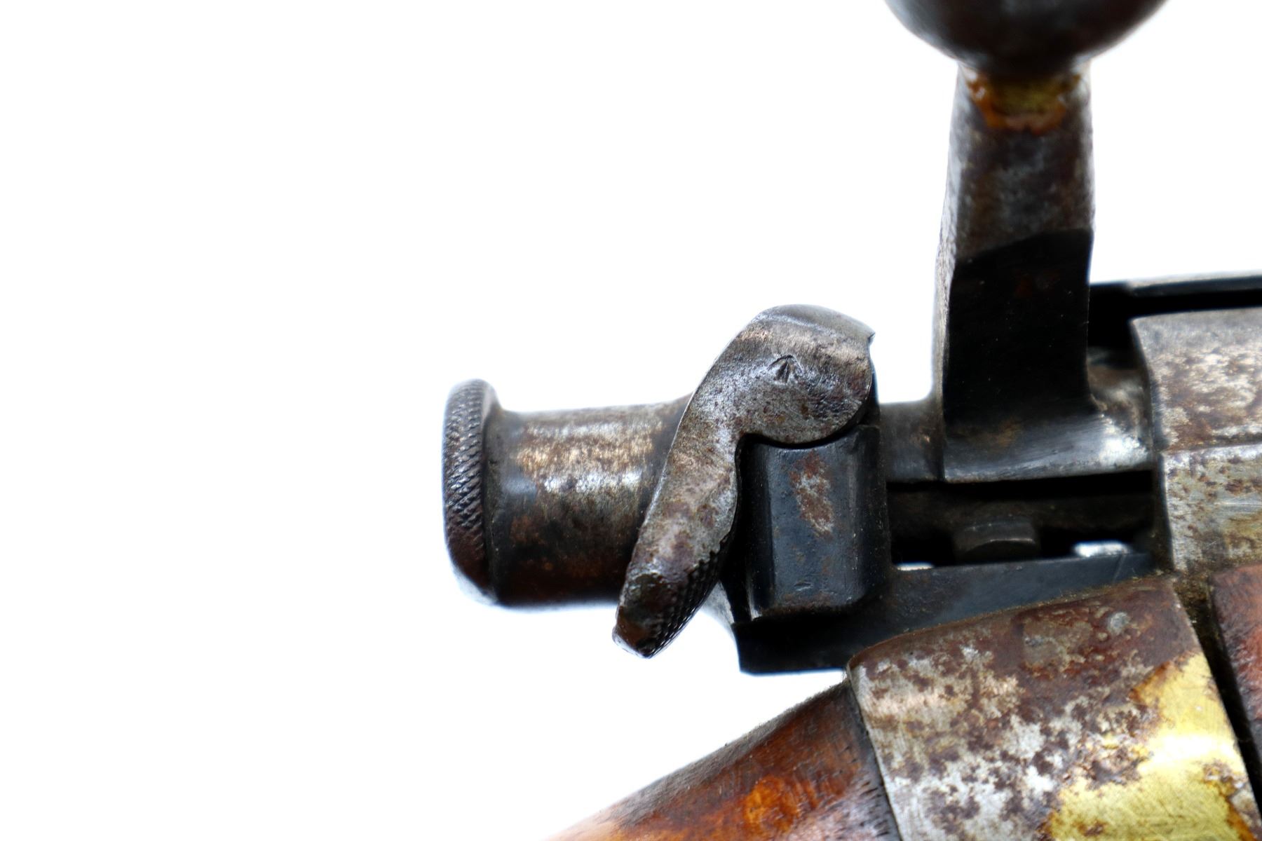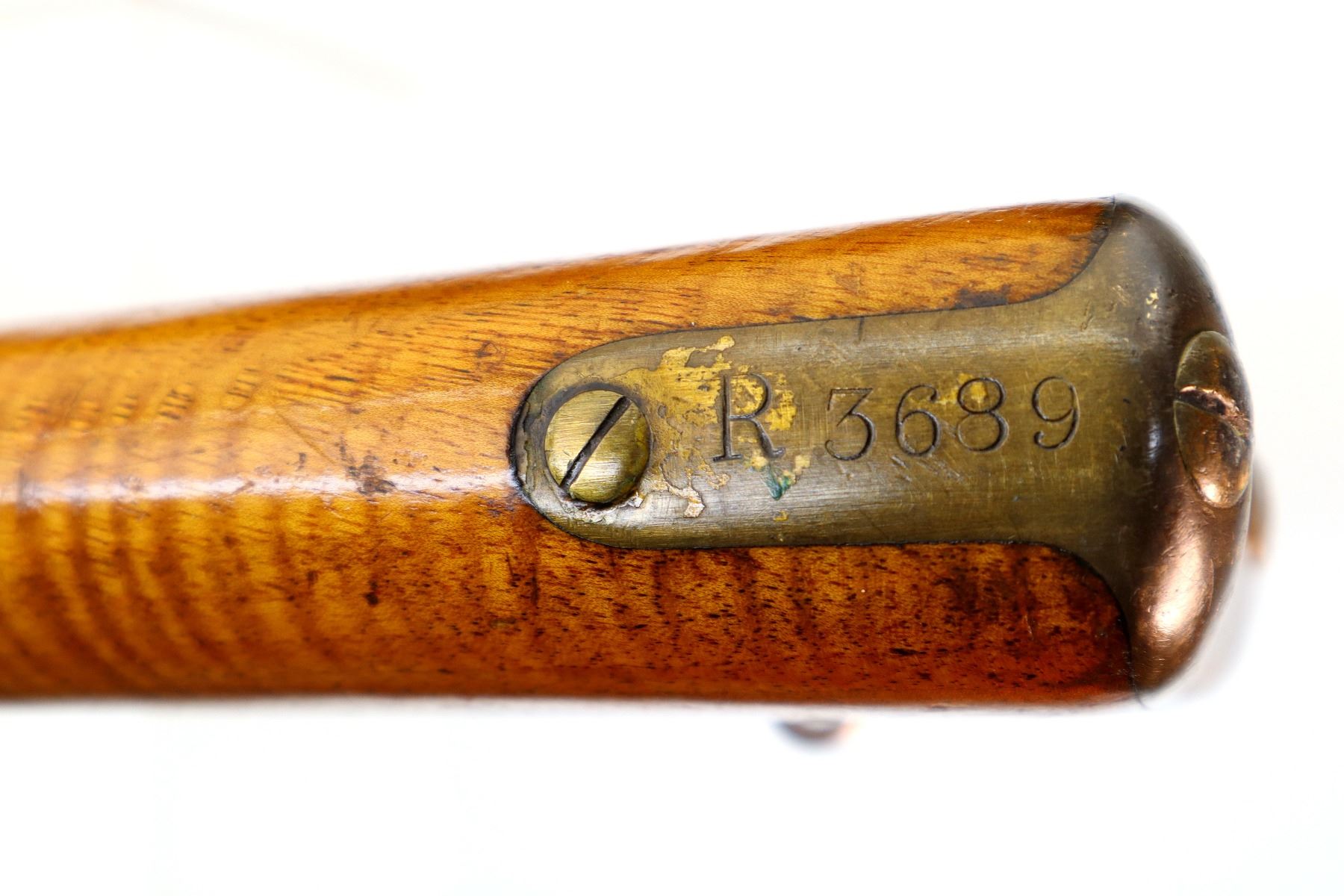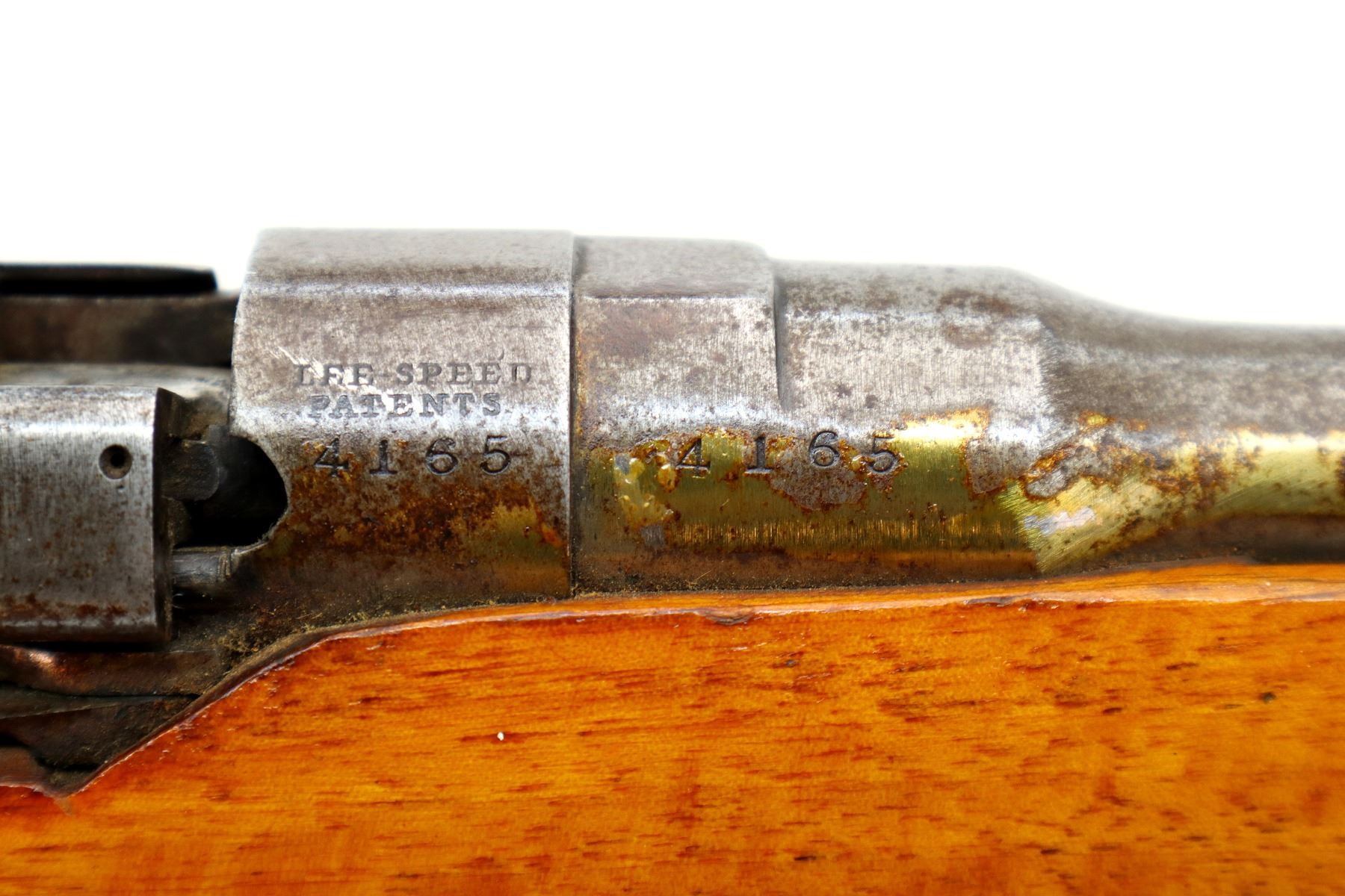 Main Description: Manufactured by BSA, Bolt Matches. Blade front sight with ramp, adjustable u notched ladder rear sight, magazine cut off, bolt has dust cover and safety on cocking piece, retains front and rear volley sights. Two piece sporterized wood stocks cracked on left side, pistol grip, smooth brass butt plate with trap, tang marked R3689, faint roundel on right of stock, sling swivels with brown leather sling