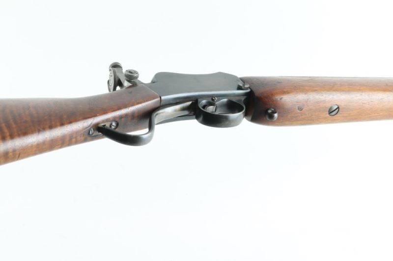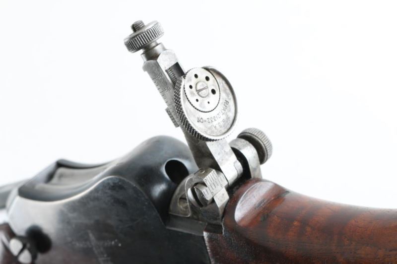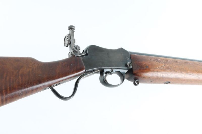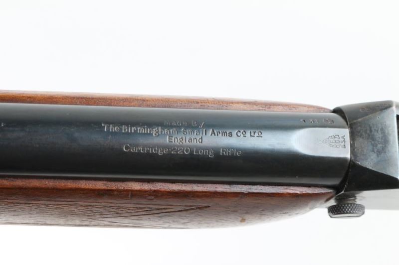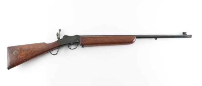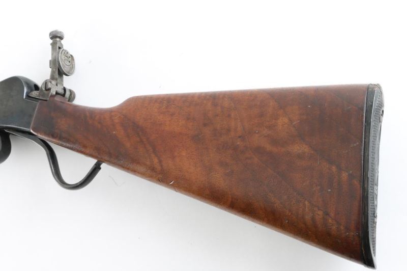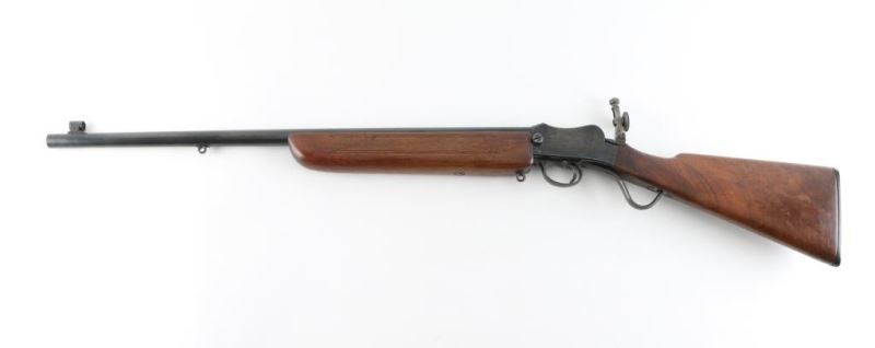 British made single shot rifle with lever operated tilting block action. Appears to be re-chambered for 22 Hornet, using original barrel marked for 22 rimfire. Features blued finish, checkered wood forend, straight gripped wood shoulder stock, flat plastic buttplate, 25" tapered heavy barrel, globe front sight, folding adjustable rear peep sight, cocking indicator, sling eyelets, brass unit disc in butt. Missing cocking indicator. Bore appears very good. Retains 85% reblued finish, with areas of shallow pitting on receiver, discoloration and some mottled appearance. Some erosion of letters. Wood is good condition, creased & dented. Condition is NRA Good++ (Needs gunsmith attention to verify chambering, and mark barrel appropriately) *** C&R Firearm ***