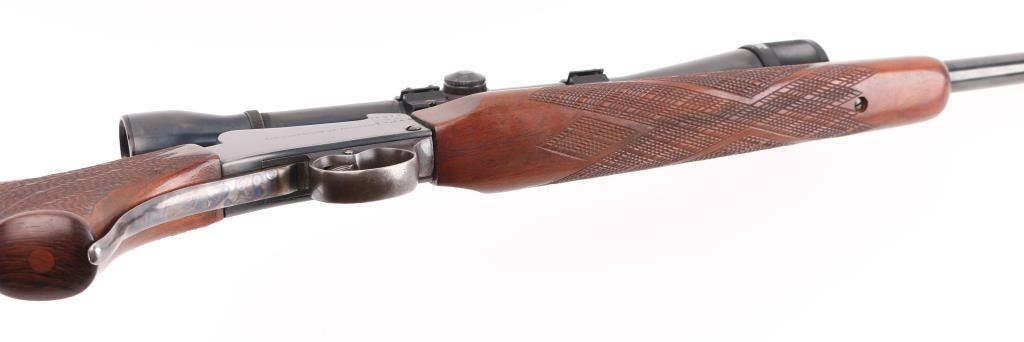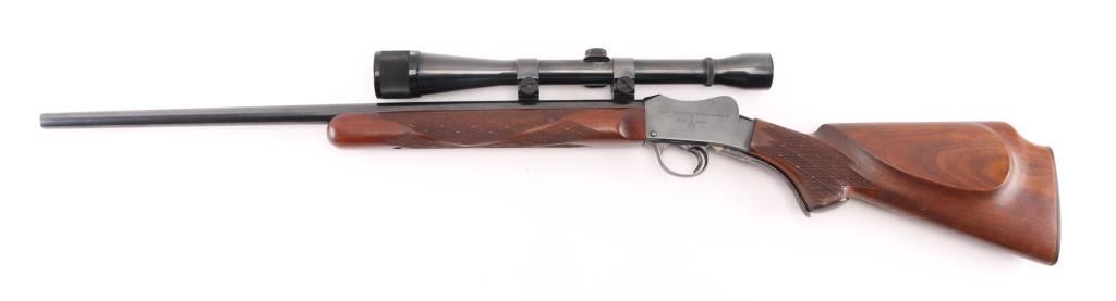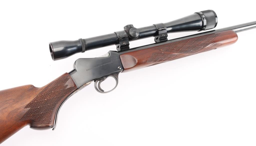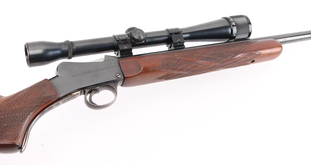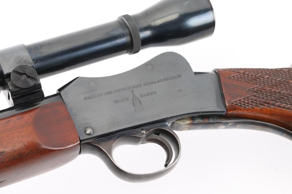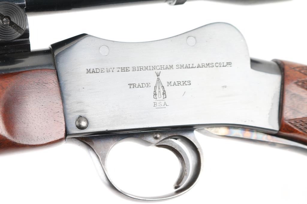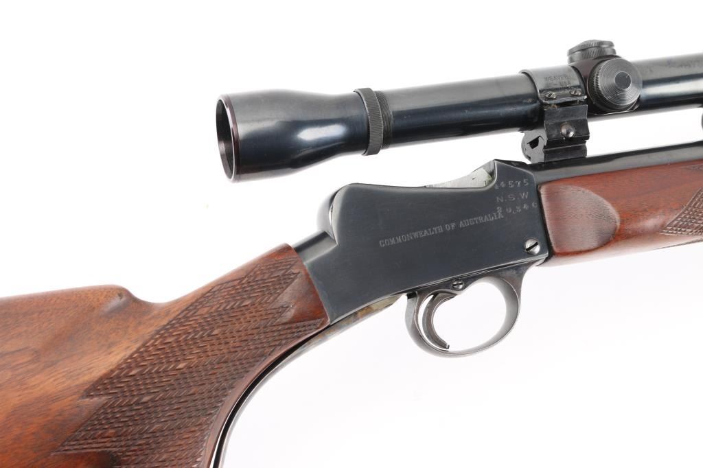 Custom target rifle built on a BSA Australian cadet rifle receiver. Re-barreled with a 24" round barrel chambered in .17 Mashburn Bee. Re-finished blue receiver, barrel, and case-hardened lever & triggerguard. BSA, and Commonwealth of Australia markings intact. Wrap around checkering on the forearm and wrist, contrasting wood grip cap, left mounted cheek piece. Mounted with a vintage Weaver K10-C3 scope with Weaver rings, clear optics. Falling block action is smooth, bore is excellent/bright, wood is excellent, and the metal finish is excellent. Comes with approx. 50 brass cases for reloading. NRA Condition-Excellent. C&R Firearm.